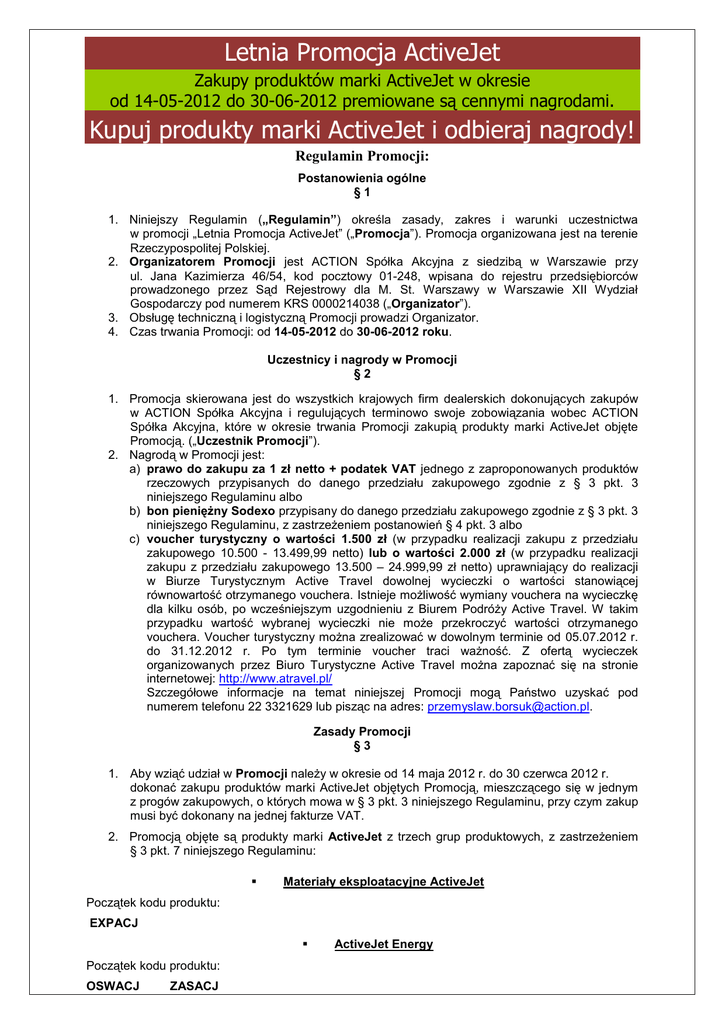 Letnia Promocja ActiveJet Zakupy produktów marki ActiveJet w okresie od 14-05-2012 do 30-06-2012 premiowane są cennymi nagrodami. Kupuj produkty marki ActiveJet i odbieraj nagrody! Regulamin Promocji: Postanowienia ogólne §1 1. Niniejszy Regulamin („Regulamin”) określa zasady, zakres i warunki uczestnictwa w promocji „Letnia Promocja ActiveJet” („Promocja”). Promocja organizowana jest na terenie Rzeczypospolitej Polskiej. 2. Organizatorem Promocji jest ACTION Spółka Akcyjna z siedzibą w Warszawie przy ul. Jana Kazimierza 46/54, kod pocztowy 01-248, wpisana do rejestru przedsiębiorców prowadzonego przez Sąd Rejestrowy dla M. St. Warszawy w Warszawie XII Wydział Gospodarczy pod numerem KRS 0000214038 („Organizator”). 3. Obsługę techniczną i logistyczną Promocji prowadzi Organizator. 4. Czas trwania Promocji: od 14-05-2012 do 30-06-2012 roku. Uczestnicy i nagrody w Promocji §2 1. Promocja skierowana jest do wszystkich krajowych firm dealerskich dokonujących zakupów w ACTION Spółka Akcyjna i regulujących terminowo swoje zobowiązania wobec ACTION Spółka Akcyjna, które w okresie trwania Promocji zakupią produkty marki ActiveJet objęte Promocją. („Uczestnik Promocji”). 2. Nagrodą w Promocji jest: a) prawo do zakupu za 1 zł netto + podatek VAT jednego z zaproponowanych produktów rzeczowych przypisanych do danego przedziału zakupowego zgodnie z § 3 pkt. 3 niniejszego Regulaminu albo b) bon pieniężny Sodexo przypisany do danego przedziału zakupowego zgodnie z § 3 pkt. 3 niniejszego Regulaminu, z zastrzeżeniem postanowień § 4 pkt. 3 albo c) voucher turystyczny o wartości 1.500 zł (w przypadku realizacji zakupu z przedziału zakupowego 10.500 - 13.499,99 netto) lub o wartości 2.000 zł (w przypadku realizacji zakupu z przedziału zakupowego 13.500 – 24.999,99 zł netto) uprawniający do realizacji w Biurze Turystycznym Active Travel dowolnej wycieczki o wartości stanowiącej równowartość otrzymanego vouchera. Istnieje możliwość wymiany vouchera na wycieczkę dla kilku osób, po wcześniejszym uzgodnieniu z Biurem Podróży Active Travel. W takim przypadku wartość wybranej wycieczki nie może przekroczyć wartości otrzymanego vouchera. Voucher turystyczny można zrealizować w dowolnym terminie od 05.07.2012 r. do 31.12.2012 r. Po tym terminie voucher traci ważność. Z ofertą wycieczek organizowanych przez Biuro Turystyczne Active Travel można zapoznać się na stronie internetowej: http://www.atravel.pl/ Szczegółowe informacje na temat niniejszej Promocji mogą Państwo uzyskać pod numerem telefonu 22 3321629 lub pisząc na adres: [email protected]. Zasady Promocji §3 1. Aby wziąć udział w Promocji należy w okresie od 14 maja 2012 r. do 30 czerwca 2012 r. dokonać zakupu produktów marki ActiveJet objętych Promocją, mieszczącego się w jednym z progów zakupowych, o których mowa w § 3 pkt. 3 niniejszego Regulaminu, przy czym zakup musi być dokonany na jednej fakturze VAT. 2. Promocją objęte są produkty marki ActiveJet z trzech grup produktowych, z zastrzeżeniem § 3 pkt. 7 niniejszego Regulaminu: Materiały eksploatacyjne ActiveJet Początek kodu produktu: EXPACJ Początek kodu produktu: OSWACJ ZASACJ ActiveJet Energy Akcesoria ActiveJet Początek kodu produktu: ARMACJ EXPACJACZ PERACJ URPACJ 3. Progi zakupowe, których realizacja uprawnia do udziału w Promocji podane są w wartościach netto w złotych polskich. Przy zamówieniu promocyjnym w każdym przedziale zakupowym do wyboru jest jedna z zaproponowanych nagród, zgodnie z poniższą tabelą: NAGRODA DO WYBORU: MASZYNKA DO STRZYŻENIA PHILIPS QC 5115/15 ALBO TELEFON SAMSUNG E1080 ALBO BON SODEXO O WARTOŚCI 50 PLN SOKOWIRÓWKA ZELMER JULITA 377 GRAFIT/SYMBIO ALBO GRILL ENDERS DALLAS 1392 ALBO BON SODEXO O WARTOŚCI 80 PLN NAWIGACJA GOCLEVER NAVIO 500 PL ALBO RADIOODTWARZACZ PHILIPS AZ1137/12 ALBO BON SODEXO O WARTOŚCI 140 PLN MONITOR LG LCD 19" W1946S-BF ALBO DYSK TOSHIBA HDD STOR.E CANVIO 500GB 2,5" USB 3.0 ALBO BON SODEXO O WARTOŚCI 200 PLN URZĄDZENIE HP LASERJET M1132 MFP + TONER ACTIVEJET ATH-85N ALBO KOSIARKA ELEKTRYCZNA GARDENA POWERMAX 36 E 4037-20 ALBO BON SODEXO O WARTOŚCI 330 PLN ROWER MERIDA ATB DRAKAR SPEED 5-V LUB 5-V LADY ALBO ROWER DZIECIĘCY MERIDA DAKAR 624-V ALBO KONSOLA XBOX 360 S 4GB ALBO BON SODEXO O WARTOŚCI 480 PLN NETBOOK ASUS 1015BX-RED071S C50 1GB 10,1 320 HD6250 W7S RED ALBO MYJKA CIŚNIENIOWA KARCHER K 5.600 + T 200 ALBO KONSOLA PS3 SLIM 320GB ALBO BON SODEXO O WARTOŚCI 660 PLN ROWER KELLYS SEASON LUB KELLYS COACH LUB FLASH ALBO ROWER MERIDA FREEWAY 9100 LUB FREEWAY 9100 LADY ALBO TV 37" LCD LG 37LK430 ALBO BON SODEXO O WARTOŚCI 850 PLN KLIMATYZATOR PRZENOŚNY WHIRLPOOL AMD092 3,5 KW ALBO APARAT SONY DSC-HX200V ALBO NOTEBOOK LENOVO IDEAPAD G570 B960 4GB 15,6" LED HD 500 INT W7H ALBO BON SODEXO O WARTOŚCI 1050 PLN SAMSUNG GALAXY NOTE N7000 BLUE ALBO TV 32" LCD SAMSUNG UE32ES6100 LED 3D ALBO VOUCHER TURYSTYCZNY ACTIVE TRAVEL WARTOŚCI 1500 PLN ALBO BON SODEXO O WARTOŚCI 1400 PLN IPHONE 4S 32GB BLACK EU ALBO VOUCHER TURYSTYCZNY ACTIVE TRAVEL WARTOŚCI 2000 PLN ALBO WYBRANY PRODUKT Z OFERTY ACTION W CENIE DO 2400 PLN NETTO ALBO BON SODEXO O WARTOŚCI 2000 PLN NOTEBOOK ASUS G53SX-S1163V i7-2670QM 6GB 15,6 750 GTX560M W7HP ALBO WYBRANY PRODUKT Z OFERTY ACTION W CENIE DO 4500 PLN NETTO ALBO BON SODEXO O WARTOŚCI 4000 PLN KOSIARKA TRAKTOROWA HECHT 5175 ALBO WYBRANY PRODUKT Z OFERTY ACTION W CENIE DO 6300 PLN NETTO ALBO BON SODEXO O WARTOŚCI 5800 PLN ZAKUP Z PRZEDZIAŁU (PLN NETTO) 700 999,99 1 000 1 499,99 1 500 1 999,99 2 000 3 299,99 3 300 4 699,99 4 700 5 799,99 5 800 6 999,99 7 000 8 499,99 8 500 10 499,99 10 500 13 499,99 13 500 24 999,99 25 000 34 999,99 35 000 …. 4. Jeśli suma zamówienia promocyjnego przekracza wartość 8 000 zł netto, po ustaleniu z Handlowcem lub Regionalnym Doradcą Handlowym możliwe jest zrealizowanie go na maksymalnie 3 fakturach VAT. Maksymalny czas realizacji dzielonych zamówie