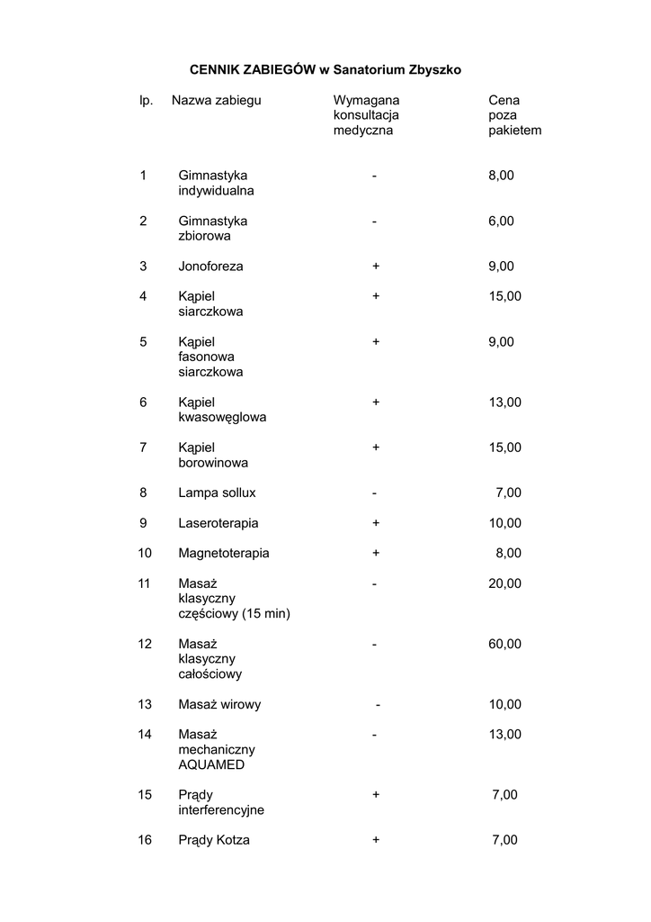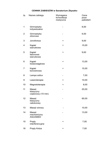 CENNIK ZABIEGÓW w Sanatorium Zbyszko lp. Nazwa zabiegu