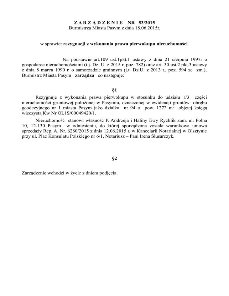 Z A R Z Ą D Z E N I E NR 53/2015 Burmistrza Miasta Pasym z dnia 18.06.2015r. w sprawie: rezygnacji z wykonania prawa pierwokupu nieruchomości. Na podstawie art.109 ust.1pkt.1 ustawy z dnia 21 sierpnia 1997r o gospodarce nieruchomościami (t.j. Dz. U. z 2015 r, poz. 782) oraz art. 30 ust.2 pkt.3 ustawy z dnia 8 marca 1990 r. o samorządzie gminnym (j.t. Dz.U. z 2013 r., poz. 594 ze zm.), Burmistrz Miasta Pasym zarządza co następuje: §1 Rezygnuje z wykonania prawa pierwokupu w stosunku do udziału 1/3 części nieruchomości gruntowej położonej w Pasymiu, oznaczonej w ewidencji gruntów obrębu geodezyjnego nr 1 miasta Pasym jako działka nr 94 o pow. 1272 m 2 objętej księgą wieczystą Kw Nr OL1S/00049420/1. Nieruchomość stanowi własność P. Andrzeja i Haliny Ewy Rychlik zam. ul. Polna 10, 12-130 Pasym w odniesieniu, do której sporządzona została warunkowa umowa sprzedaży Rep. A. Nr. 6280/2015 z dnia 12.06.2015 r. w Kancelarii Notarialnej w Olsztynie przy ul. Plac Konsulatu Polskiego nr 6/1, Notariusz – Pani Irena Ślusarczyk. §2 Zarządzenie wchodzi w życie z dniem podjęcia.