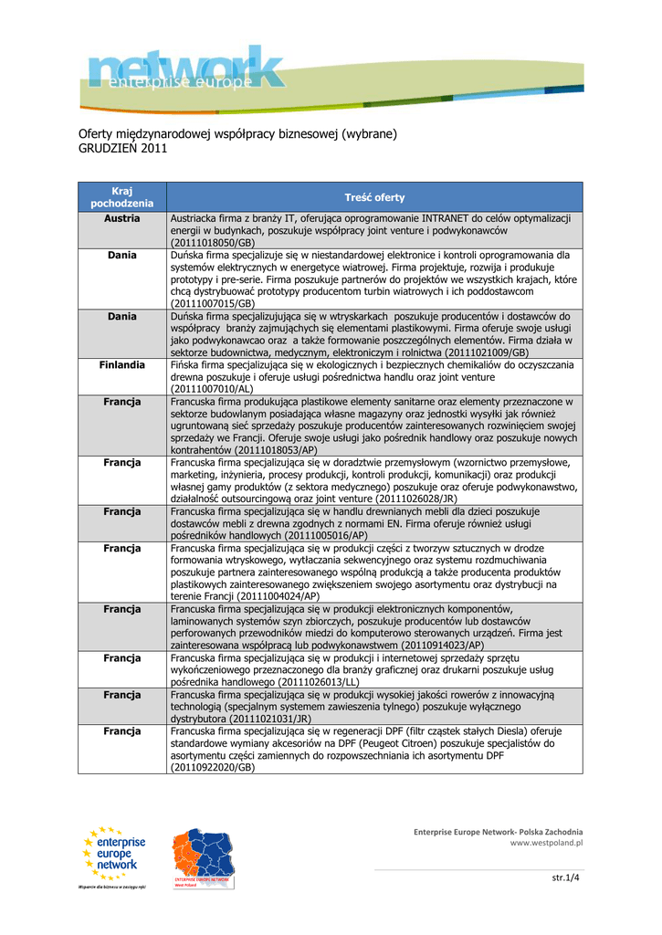 Oferty międzynarodowej współpracy biznesowej (wybrane) GRUDZIEŃ 2011 Kraj pochodzenia Austria Dania Dania Finlandia Francja Francja Francja Francja Francja Francja Francja Francja Treść oferty Austriacka firma z branży IT, oferująca oprogramowanie INTRANET do celów optymalizacji energii w budynkach, poszukuje współpracy joint venture i podwykonawców (20111018050/GB) Duńska firma specjalizuje się w niestandardowej elektronice i kontroli oprogramowania dla systemów elektrycznych w energetyce wiatrowej. Firma projektuje, rozwija i produkuje prototypy i pre-serie. Firma poszukuje partnerów do projektów we wszystkich krajach, które chcą dystrybuować prototypy producentom turbin wiatrowych i ich poddostawcom (20111007015/GB) Duńska firma specjalizujująca się w wtryskarkach poszukuje producentów i dostawców do współpracy branży zajmująchych się elementami plastikowymi. Firma oferuje swoje usługi jako podwykonawcao oraz a także formowanie poszczególnych elementów. Firma działa w sektorze budownictwa, medycznym, elektroniczym i rolnictwa (20111021009/GB) Fińska firma specjalizująca się w ekologicznych i bezpiecznych chemikaliów do oczyszczania drewna poszukuje i oferuje usługi pośrednictwa handlu oraz joint venture (20111007010/AL) Francuska firma produkująca plastikowe elementy sanitarne oraz elementy przeznaczone w sektorze budowlanym posiadająca własne magazyny oraz jednostki wysyłki jak również ugruntowaną sieć sprzedaży poszukuje producentów zainteresowanych rozwinięciem swojej sprzedaży we Francji. Oferuje swoje usługi jako pośrednik handlowy oraz poszukuje nowych kontrahentów (20111018053/AP) Francuska firma specjalizująca się w doradztwie przemysłowym (wzornictwo przemysłowe, marketing, inżynieria, procesy produkcji, kontroli produkcji, komunikacji) oraz produkcji własnej gamy produktów (z sektora medycznego) poszukuje oraz oferuje podwykonawstwo, działalność outsourcingową oraz joint venture (20111026028/JR) Francuska firma specjalizująca się w handlu drewnianych mebli dla dzieci poszukuje dostawców mebli z drewna zgodnych z normami EN. Firma oferuje również usługi pośredników handlowych (20111005016/AP) Francuska firma specjalizująca się w produkcji części z tworzyw sztucznych w drodze formowania wtryskowego, wytłaczania sekwencyjnego oraz systemu rozdmuchiwania poszukuje partnera zainteresowanego wspólną produkcją a także producenta produktów plastikowych zainteresowanego zwiększeniem swojego asortymentu oraz dystrybucji na terenie Francji (20111004024/AP) Francuska firma specjalizująca się w produkcji elektronicznych komponentów, laminowanych systemów szyn zbiorczych, poszukuje producentów lub dostawców perforowanych przewodników miedzi do komputerowo sterowanych urządzeń. Firma jest zainteresowana współpracą lub podwykonawstwem (20110914023/AP) Francuska firma specjalizująca się w produkcji i internetowej sprzedaży sprzętu wykończeniowego przeznaczonego dla branży graficznej oraz drukarni poszukuje usług pośrednika handlowego (20111026013/LL) Francuska firma specjalizująca się w produkcji wysokiej jakości rowerów z innowacyjną technologią (specjalnym systemem zawieszenia tylnego) poszukuje wyłącznego dystrybutora (20111021031/JR) Francuska firma specjalizująca się w regeneracji DPF (filtr cząstek stałych Diesla) oferuje standardowe wymiany akcesoriów na DPF (Peugeot Citroen) poszukuje specjalistów do asortymentu części zamiennych do rozpowszechniania ich asortymentu DPF (20110922020/GB) Enterprise Europe Network- Polska Zachodnia www.westpoland.pl str.1/4 Francja Francja Francja Francja Francja Francja Francja Francja Francja Francja Hiszpania Hiszpania Hiszpania Hiszpania Hiszpania Hiszpania Francuska firma sprzedająca oraz instalująca różnego rodzaju sprzętu rolniczego a w szczególności silosu do przechowywania wilgotnego ziarna poszukuje partnerów zainteresowanych pośrednictwem handlowym. Ponadto firma oferuje usługi transportowe oraz logistyczne (20111019074/AP) Francuska firma z wieloletnim doświadczeniem w projektowaniu, produkcji i instalacji maszyn przeznaczonych do przemysłu drzewnego, zwłaszcza w produkcji automatycznych zbiorników zanurzania, tuneli leczniczych oraz zbiorników ciśnieniowych poszukuje pośredników handlowych a także oferuje swoje usługi jako podwykonawca (20111019060/AP) Francuska firma, która opracowała opatentowany automatyczny kocioł na biomasę przy użyciu odpadów rolnych, drewna lub paliw ciekłych poszukuje partnera zainteresowanego zakupem całego przedsiębiorstwa (20111026031/AP) Francuska firma, która opracowała społeczną sieć poświęconą podróżowaniu, która pozwala użytkownikom na wymianę oraz znalezienie najlepszych rozwiązań dla podróżujących (najkorzystniejsze oferty, zakwaterowanie itp.) poszukuje partnerów (biura podróży, hotele, linie lotnicze) zainteresowanych podwykonawstwem a dokładniej zainteresowanych reklamą swoich produktów/usług za pośrednictwem tej platformy (20111017041/AP) Francuska firma, zajmująca się projektowaniem oraz inżynierią w obszarze energii elektrycznej oraz energetyki, nawiąże współpracę z partnerami europejskimi, którzy są zainteresowani stworzeniem wspólnej oferty handlowej, składania ofert lub umów ramowych finansowanych ze środków europejskich (20110914028/AP) Francuska rodzinna firma z siedziba w Paryżu specjalizująca się w produkcji i projektowaniu dywanów poszukuje przedstawicieli handlowych (20111020049/AP) Francuski producent kiosków do bezprzewodowego ładowania urządzeń mobilnych (telefony komórkowe, kamery, tablety, konsole do gier, odtwarzacze mp3, PDA) poszukuje dystrybutora w hotelach, restauracjach (20111012021/AP) Francuski producent oprogramowania do produkcji narzędzi edukacyjnych dla laboratoriów językowych poszukuje przedstawicieli handlowych (20111021005/AP) Francuski producent sygnalizatorów ostrzeg