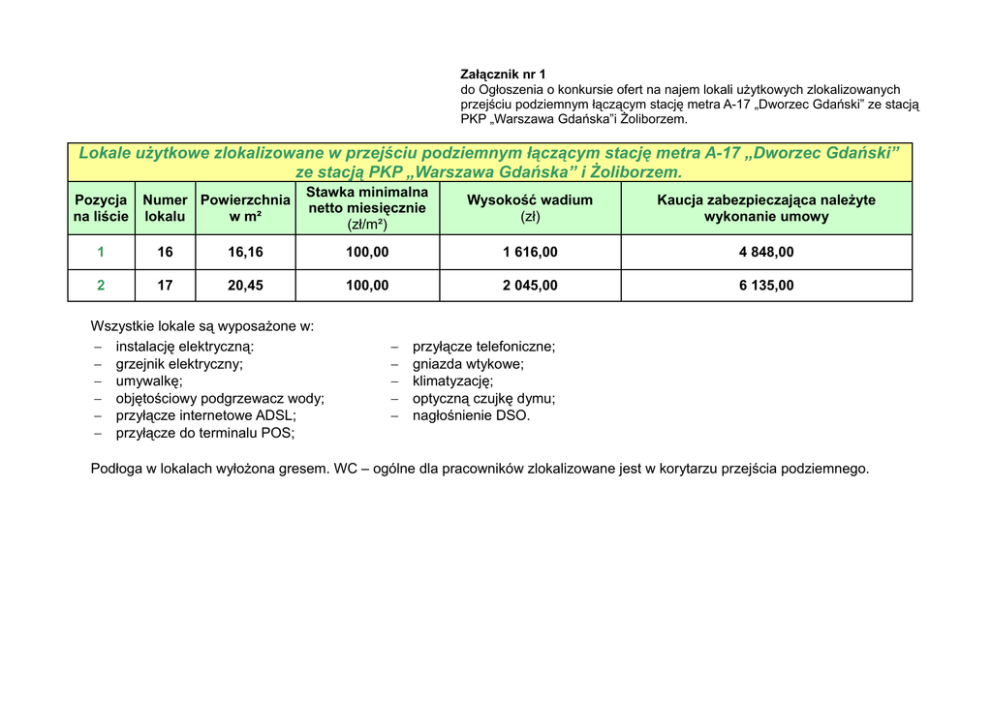Załącznik nr 1 do Ogłoszenia o konkursie ofert na najem lokali użytkowych zlokalizowanych przejściu podziemnym łączącym stację metra A-17 „Dworzec Gdański” ze stacją PKP „Warszawa Gdańska”i Żoliborzem. Lokale użytkowe zlokalizowane w przejściu podziemnym łączącym stację metra A-17 „Dworzec Gdański” ze stacją PKP „Warszawa Gdańska” i Żoliborzem. Pozycja Numer Powierzchnia na liście lokalu w m² Stawka minimalna netto miesięcznie (zł/m²) Wysokość wadium (zł) Kaucja zabezpieczająca należyte wykonanie umowy 1 16 16,16 100,00 1 616,00 4 848,00 2 17 20,45 100,00 2 045,00 6 135,00 Wszystkie lokale są wyposażone w: − instalację elektryczną: − grzejnik elektryczny; − umywalkę; − objętościowy podgrzewacz wody; − przyłącze internetowe ADSL; − przyłącze do terminalu POS; − − − − − przyłącze telefoniczne; gniazda wtykowe; klimatyzację; optyczną czujkę dymu; nagłośnienie DSO. Podłoga w lokalach wyłożona gresem. WC – ogólne dla pracowników zlokalizowane jest w korytarzu przejścia podziemnego.