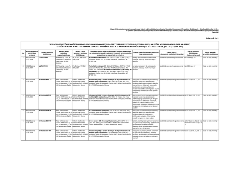 Załączniki do obwieszczenia Prezesa Urzędu Rejestracji Produktów Leczniczych, Wyrobów Medycznych i Produktów Biobójczych z dnia 9 października 2013 r. w sprawie ogłoszenia Urzędowego Wykazu Produktów Biobójczych Dopuszczonych do Obrotu na terytorium Rzeczypospolitej Polskiej (poz. 36) Załącznik Nr 1 WYKAZ PRODUKTÓW BIOBÓJCZYCH DOPUSZCZONYCH DO OBROTU NA TERYTORIUM RZECZYPOSPOLITEJ POLSKIEJ, NA KTÓRE WYDANO POZWOLENIE NA OBRÓT, O KTÓRYM MOWA W ART. 54 USTAWY Z DNIA 13 WRZEŚNIA 2002 R. O PRODUKTACH BIOBÓJCZYCH (Dz. U. z 2007 r. Nr 39, poz. 252, z późn. zm.) Lp. Nr pozwolenia na obrót i data wydania Nazwa produktu biobójczego Nazwa i adres podmiotu odpowiedzialnego Nazwa i adres wytwórcy produktu biobójczego Chemiczna nazwa substancji czynnej (lub inna pozwalająca na ustalenie tożsamości substancji czynnej), jej zawartość w produkcie oraz nazwa i adres wytwórcy Rodzaj i postać użytkowa produktu i jego przeznaczenie Zakres obrotu i stosowania (rodzaj użytkownika) Rodzaj produktu biobójczego (kategoria i grupa) Okres ważności produktu biobójczego 1 0001/03 z dnia 25.03.2004r ULTRATHON 3M Poland Sp. z o.o., Al. Katowicka 117, Kajetany k/Warszawy, 05-830 Nadarzyn 3M, St.Paul, MN 55144 1000, USA N,N-diethyl m-toluamide CAS: 134-62-3 [zaw. 31,58%+/-2%]; producent: Morflex Inc., 2110 High Point Road, Greensboro, NC 27403, USA emulsja przeznaczona do odstraszania komarów, kleszczy, much oraz innych owadów produkt do powszechnego stosowania Kat: III Grupy: 19 3 lata od daty produkcji 2 0002/03 z dnia 25.03.2004r ULTRATHON 3M Poland Sp. z o.o., Al. Katowicka 117, Kajetany k/Warszawy, 05-830 Nadarzyn 3M, St.Paul, MN 55144 1000, USA N,N-diethyl m-toluamide CAS: 134-62-3 [zaw. 23,75%+/-2%]; aerozol przeznaczony do odstraszania: producent: Morflex Inc., 2110 High Point Road, Greensboro, NC komarów, kleszczy, much oraz innych 27403, USA /zmiana na N,N-dietylo-m-toluamid (N,N-diethyl M- owadów toluamide) CAS: 134-62-3, WE: 205-149-7, [zaw. 42,5g/170g] producent: Morflex Inc., 2110 High Point Road, Greensboro, NC 27403, USA produkt do powszechnego stosowania Kat: III Grupy: 19 3 lata od daty produkcji 3 0003/03 z dnia 15.09.2003r Waterdos MKB 16 Water & Wastewater Water & Wastewater Technic WWT Polska Sp. z Technic WWT GmbH, o. o., ul. Katowicka 17, 41- Staufenstraße 5, D 74385 100 Siemianowice Śląskie Pleidelsheim, Niemcy mieszanina (3:1): 5-chloro-2-metylo-3(2H)-izotiazolonu i 2metylo-3(2H)-izotiazolonu, CAS: 55965-84-9 (zaw. max 1%); producent: Water & Wastewater Technic WWT GmbH, Staufenstraße 5, D 74385 Pleidelsheim, Niemcy ciecz, produkt kombinowany do stabilizacji produkt do profesjonalnego stosowania Kat: II Grupy: 11, 12, 13 twardości wody oraz zabezpieczenia antykorozyjnego przemysłowych obiegów wodnych (np. w chłodniach wieżowych, nawilżaczach aerozolowych), przez wbudowane dodatkowo biologicznie czynne komponenty minimalizuje wzrost glonów i grzybów 2 lata od daty produkcji 4 0004/03 z dnia 15.09.2003r Waterdos KAZ 16 Water & Wastewater Technic WWT Polska Sp. z o. o.,ul. Katowicka 17, 41100 Siemianowice Śląskie mieszanina (3:1): 5-chloro-2-metylo-3(2H)-izotiazolonu i 2metylo-3(2H)-izotiazolonu, CAS: 55965-84-9 (zaw. max 1%); producent: Water & Wastewater Technic WWT GmbH, Staufenstraße 5, D 74385 Pleidelsheim, Niemcy ciecz, produkt kombinowany do stabilizacji produkt do profesjonalnego stosowania Kat: II Grupy: 11, 12, 13 twardości wody oraz zabezpieczania antykorozyjnego przemysłowych obiegów wodnych (np. w chłodniach wieżowych, nawilżaczach aerozolowych), przez wbudowanie dodatkowo biologicznie czynne komponenty minimalizuje wzrost glonów i grzybów 2 lata od daty produkcji 5 0005/03 z dnia 15.09.2003r Waterdos SIM 28 Water & Wastewater Water & Wastewater 1,2-benisothiazol-3(2H)-one, CAS: 2634-33-5 (zaw. max. 3%); Technic WWT Polska Sp. z Technic WWT GmbH, producent: Water & Wastewater Technic WWT GmbH, Staufenstraße o. o., ul. Katowicka 17, 41- Staufenstraße 5, D 74385 5, D 74385 Pleidelsheim, Niemcy 100 Siemianowice Śląskie Pleidelsheim, Niemcy ciecz, produkt kombinowany do stabilizacji twardości wody oraz zabezpieczenia antykorozyjnego do zamkniętych i półotwartych urządzeń chłodniczych, posiada komponenty dyspergujące 2 lata od daty produkcji 6 0006/03 z dnia 15.09.2003r Waterdos BCH 08 Water & Wastewater Water & Wastewater bromo-chloro-5,5-dwumetylohydantoina, CAS: 32718-18-6 Technic WWT Polska Sp. z Technic WWT GmbH, (zaw. max. 98%); producent: Water & Wastewater Technic WWT o. o., ul. Katowicka 17, 41- Staufenstraße 5, D 74385 GmbH, Staufenstraße 5, D 74385 Pleidelsheim, Niemcy 100 Siemianowice Śląskie Pleidelsheim, Niemcy tabletki, środek przeciw glonom, bakteriom produkt do profesjonalnego stosowania Kat: II Grupy: 6, 11, 12, 13 / 2 lata od daty produkcji (w tym z rodzaju Legionella), grzybom oraz zmiana na: Kat: II Grupy: 11, ograniczonym warstwom szlamów 12 powstających w przemysłowych obiegach wodnych oraz w fontannach 7 0007/03 z dnia 15.09.2003r Waterdos CIT 48 Water & Wastewater Water & Wastewater Technic WWT Polska Sp. z Technic WWT GmbH, o. o., ul. Katowicka 17, 41- Staufenstraße 5, D 74385 100 Siemianowice Śląskie Pleidelsheim, Niemcy ciecz, produkt przeciw glonom, bakteriom produkt do profesjonalnego stosowania Kat: II Grupy: 6, 11, 12, 13 (w tym z rodzaju Legionella), wirusom, grzybom, ograniczonym warstwom szlamów powstającym w przemysłowych obiegach wodnych Water & Wastewater Technic WWT GmbH, Staufenstraße 5, D 74385 Pleidelsheim, Niemcy mieszanina (3:1): 5-chloro-2-metylo-3(2H)-izotiazolonu i 2metylo-3(2H)-izotiazolonu CAS: 55965-84-9 (zaw. max 1%); producent: Water & Wastewater Technic WWT GmbH, Staufenstraße 5, D 74385 Pleidelsheim, Niemcy produkt do profesjonalnego stosowania Kat: II Grupy: 11, 12, 13 2 lata od daty produkcji Lp. Nr pozwolenia na obrót i data wydania Nazwa produktu biobójczego Nazwa i adres podmiotu odpowiedzialnego Nazwa i adres wytwórcy produktu biobój