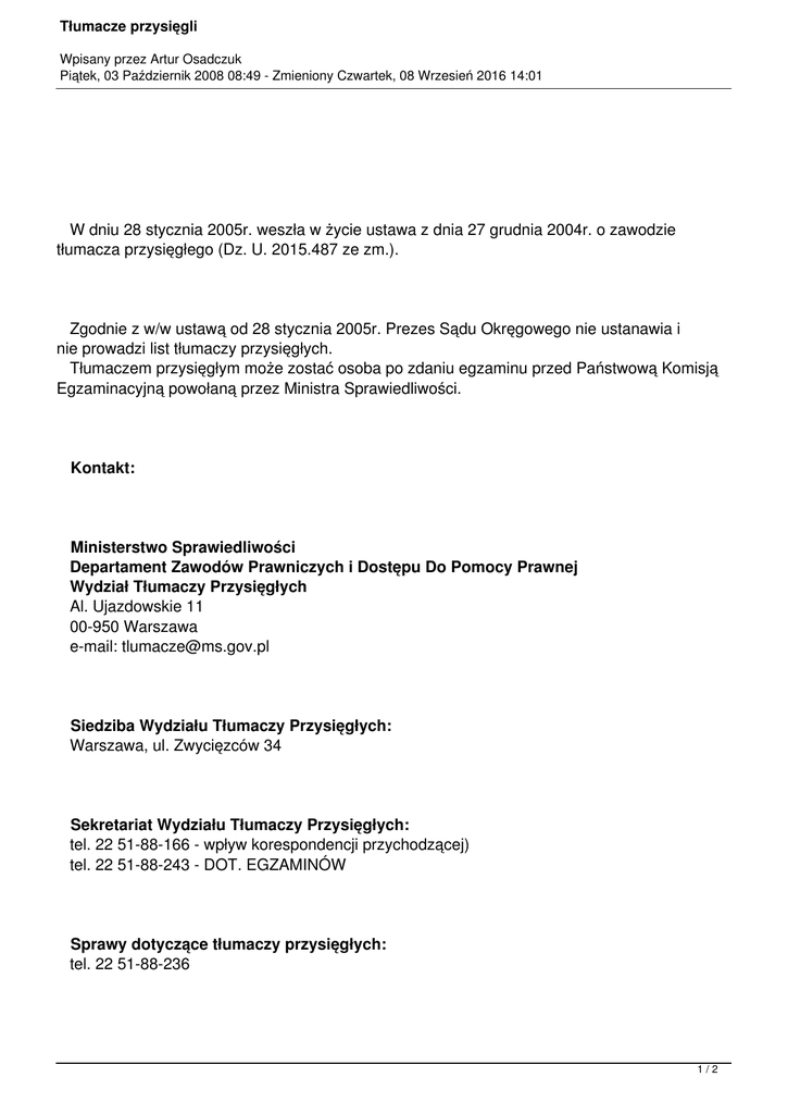 Tłumacze przysięgli Wpisany przez Artur Osadczuk Piątek, 03 Październik 2008 08:49 - Zmieniony Czwartek, 08 Wrzesień 2016 14:01 W dniu 28 stycznia 2005r. weszła w życie ustawa z dnia 27 grudnia 2004r. o zawodzie tłumacza przysięgłego (Dz. U. 2015.487 ze zm.). Zgodnie z w/w ustawą od 28 stycznia 2005r. Prezes Sądu Okręgowego nie ustanawia i nie prowadzi list tłumaczy przysięgłych. Tłumaczem przysięgłym może zostać osoba po zdaniu egzaminu przed Państwową Komisją Egzaminacyjną powołaną przez Ministra Sprawiedliwości. Kontakt: Ministerstwo Sprawiedliwości Departament Zawodów Prawniczych i Dostępu Do Pomocy Prawnej Wydział Tłumaczy Przysięgłych Al. Ujazdowskie 11 00-950 Warszawa e-mail: [email protected] Siedziba Wydziału Tłumaczy Przysięgłych: Warszawa, ul. Zwycięzców 34 Sekretariat Wydziału Tłumaczy Przysięgłych: tel. 22 51-88-166 - wpływ korespondencji przychodzącej) tel. 22 51-88-243 - DOT. EGZAMINÓW Sprawy dotyczące tłumaczy przysięgłych: tel. 22 51-88-236 1/2 Tłumacze przysięgli Wpisany przez Artur Osadczuk Piątek, 03 Październik 2008 08:49 - Zmieniony Czwartek, 08 Wrzesień 2016 14:01 UWAGA - lista tłumaczy przysięgłych jest prowadzona przez Ministerstwo Sprawiedliwości Internetowa lista tłumaczy przysięgłych (wyszukiwarka) Ustawa z dnia 25.11.2004 r. o zawodzie tłumacza przysięgłego (Dz. U. 2015.487 ze zm.) Aktualności ze strony Ministerstwa Sprawiedliwości Informacje dla osób pragnących uzyskać prawo do wykonywania zawodu tłumacza przysięgłego Formularze dotyczące tłumaczy przysięgłych 2/2