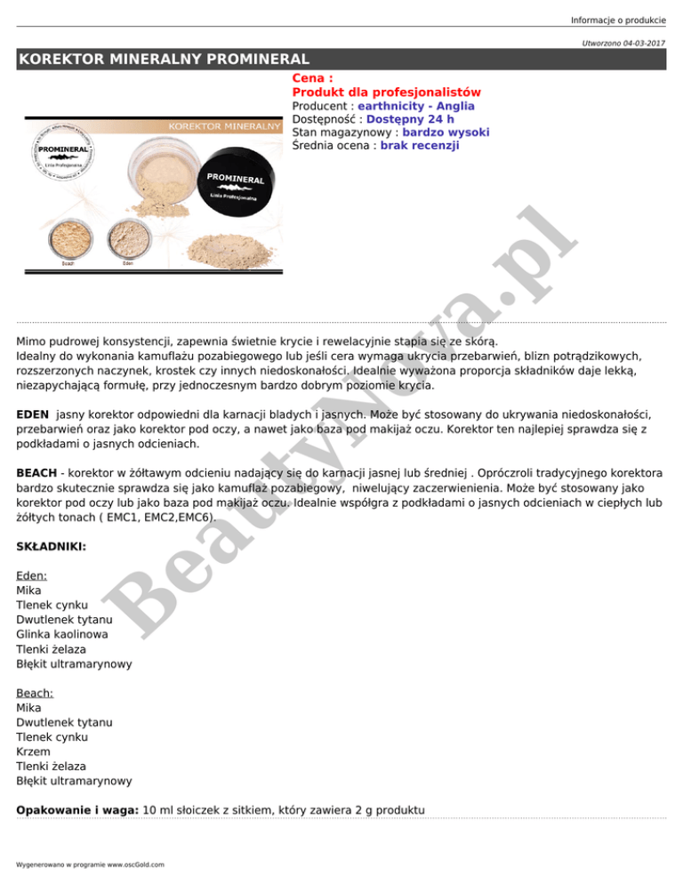 Informacje o produkcie Utworzono 04-03-2017 KOREKTOR MINERALNY PROMINERAL Cena : Produkt dla profesjonalistów a. pl Producent : earthnicity - Anglia Dostępność : Dostępny 24 h Stan magazynowy : bardzo wysoki Średnia ocena : brak recenzji yN ov Mimo pudrowej konsystencji, zapewnia świetnie krycie i rewelacyjnie stapia się ze skórą. Idealny do wykonania kamuflażu pozabiegowego lub jeśli cera wymaga ukrycia przebarwień, blizn potrądzikowych, rozszerzonych naczynek, krostek czy innych niedoskonałości. Idealnie wyważona proporcja składników daje lekką, niezapychającą formułę, przy jednoczesnym bardzo dobrym poziomie krycia. EDEN jasny korektor odpowiedni dla karnacji bladych i jasnych. Może być stosowany do ukrywania niedoskonałości, przebarwień oraz jako korektor pod oczy, a nawet jako baza pod makijaż oczu. Korektor ten najlepiej sprawdza się z podkładami o jasnych odcieniach. SKŁADNIKI: ea ut BEACH - korektor w żółtawym odcieniu nadający się do karnacji jasnej lub średniej . Opróczroli tradycyjnego korektora bardzo skutecznie sprawdza się jako kamuflaż pozabiegowy, niwelujący zaczerwienienia. Może być stosowany jako korektor pod oczy lub jako baza pod makijaż oczu. Idealnie współgra z podkładami o jasnych odcieniach w ciepłych lub żółtych tonach ( EMC1, EMC2,EMC6). B Eden: Mika Tlenek cynku Dwutlenek tytanu Glinka kaolinowa Tlenki żelaza Błękit ultramarynowy Beach: Mika Dwutlenek tytanu Tlenek cynku Krzem Tlenki żelaza Błękit ultramarynowy Opakowanie i waga: 10 ml słoiczek z sitkiem, który zawiera 2 g produktu Wygenerowano w programie www.oscGold.com Dostępne opcje KOREKTOR MINERALNY PROMINERAL B ea ut yN ov a. pl Wybierz kolor: BEACH, EDEN.