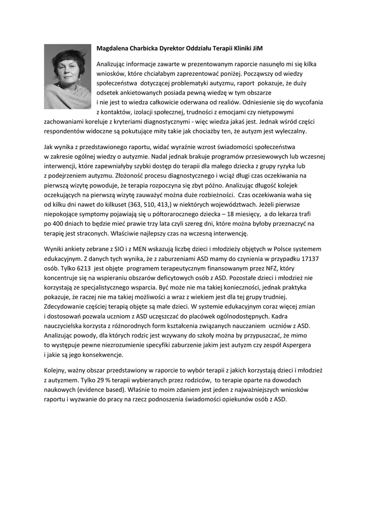Magdalena Charbicka Dyrektor Oddziału Terapii Kliniki JiM Analizując informacje zawarte w prezentowanym raporcie nasunęło mi się kilka wniosków, które chciałabym zaprezentować poniżej. Począwszy od wiedzy społeczeństwa dotyczącej problematyki autyzmu, raport pokazuje, że duży odsetek ankietowanych posiada pewną wiedzę w tym obszarze i nie jest to wiedza całkowicie oderwana od realiów. Odniesienie się do wycofania z kontaktów, izolacji społecznej, trudności z emocjami czy nietypowymi zachowaniami koreluje z kryteriami diagnostycznymi - więc wiedza jakaś jest. Jednak wśród części respondentów widoczne są pokutujące mity takie jak chociażby ten, że autyzm jest wyleczalny. Jak wynika z przedstawionego raportu, widać wyraźnie wzrost świadomości społeczeństwa w zakresie ogólnej wiedzy o autyzmie. Nadal jednak brakuje programów przesiewowych lub wczesnej interwencji, które zapewniałyby szybki dostęp do terapii dla małego dziecka z grupy ryzyka lub z podejrzeniem autyzmu. Złożoność procesu diagnostycznego i wciąż długi czas oczekiwania na pierwszą wizytę powoduje, że terapia rozpoczyna się zbyt późno. Analizując długość kolejek oczekujących na pierwszą wizytę zauważyć można duże rozbieżności. Czas oczekiwania waha się od kilku dni nawet do kilkuset (363, 510, 413,) w niektórych województwach. Jeżeli pierwsze niepokojące symptomy pojawiają się u półtorarocznego dziecka – 18 miesięcy, a do lekarza trafi po 400 dniach to będzie mieć prawie trzy lata czyli szereg dni, które można byłoby przeznaczyć na terapię jest straconych. Właściwie najlepszy czas na wczesną interwencję. Wyniki ankiety zebrane z SIO i z MEN wskazują liczbę dzieci i młodzieży objętych w Polsce systemem edukacyjnym. Z danych tych wynika, że z zaburzeniami ASD mamy do czynienia w przypadku 17137 osób. Tylko 6213 jest objęte programem terapeutycznym finansowanym przez NFZ, który koncentruje się na wspieraniu obszarów deficytowych osób z ASD. Pozostałe dzieci i młodzież nie korzystają ze specjalistycznego wsparcia. Być może nie ma takiej konieczności, jednak praktyka pokazuje, że raczej nie ma takiej możliwości a wraz z wiekiem jest dla tej grupy trudniej. Zdecydowanie częściej terapią objęte są małe dzieci. W systemie edukacyjnym coraz więcej zmian i dostosowań pozwala uczniom z ASD uczęszczać do placówek ogólnodostępnych. Kadra nauczycielska korzysta z różnorodnych form kształcenia związanych nauczaniem uczniów z ASD. Analizując powody, dla których rodzic jest wzywany do szkoły można by przypuszczać, że mimo to występuje pewne niezrozumienie specyfiki zaburzenie jakim jest autyzm czy zespół Aspergera i jakie są jego konsekwencje. Kolejny, ważny obszar przedstawiony w raporcie to wybór terapii z jakich korzystają dzieci i młodzież z autyzmem. Tylko 29 % terapii wybieranych przez rodziców, to terapie oparte na dowodach naukowych (evidence based). Właśnie to moim zdaniem jest jeden z najważniejszych wniosków raportu i wyzwanie do pracy na rzecz podnoszenia świadomości opiekunów osób z ASD.