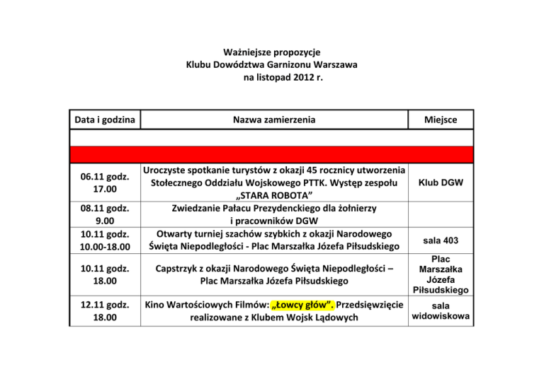 Ważniejsze propozycje Klubu Dowództwa Garnizonu Warszawa na listopad 2012 r. Data i godzina 06.11 godz. 17.00 08.11 godz. 9.00 10.11 godz. 10.00-18.00 10.11 godz. 18.00 12.11 godz. 18.00 Nazwa zamierzenia Uroczyste spotkanie turystów z okazji 45 rocznicy utworzenia Stołecznego Oddziału Wojskowego PTTK. Występ zespołu „STARA ROBOTA” Zwiedzanie Pałacu Prezydenckiego dla żołnierzy i pracowników DGW Otwarty turniej szachów szybkich z okazji Narodowego Święta Niepodległości - Plac Marszałka Józefa Piłsudskiego Capstrzyk z okazji Narodowego Święta Niepodległości – Plac Marszałka Józefa Piłsudskiego Miejsce Klub DGW sala 403 Plac Marszałka Józefa Piłsudskiego Kino Wartościowych Filmów: „Łowcy głów”. Przedsięwzięcie sala widowiskowa realizowane z Klubem Wojsk Lądowych 15.11 godz. 19.00 18.11 godz. 12.00 Wieczór z muzyką „Pink Floyd”. Występ zespołu coverowego sala widowiskowa „2 LATE” Przedstawienie teatralne dla dzieci pt. „Zatruta studnia” sala widowiskowa 18-22.11 XI Biennale Twórczości Plastycznej Wojska Polskiego – Sieradz 2012 XXVII Konkurs Fotografii „FOTO 2012”- Sieradz XXV Ogólnopolski Przegląd Filmów Amatorskich Wojska Polskiego „OPFA” - Sieradz Sieradz 19.11 godz. 18.00 Kino Interesujących Filmów: „Bitwa pod Wiedniem” sala widowiskowa Przegląd Kabaretowy STOLICA realizowany wspólnie ze Szkołą Główną Handlową Monodram w wykonaniu Marcina Kwaśnego pt. „Rozkwaś Polaka” sala widowiskowa Wieczór teatru tańca „mufmi” pt. „Taniec, taniec, taniec” sala widowiskowa Wieczór Andrzejkowy. Występ greckiego zespołu „Mythos” sala widowiskowa 22-25.11 23-25.11 godz. 19.00 26.11 godz. 19.00 30.11 godz. 18.00 sala 308 Propozycje zajęć w sekcjach i kołach zainteresowań od listopada 2012 r. Studio Piosenki (dzieci, młodzież, dorośli) zajęcia tańca nowoczesnego dla dzieci 5-7 lat zajęcia tańca nowoczesnego dla dzieci 8-12 lat zajęcia klubu miłośników gier historycznych i strategicznych(młodzież) „mufmi teatr tańca” sekcja szachowa (dzieci, dorośli) zajęcia relaksacyjne dla pań z jednostek podległych DGW kurs tańca towarzyskiego dla żołnierzy i pracownikówwojska(stopień podstawowy