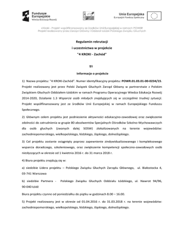 Regulamin rekrutacji i uczestnictwa w projekcie "4 KROKI - Zachód" §1 Informacje o projekcie 1) Nazwa projektu: "4 KROKI-Zachód". Numer identyfikacyjny projektu: POWR.01.03.01-00-0234/15. Projekt realizowany jest przez Polski Związek Głuchych Zarząd Główny w partnerstwie z Polskim Związkiem Głuchych Oddziałem Łódzkim w ramach Programu Operacyjnego Wiedza Edukacja Rozwój 2014-2020, Działanie 1.3 Wsparcie osób młodych znajdujących się w szczególnie trudnej sytuacji. Projekt współfinansowany jest ze środków Unii Europejskiej w ramach Europejskiego Funduszu Społecznego. 2) Głównym celem projektu jest podniesienie aktywności edukacyjno-zawodowej oraz zwiększenie zdolności do zatrudnienia w grupie 80 absolwentów Specjalnych Ośrodków Szkolno-Wychowawczych dla osób głuchych (zwanych dalej SOSW) zlokalizowanych na terenie województw: zachodniopomorskiego, wielkopolskiego, łódzkiego, śląskiego, dolnośląskiego. 3) Cel projektu zostanie osiągnięty poprzez zapewnienie zindywidualizowanego i kompleksowego wsparcia doradczego, szkoleniowego, oraz zwiększenie kompetencji społeczno-zawodowych osób niesłyszących w okresie od 1 kwietnia 2016 r. do 31 marca 2018 r. 4) Biura projektu znajdują się w: a) siedzibie Lidera projektu – Polskiego Związku Głuchych Zarządu Głównego, ul. Białostocka 4, 03-741 Warszawa b) siedzibie Partnera - Polskiego Związku Głuchych Oddziału Łódzkiego, ul. Nawrot 94/96, 90-040 Łódź Biura projektu czynne od poniedziałku do piątku w godzinach 8.00 – 16.00. 5) Projekt realizowany jest w okresie od 01.04.2016 r. do 31.03.2018 r. na terenie województw: zachodniopomorskiego, wielkopolskiego, łódzkiego, śląskiego, dolnośląskiego. 6) Projekt realizowany jest pod nadzorem Instytucji Pośredniczącej tj. Ministerstwa Rodziny Pracy i Polityki Społecznej ul. Nowogrodzka 1/3/5, 00‐513 Warszawa §2 Postanowienia ogólne 1. Niniejszy regulamin określa zasady rekrutacji, w tym naboru i doboru uczestników/ uczestniczek oraz zasady uczestnictwa w projekcie „4 KROKI - Zachód". 2. Celem projektu jest podniesienie aktywności edukacyjno-zawodowej oraz zwiększenie zdolności do zatrudnienia w grupie 80 absolwentów SOSW zlokalizowanych na terenie województw zachodniopomorskiego, wielkopolskiego, łódzkiego, śląskiego, dolnośląskiego poprzez zindywidualizowane i kompleksowe usługi dla 48 kobiet i 32 mężczyzn. 3. Udział uczestników w projekcie jest bezpłatny. 4. Informacja o projekcie dostępna jest: a) na stronie internetowej projektu – www.pzg.lodz.pl/4kroki b) na stronie internetowej Lidera projektu - www.pzg.org.pl c) na stronie internetowej Partnera - www.pzg.lodz.pl b) na ulotkach i plakatach kolportowanych na terenie, na którym realizowany jest projekt, c) w siedzibach SOSW zlokalizowanych na terenie województw zachodniopomorskiego, wielkopolskiego, łódzkiego, śląskiego, dolnośląskiego. 5. W ramach projektu zaplanowano realizację następujących zadań: a) Doradztwo i poradnictwo (w tym diagnoza potrzeb oraz opracowanie IPD) Indywidualne konsultacje z doradcą zawodowym w celu utworzenia IPD Poradnictwo zawodowe Pośrednictwo pracy b) Działania aktywizujące zawodowo Warsztaty kompetencji społeczno-zawodowych Life Skills Indywidualne przygotowanie do egzaminu dojrzałości Szkolenia zawodowe Szkolenia przygotowujące do egzaminu potwierdzającego kwalifikacje w zawodzie Staże zawodowe c) Działania aktywizujące edukacyjnie Indywidualne korepetycje przygotowujące do egzaminu dojrzałości Indywidualne przygotowanie do egzaminów zawodowych potwierdzających kwalifikacje w zawodzie §3 Uczestnicy projektu 1. Uczestniczyć w projekcie mogą osoby, które opuściły Specjalny Ośrodek Szkolno-Wychowawczy dla osób głuchych i słabosłyszących na rok przed datą rozpoczęcia udziału w projekcie. Uczestnicy projektu to osoby z uszkodzonym słuchem w wieku 18-29 lat, posiadające aktualne orzeczenie o lekkim lub umiarkowanym stopniu niepełnosprawności, bierne zawodowo (tj. bez pracy i nie zarejestrowane w Powiatowym Urzędzie Pracy jako osoby bezrobotne), które jednocześnie nie uczą się i nie szkolą (w ostatnich 4 tygodniach przed dniem przystąpienia do projektu). Podczas rekrutacji preferowane będą osoby posiadające wykształcenie maksymalnie ponadgimnazjalne. 2. Uczestnik projektu musi zamieszkiwać (w rozumieniu Kodeksu Cywilnego) na terenie województw zachodniopomorskiego, wielkopolskiego, łódzkiego, śląskiego, dolnośląskiego. §4 Zasady rekrutacji 1. Rekrutacja będzie odbywać sie z uwzględnieniem zasad równych szans kobiet i mężczyzn oraz niedyskryminacji, jednakże z zachowaniem polityki równości płci określonej w projekcie (zachowanie proporcji 48 kobiet i 32 mężczyzn w rekrutowanej grupie osób). 2. Zgodnie z harmonogramem projektu rekrutacja będzie prowadzona w dwóch etapach: Etap I a) Organizacja i prowadzenie spotkań rekrutacyjnych w siedzibach 11 SOSW z obszaru realizacji projektu (w okresie 05-06.2016 dla absolwentów SOSW z rocznika 2014/2015 i w okresie 1011.2016 dla wychowanków SOSW z rocznika 2015/2016 i w okresie 03-06.2017 z rocznika 2016/2017). b) Weryfikacja formalno-merytoryczna dokumentów zgłoszeniowych (w okresie 05-07.2016 i 1011.2016 - 03-06.2017) Dokumenty zgłoszeniowe będą zbierane przez Trenerów pracy w LPR 1 raz/tydzień podczas całodniowych dyżurów oraz w trakcie spotkań rekrutacyjnych. Za weryfikację dokumentacji zgłoszeniowej pod kątem formalno-merytorycznym odpowiadać będzie Asystent Koordynatora Projektu. Na komplet dokumentów zgłoszeniowych będą się składać: - ankieta rekrutacyjna wraz z oświadczeniami, - deklaracja uczestnictwa w projekcie, - oświadczenie uczestnika projektu o wyrażeniu zgody na przetwarzanie danych osobowych, - kserokopia orzeczenia o stopniu niepełnosprawności, - kserokopia dokumentu potwierdzającego ukończenie SOSW. Etap II Rozmowy rekrutacyjne z doradcą zawodowym (w okre