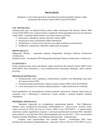 PROTOKÓŁ Spotkanie w celu rozpoczęcia prac nad opracowywaniem projektów planów zadań ochronnych dla obszaru Natura 2000 Czerna PLH120034 CEL SPOTKANIA: Zainicjowanie prac na dopracowaniem planu zadań ochronnych dla obszaru Natura 2000 Czerna PLH120034 oraz wypracowaniem wspólnych metod gospodarowania na tym obszarze Natura 2000 z udziałem społeczeństwa oraz służb ochrony przyrody. Informacja o aktualnym statusie obszarów Natura 2000; Rozpoczęcie pracy nad planami zadań ochronnych; Wyjaśnienie co wolno na tym obszarze oraz jakie działania są niewskazane; Dodatkowe wyjaśnienia i udzielenie odpowiedzi na pytania. PROWADZĄCY: Małgorzata Michna – regionalny planista (Regionalna Dyrekcja Ochrony Środowiska w Krakowie); Monika Kozieł – koordynator PZO (Regionalna Dyrekcja Ochrony Środowiska w Krakowie). UCZESTNICY: Osoby zainteresowane pracą nad planem zadań ochronnych dla obszaru Natura 2000 Czerna PLH120034 (lista obecności), w tym przedstawiciele samorządu lokalnego, służb ochrony przyrody. PROGRAM SPOTKANIA: Przedstawienie celów spotkania, oczekiwanych wyników oraz aktualnego stanu prac nad opracowaniem PZO; Przedstawieniem przedmiotów ochrony obszaru Natura 2000 Czerna PLH120034; Część dyskusyjna oraz ustalenie dalszych planów i zadań możliwych do realizacji. Przed spotkaniem, do potencjalnych zainteresowanych, skierowano imienne zaproszenia na warsztaty wraz z informacją o możliwości wzięcia udziału w pracach Zespołu Lokalnej Współpracy. PRZEBIEG SPOTKANIA: Spotkanie rozpoczęło się wystąpieniem regionalnego planisty – Pani Małgorzaty Michny, która przedstawiła prezentację multimedialną pt. „Opracowanie projektu planu zadań ochronnych (PZO) dla obszaru Natura 2000 Czerna PLH120034”, w ramach której omówione zostały zagadnienia związane z: prawnymi podstawami tworzenia PZO, udziałem społeczeństwa w powstawaniu PZO, harmonogramem prac na lata 2012 – 2013, utworzeniem Zespołu Lokalnej Współpracy oraz Platformą informacyjno – konsultacyjną. Kolejną część poprowadziła Pani Monika Kozieł – koordynator PZO, która przedstawiła prezentację multimedialną pt. „Specjalny Obszar Ochrony PLH120034 Czerna, warsztaty I”, w ramach której przedstawiła położenie obszaru, wartości przyrodnicze oraz przedmioty ochrony. Prezentację tę uzupełnił przedstawiciel zespołu eksperckiego – Pan Krzysztof Piksa omawiając obecny stan zachowania gatunków nietoperzy będących przedmiotem ochrony na tym obszarze, a mianowicie: podkowca małego (Rhinolophus hipposideros), nocka orzęsionego (Myotis emarginatus) i noceka dużego (Myotis myotis). Po wystąpieniu nastąpił czas na zadawanie pytań, w trakcie którego udzielano odpowiedzi na zagadnienia dotyczące harmonogramu przyszłych prac nad PZO. Ponadto w ramach dyskusji nad obszarem wskazano na konieczność zmian w Standardowym Formularzu Danych dla obszaru, a związanych z: zmianą oceny dla gatunku nocka orzęsionego (Myotis emarginatus) z D na C. Wskazano również na zagrożenia pojawiające się na terenie obszaru Natura 2000, związane z pracami remontowymi w klasztorze, w którym zlokalizowane są kolonie nietoperzy. Niestety na warsztatach nie pojawił się przedstawiciel zakonu Karmelitów Bosych. Uczestnicy spotkania zadeklarowali udział w pracach Zespołu Lokalnej Współpracy.