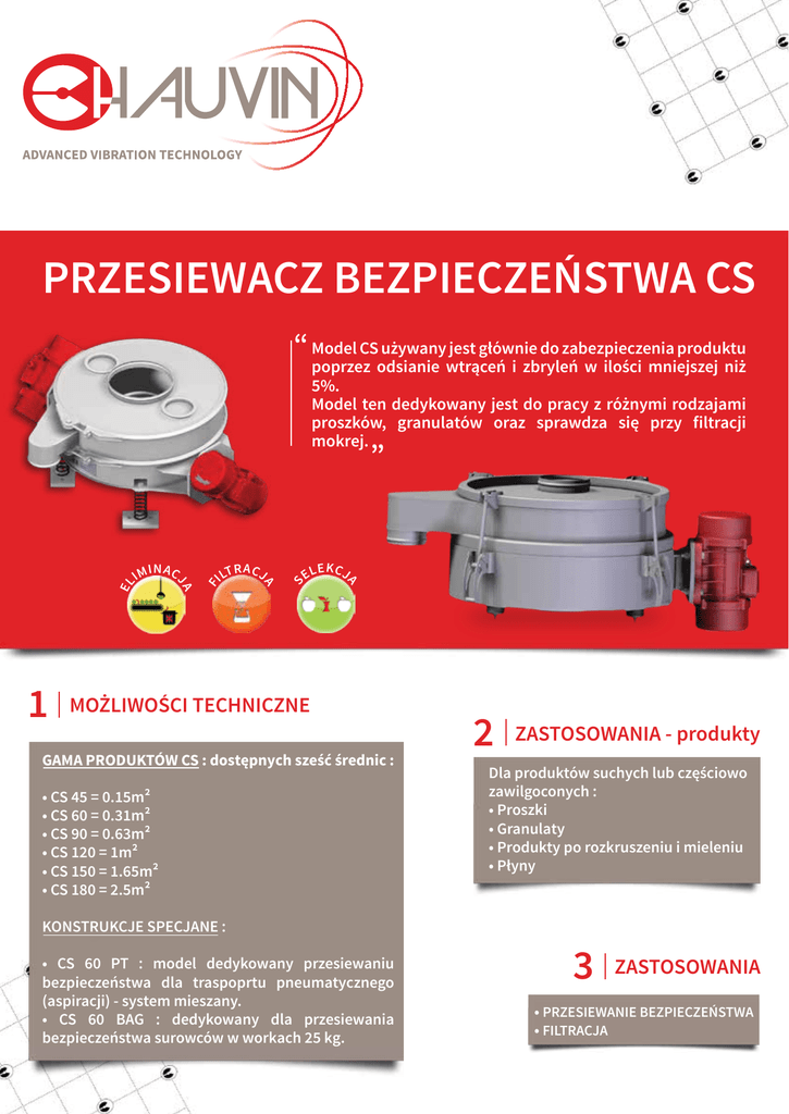 PRZESIEWACZ BEZPIECZEŃSTWA CS “ Model CS używany jest głównie do zabezpieczenia produktu poprzez odsianie wtrąceń i zbryleń w ilości mniejszej niż 5%. Model ten dedykowany jest do pracy z różnymi rodzajami proszków, granulatów oraz sprawdza się przy filtracji mokrej. S F EL “ A RA CJ ILT EL E KCJ A IN AC JA 1 IM MOŻLIWOŚCI TECHNICZNE GAMA PRODUKTÓW CS : dostępnych sześć średnic : • CS 45 = 0.15m² • CS 60 = 0.31m² • CS 90 = 0.63m² • CS 120 = 1m² • CS 150 = 1.65m² • CS 180 = 2.5m² 2 ZASTOSOWANIA - produkty Dla produktów suchych lub częściowo zawilgoconych : • Proszki • Granulaty • Produkty po rozkruszeniu i mieleniu • Płyny KONSTRUKCJE SPECJANE : • CS 60 PT : model dedykowany przesiewaniu bezpieczeństwa dla traspoprtu pneumatycznego (aspiracji) - system mieszany. • CS 60 BAG : dedykowany dla przesiewania bezpieczeństwa surowców w workach 25 kg. 3 ZASTOSOWANIA • PRZESIEWANIE BEZPIECZEŃSTWA • FILTRACJA 6 7 POKRYWY PRZESIEWACZA • Otwarta bez wysypu • Zamknięta z wysypem • Otwarta z wysypem 5 8 • Stal malowana • Stal malowana proszkowo (EPOXY) • Stal nierdzewna 304L/316L : pasywowana i moletowana • Stal nierdzewna 304L/316L : polerowana OBRÓBKA WYKAŃCZAJACA (ZEWNĘTRZNA I WEWNĘTRZNA) • Pasywowana i moletowana • Polerowana (wysoka jakość powierzchni obrabianej) • Powłoki anty-ścieralne 9 INSTALACJA URZĄDZENIA • Stała, kotwiona (opcja: stal nierdzewna) • Ruchoma (opcja: stal nierdzewna) DUŻY WYBÓR MATERIAŁÓW KONSTRUKCYJNYCH • Stal nierdzewna 304L • Stal nierdzewna 904L • Aluminium 4 OBRÓBKA FINALNA POWIERZCHNI BAZY WYSYP STOŻKOWY • Stal nierdzewna 316L • Stal węglowa 10 położony centralnie, nieosiowo lub przesunięty • różne średnice wysypu • KONSTRUKCJA WSPORCZA NAPĘDU • Jeden silnik • Dwa silniki SYSTEMY OCZYSZCZAJĄCE 3 11 System kulkowy BIL-VIB • Zestaw szczotek • Ultradźwiękowy • SYSTEMY ZAMYKANIA • Klamry spinajace (304L, 316L) • Klamry zamykające 2 ZAWIESZENIE • Absorbery gumowe • Sprężyny (stal nierdzewna) 1 TYPY POKŁADÓW SITOWYCH • Z możliwością odkładania się produktu • Bez możliwości odkładania się produktu 4 NKTY MOCNE PU ilnikami dwoma s ednym lub zj modułowa a j c p e c n • ko rzędzi łatwo użycia na z e b ż duktem są a o t r n p z ie c • demo ontak części w k ie k t s y z s •w ane duktu demontow nia się pro a d a ł k d o któw • brak pun zczelniony • 100% dos użycia ożliwości m e n a w o • nielimit OPCJE KONFIGURACJI 12 W układzie ze stacją rozładunku BIG-BAGów • W układzie z podajnikiem wibracyjnym • 5 CS 60 TL Model dedykowany przesiewaniu bezpieczeństwa dla transportu pneumatycznego - system mieszany. Pracuje w nadciśnieniach do 2 bar. www.chauvin.fr KES East Europe Sp. z o.o. ul. Św. Michała 43 61-119 Poznań www.kes-industry.pl [email protected] + 48 61 611 00 86 [email protected] Tél : +33 (0)4 76 09 30 63 Fax : +33 (0)4 76 22 30 54 Siège social 20 rue des Grands Champs ZI La Rollandière 38360 SASSENAGE - FRANCE Boîte postale BP 70015 38044 GRENOBLE CEDEX 9 - FRANCE Powielanie i kopiowanie treści bez zgody producenta zabronione Ø 600 mm Ø 900 mm