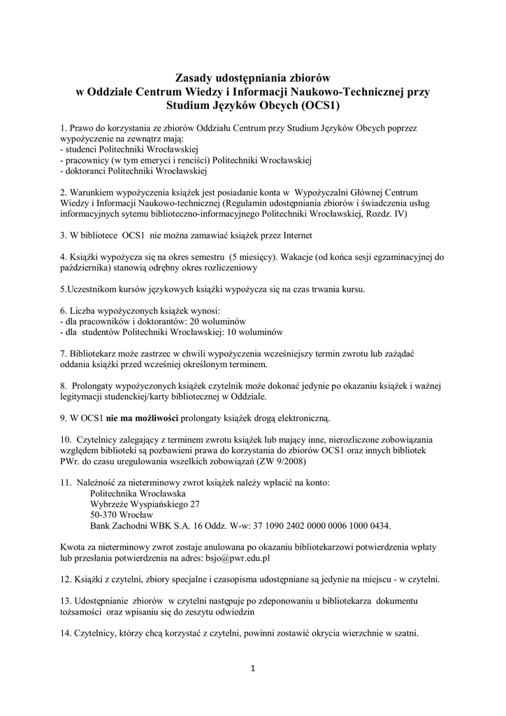 Zasady udostępniania zbiorów w Oddziale Centrum Wiedzy i Informacji Naukowo-Technicznej przy Studium Języków Obcych (OCS1) 1. Prawo do korzystania ze zbiorów Oddziału Centrum przy Studium Języków Obcych poprzez wypożyczenie na zewnątrz mają: - studenci Politechniki Wrocławskiej - pracownicy (w tym emeryci i renciści) Politechniki Wrocławskiej - doktoranci Politechniki Wrocławskiej 2. Warunkiem wypożyczenia książek jest posiadanie konta w Wypożyczalni Głównej Centrum Wiedzy i Informacji Naukowo-technicznej (Regulamin udostępniania zbiorów i świadczenia usług informacyjnych sytemu biblioteczno-informacyjnego Politechniki Wrocławskiej, Rozdz. IV) 3. W bibliotece OCS1 nie można zamawiać książek przez Internet 4. Książki wypożycza się na okres semestru (5 miesięcy). Wakacje (od końca sesji egzaminacyjnej do października) stanowią odrębny okres rozliczeniowy 5.Uczestnikom kursów językowych książki wypożycza się na czas trwania kursu. 6. Liczba wypożyczonych książek wynosi: - dla pracowników i doktorantów: 20 woluminów - dla studentów Politechniki Wrocławskiej: 10 woluminów 7. Bibliotekarz może zastrzec w chwili wypożyczenia wcześniejszy termin zwrotu lub zażądać oddania książki przed wcześniej określonym terminem. 8. Prolongaty wypożyczonych książek czytelnik może dokonać jedynie po okazaniu książek i ważnej legitymacji studenckiej/karty bibliotecznej w Oddziale. 9. W OCS1 nie ma możliwości prolongaty książek drogą elektroniczną. 10. Czytelnicy zalegający z terminem zwrotu książek lub mający inne, nierozliczone zobowiązania względem biblioteki są pozbawieni prawa do korzystania do zbiorów OCS1 oraz innych bibliotek PWr. do czasu uregulowania wszelkich zobowiązań (ZW 9/2008) 11. Należność za nieterminowy zwrot książek należy wpłacić na konto: Politechnika Wrocławska Wybrzeże Wyspiańskiego 27 50-370 Wrocław Bank Zachodni WBK S.A. 16 Oddz. W-w: 37 1090 2402 0000 0006 1000 0434. Kwota za nieterminowy zwrot zostaje anulowana po okazaniu bibliotekarzowi potwierdzenia wpłaty lub przesłania potwierdzenia na adres: [email protected] 12. Książki z czytelni, zbiory specjalne i czasopisma udostępniane są jedynie na miejscu - w czytelni. 13. Udostępnianie zbiorów w czytelni następuje po zdeponowaniu u bibliotekarza dokumentu tożsamości oraz wpisaniu się do zeszytu odwiedzin 14. Czytelnicy, którzy chcą korzystać z czytelni, powinni zostawić okrycia wierzchnie w szatni. 1 15. W bibliotece zabrania się spożywania posiłków, rozmawiania przez telefon komórkowy, prowadzenia głośnych rozmów. 16. Decyzje w innych sprawach związanych z udostępnianiem zbiorów, nieuwzględnione w zasadach, podejmuje Dyrektor Centrum Wiedzy i Informacji Naukowo-Technicznej w porozumieniu z Dyrektorem Studium Języków Obcych. 2