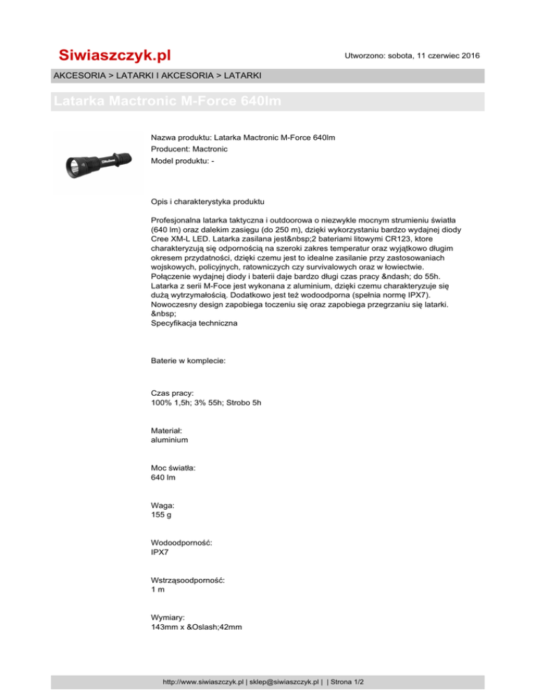 Siwiaszczyk.pl Utworzono: sobota, 11 czerwiec 2016 AKCESORIA > LATARKI I AKCESORIA > LATARKI Latarka Mactronic M-Force 640lm Nazwa produktu: Latarka Mactronic M-Force 640lm Producent: Mactronic Model produktu: - Opis i charakterystyka produktu Profesjonalna latarka taktyczna i outdoorowa o niezwykle mocnym strumieniu światła (640 lm) oraz dalekim zasięgu (do 250 m), dzięki wykorzystaniu bardzo wydajnej diody Cree XM-L LED. Latarka zasilana jest 2 bateriami litowymi CR123, ktore charakteryzują się odpornością na szeroki zakres temperatur oraz wyjątkowo długim okresem przydatności, dzięki czemu jest to idealne zasilanie przy zastosowaniach wojskowych, policyjnych, ratowniczych czy survivalowych oraz w łowiectwie. Połączenie wydajnej diody i baterii daje bardzo długi czas pracy – do 55h. Latarka z serii M-Foce jest wykonana z aluminium, dzięki czemu charakteryzuje się dużą wytrzymałością. Dodatkowo jest też wodoodporna (spełnia normę IPX7). Nowoczesny design zapobiega toczeniu się oraz zapobiega przegrzaniu się latarki. Specyfikacja techniczna Baterie w komplecie: Czas pracy: 100% 1,5h; 3% 55h; Strobo 5h Materiał: aluminium Moc światła: 640 lm Waga: 155 g Wodoodporność: IPX7 Wstrząsoodporność: 1m Wymiary: 143mm x Ø42mm http://www.siwiaszczyk.pl | [email protected] | | Strona 1/2 Siwiaszczyk.pl Utworzono: sobota, 11 czerwiec 2016 AKCESORIA > LATARKI I AKCESORIA > LATARKI Latarka Mactronic M-Force 640lm Zasięg światła: 250 m Zasilanie: 2 x 3V CR123A Źrodło światła: CREE XM-L LED Cena: 180.00zł Dostępność: Ten produkt został dodany do sklepu w dniu piątek, 10 czerwiec 2016 http://www.siwiaszczyk.pl | [email protected] | | Strona 2/2