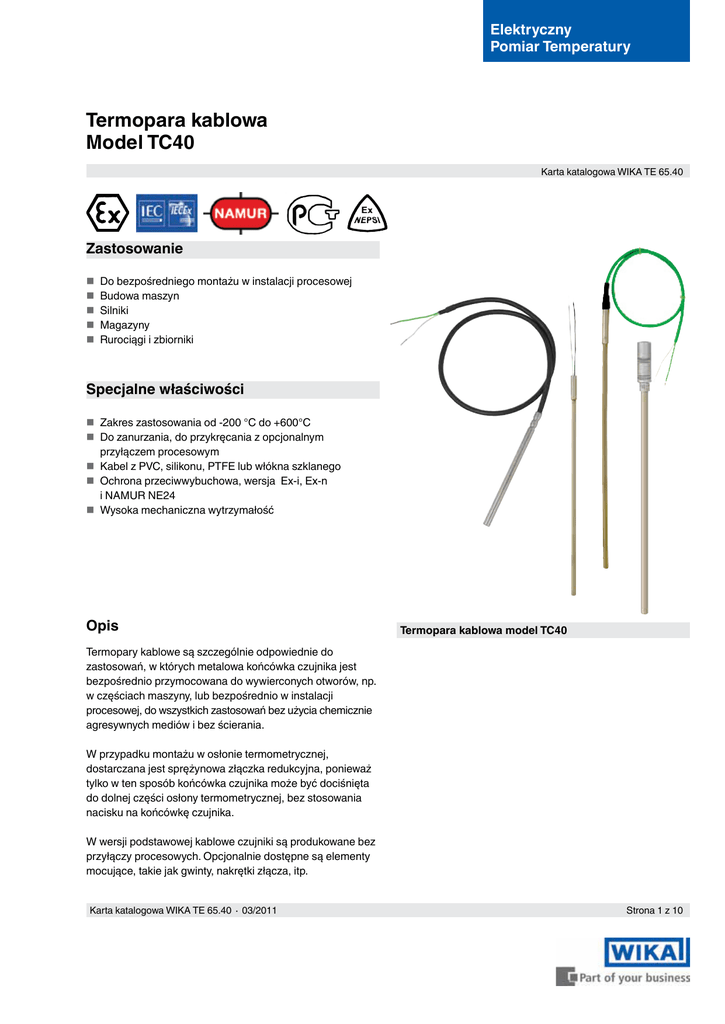 Elektryczny Pomiar Temperatury Termopara kablowa Model TC40 Karta katalogowa WIKA TE 65.40 Zastosowanie Do bezpośredniego montażu w instalacji procesowej Budowa maszyn Silniki Magazyny Rurociągi i zbiorniki Specjalne właściwości Zakres zastosowania od -200 °C do +600°C Do zanurzania, do przykręcania z opcjonalnym przyłączem procesowym Kabel z PVC, silikonu, PTFE lub włókna szklanego Ochrona przeciwwybuchowa, wersja Ex-i, Ex-n i NAMUR NE24 Wysoka mechaniczna wytrzymałość Opis Termopara kablowa model TC40 Termopary kablowe są szczególnie odpowiednie do zastosowań, w których metalowa końcówka czujnika jest bezpośrednio przymocowana do wywierconych otworów, np. w częściach maszyny, lub bezpośrednio w instalacji procesowej, do wszystkich zastosowań bez użycia chemicznie agresywnych mediów i bez ścierania. W przypadku montażu w osłonie termometrycznej, dostarczana jest sprężynowa złączka redukcyjna, ponieważ tylko w ten sposób końcówka czujnika może być dociśnięta do dolnej części osłony termometrycznej, bez stosowania nacisku na końcówkę czujnika. W wersji podstawowej kablowe czujniki są produkowane bez przyłączy procesowych. Opcjonalnie dostępne są elementy mocujące, takie jak gwinty, nakrętki złącza, itp. Karta katalogowa WIKA TE 65.40 ∙ 03/2011 Strona 1 z 10 Typ E Sensor Typ sensora Typ K (NiCr-Ni) J (Fe-CuNi) E (NiCr-CuNi) T (Cu-CuNi) N (NiCrSi-NiSi) Klasa Dopuszczalna max. temperatura pracy 1200 °C 800 °C 800 °C 400 °C 1200 °C Zakres zastosowania termopary jest ograniczony poprzez max. dopuszczalną temperaturę pracy termopary, jak również przez max. dopuszczalną temperaturę pracy materiału osłony termometrcznej. Jeśli temperatura pomiaru jest większa niż dopuszczalna temperatura w punkcie dostępu kablowego, odległość między przejściem kabli i temperaturą krytyczna musi zostać odpowiednio dostosowana poprzez zwiększenie długości czujnika Wymienione typy sensorów są dostępne jako pojedyncze jak i podwójne termopary.Termoelement jest dostarczany z izolwanym punktem pomiarowym, w przypadku gdy nie została podana inna informacja. Błąd graniczny W przypadku błędu granicznego termopar, jako ich podstawa brana jest temperatura 0 °C zimnego złącza Zakres temperatury DIN EN 60 584 część 2 1 -40 °C... +375 °C 1 +375 °C...+1000 °C 2 -40 °C... +333 °C 2 +333 °C...+1200 °C ISA (ANSI) MC96.1-1982 Standard 0 °C...+1250 °C Specjalny 0 °C...+1250 °C Błąd graniczny ± 1,5 °C ± 0,0040 ∙ | t | 1) ± 2,5 °C ± 0,0075 ∙ | t | 1) ± 2,2 °C lub 2) ± 0,75 % ± 1,1 °C lub 2) ± 0,4 % Klasa Zakres temperatury DIN EN 60 584 Tczęść 2 1 -40 °C...+125 °C 1 +125 °C...+350 °C 2 -40 °C...+133 °C 2 +133 °C...+350 °C Błąd graniczny ± 0,5 °C ± 0,0040 ∙ | t | 1) ± 1,0 °C ± 0,0075 ∙ | t | 1) Typ N Klasa Zakres temperatury DIN EN 60 584 Teil 2 1 -40 °C... +375 °C 1 +375 °C...+1000 °C 2 -40 °C... +333 °C 2 +333 °C...+1200 °C Błąd graniczny ± 1,5 °C ± 0,0040 ∙ | t | 1) ± 2,5 °C ± 0,0075 ∙ | t | 1) 1) I t I oznacza wartość temperatury w °C bez uwzględnienia znaku. 2) Obowiązuje do większych warości. Błąd graniczny przy określonej temperaturze w °C dla termopary Typ K i Typ J 0 Zakres temperatury Błąd graniczny ± 1,5 100 ± 1,5 300 ± 1,5 200 400 ± 1,5 ± 1,6 500 ± 2,0 700 ± 2,8 600 800 1000 DIN EN 60 584 cz 2 1 -40 °C...+375 °C 1 +375 °C...+750 °C 2 -40 °C...+333 °C 2 +333 °C...+750 °C ISA (ANSI) MC96.1-1982 Standard 0 °C...+750 °C Specjalny 0 °C...+750 °C Strona 2 z 10 ± 1,5 °C ± 0,0040 ∙ | t | 1) ± 2,5 °C ± 0,0075 ∙ | t | 1) Typ T 900 Typ J Klasa DIN EN 60 584 Teil 2 1 -40 °C... +375 °C 1 +375 °C... +800 °C 2 -40 °C... +333 °C 2 +333 °C... +900 °C Błąd graniczny Temperatura Błąd graniczny DIN EN 60 584 część 2 (ITS 90) Klasa 1 Klasa 2 °C °C °C Typ K Klasa Zakres temperatury 1100 1200 ± 2,50 ± 2,50 ± 2,50 ± 2,50 ± 3,00 ± 3,75 ± 2,4 ± 4,50 ± 3,2 ± 6,00 ± 3,6 ± 5,25 ± 6,75 ± 4,0 ± 7,50 ± 4,8 ± 9,00 ± 4,4 ± 8,25 ± 1,5 °C ± 0,0040 ∙ | t | 1) ± 2,5 °C ± 0,0075 ∙ | t | 1) ± 2,2 °C lub 2) ± 0,75 % ± 1,1 °C lub 2) ± 0,4 % Karta katalogowa WIKA TE 65.40 ∙ 03/2011 Możliwa niepewność pomiarowa w wyniku wpływu procesu starzenia Starzenie termopar powoduje zmianę krzywej temperatury/ termoelektrycznej. Termopary typu J starzeją się nieznacznie zależnie od utleniania końcówek z czystego metalu. Jeżeli chodzi o termopary typu K oraz mniej rozpowszechnionego typu N (NiCrSi-NiSi) mogą wystąpić wyraźne zmiany w napięciu termoelektrycznym przy wysokich temperaturach ze względu na ubytek chromu w nóżce NiCr, co powoduje obniżenie napięcia termoelektrycznego. W wypadku niedoboru tlenu takie działanie jest przyspieszone, ponieważ nie może się stworzyć pełna warstwa tlenku na powierzchni termopary, chroniąca przed dalszą oksydacją. Chrom w stopach utlenia się, ale nikiel nie powodując wzrost nalotu („zielonego butwienia”) powodującego w końcu uszkodzenie termopary. Podczas szybkiego chłodzenia termopar NiCr-Ni, pracujących w temperaturze powyżej 700 °C, występują pewne stany w strukturze krystalicznej (uporządkowanie bliskiego zasięgu), które w elementach typu K mogą powodować zmianę napięcia termoelektrycznego do 0,8 mV (efekt K). Możliwe jest obniżenie działania uporządkowania bliskiego zasięgu w termoparach typu N poprzez wprowadzenie składnika stopowego obu końcówek z silikonem. Działanie jest nieodwracalne i nie może być skasowane przez odprężanie w temperaturze powyżej 700 °C z następującym wolnym schładzaniem. W razie termopar o mniejszych średnicach w tym zakresie ich reakcja jest czuła. Nawet schładzanie w nieruchomym powietrzu powoduje większe odchylenia od 1 K. Konstrukcja końcówki czujnika Izolowany punkt pomiarowy Termopara Punkt pomiarowy Nieizolowany punkt pomiarowy Termopara Punkt pomiarowy Średnica p