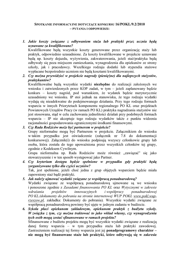 SPOTKANIE INFORMACYJNE DOTYCZĄCE KONKURSU 16/POKL/9.2/2010 – PYTANIA I ODPOWIEDZI: 1. Jakie koszty związane z odbywaniem stażu lub praktyki przez ucznia będą uznawane za kwalifikowane? Kwalifikowane będą wszystkie koszty generowane przez organizację staży lub praktyk, odpowiednio uzasadnione. Za koszty kwalifikowane w projekcie uznawane będą np. koszty dojazdu, wyżywienia, zakwaterowania, jeżeli staż/praktyka będą odbywały się poza miejscem zamieszkania, wynagrodzenia dla opiekunów ze strony szkoły, jak i pracodawcy. Wszelkiego rodzaju dodatki lub stypendia stażowe wypłacane bezpośrednio uczniom nie będą kosztami kwalifikowanymi. 2. Czy można przewidzieć w projekcie nagrody (pieniężne) dla najlepszych stażystów, praktykantów? Kwalifikowalne będą wszystkie wydatki niezbędne do realizacji założonych we wniosku i zatwierdzonych przez KOP zadań, w tym – jeżeli zaplanowany będzie konkurs – koszty nagród, pod warunkiem, że wydatek będzie merytorycznie uzasadniony we wniosku. IP stoi jednak na stanowisku, że tego rodzaju wydatki wydają się nieadekwatne do podejmowanego działania. Przy tego rodzaju formach wsparcia w innych Priorytetach komponentu regionalnego PO KL oraz projektach Powiatowych Urzędów Pracy (w ramach PO KL) praktyka nagradzania stażystów nie jest stosowana, stąd w celu zachowania jednolitości działań przy podobnych formach wsparcia – IP nie akceptuje tego rodzaju wydatków także z punktu widzenia racjonalności gospodarowania ograniczonymi środkami finansowymi. 3. Czy Rada Rodziców może być partnerem w projekcie? Grupy nieformalne mogą być Partnerem w projekcie. Załącznikiem do wniosku w takim przypadku jest oświadczenie (załącznik nr 7.8 do dokumentacji konkursowej). Załącznik(i) do wniosku podpisują wszyscy członkowie grupy lub osoba, która została do tego upoważniona przez wszystkich członków tej grupy, zgodnie z Kodeksem Cywilnym. Grupa nieformalna np. Rada Rodziców może również „zawiązać” się jako stowarzyszenie i w ten sposób występować jako Partner. 4. Czy kryterium dostępu będzie spełnione w przypadku gdy praktyki będą zorganizowane tylko dla części uczniów? Tak, jest spełnione, jeżeli choć jedna z grup objętych wsparciem będzie miała zapewniony staż bądź praktyki. 5. Jak należy ujmować wydatki związane ze współpracą ponadnarodową? Wydatki związane ze współpracą ponadnarodową ujmowane są we wniosku i ponoszone zgodnie z Zasadami finansowania PO KL oraz Wytycznymi w zakresie wdrażania projektów innowacyjnych i współpracy ponadnarodowej PO KL.(dokumenty do pobrania na stronie internetowej WUP POKL www.pokl.wuprzeszow.pl, zakładka: Dokumenty do pobrania). Wszystkie wydatki związane ze współpracą ponadnarodową powinny być ujęte w jednym zadaniu w budżecie. 6. Szkoła płaci opiekunom zakładowym, opiekunom praktyk z budżetu szkoły. W związku z tym, czy można traktować to jako wkład własny, czy wynagrodzenia tych osób mogą zostać sfinansowane w ramach projektu? Sfinansowane z budżetu projektu mogą być wszystkie wydatki związane z realizacją danej formy wsparcia – w tym przypadku stażu lub praktyki zawodowej. Zastrzeżeniem realizacji tej formy wsparcia jest jej ponadprogramowy charakter – nie mogą być finansowane staże lub praktyki, które odbywają się w zakresie czasu i formy, która jest obowiązkowa dla danej szkoły/kierunku/rocznika itp. Jednocześnie, w przypadku wkładu własnego pieniężnego – każdy wydatek może zostać pokryty ze środków JST i stanowić wkład własny rozliczany w projekcie, w tym wynagrodzenia opiekunów. 7. Czy odbywanie stażu/praktyki przez ucznia jest obowiązkowe w ramach projektu? Nie. W ramach konkursu postawiono kryterium dostępu dotyczące nawiązywania współpracy z przedsiębiorstwami, ale niekoniecznie w formie staży lub praktyk. 8. Czy określony jest czas trwania stażu/praktyk? Nie. Projektodawca winien ocenić czasookres tego rodzaju wsparcia z punktu widzenia przygotowania uczestnika projektu do podjęcia pracy. 9. Czy Partnerem w projekcie może być inna szkoła? Tak. Projekt może być przygotowany dla kilku szkół, z których jedna jest liderem. Jeżeli szkoła ta jest jednostką organizacyjną tej samej JST – zakres współpracy pomiędzy nimi regulowany będzie uchwałą organu stanowiącego, a nie umową partnerską. Jeżeli szkoły zawiązujące partnerstwo mają różne organy prowadzące – umowa partnerska będzie zawiązywana pomiędzy nimi. 10. Co z trwałością projektu w przypadku, gdy wysyłamy uczniów na praktyki zagraniczne np. do Włoch w okresie trwania projektu, a po jego zakończeniu tego zaprzestajemy? Nie jest to rozwiązanie cechujące się trwałością w odniesieniu do placówki, jeżeli dotyczy doraźnej pomocy dla konkretnej grupy uczniów. W takich przypadkach, trwałości projektu będziemy szukać w tworzeniu nowych form nauczania, czy doskonaleniu systemu organizacji praktyk zawodowych, nawiązywaniu STAŁEJ współpracy z jednostką zagraniczną, czy przeszkoleniu nauczycieli. 11. Jak ma się do praktyk Prawo o zamówieniach publicznych? Każdorazowo w przypadku zlecania usług Beneficjent zobowiązany jest do stosowania prawa zamówień publicznych, a jeżeli ustawa go nie dotyczy – Zasady konkurencyjności, co wynika z umowy o dofinansowanie projektu. 12. Czy tylko przedsiębiorstwo może być Partnerem w projekcie? Niekoniecznie. Partnerstwo zawiązywane jest w celu sprawniejszej realizacji zadań założonych w projekcie – niekoniecznie z przedsiębiorcą. Jednocześnie zastrzeżenie dotyczące nawiązywania współpracy z przedsiębiorcami nie musi (choć może) być realizowane za pomocą partnerstwa – może je wypełnić również opisując planowane zaangażowane przedsiębiorców na niektórych etapach realizacji projektu. 13. Jak ma się równość płci do zarządzania projektem? Równościowy sposób za