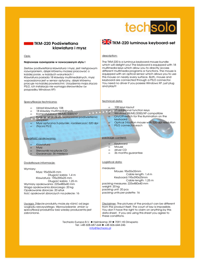 TKM-220 luminous keyboard-set TKM-220 Podświetlana klawiatura i mysz Opis: description: Najnowsze rozwiązanie w nowoczesnym stylu ! The TKM-220 is a luminous keyboard-mouse bundle which will delight you! The keyboard is equipped with 18 multimedia keys which allow you to directly access different multimedia programs or functions. The mouse is equipped with an optical sensor which allows you to use this mouse on nearly every surface. Both, mouse and keyboard are connected through a PS/2 connector. You need no driver if you possess Windows XP, just plug and play!!! Zestaw podświetlana klawiatura i mysz, jest nietypowym rozwiązaniem, dzięki któremu moŜesz pracować o kaŜdej porze, w kaŜdych warunkach ! Klawiatura posiada 18 klawiszy multimedialnych, mysz wyposaŜona jest w sensor optyczny, dzięki któremu pracuje na kaŜdej powierzchni. Urządzenia maja złącza PS/2, ich instalacja nie wymaga sterowników (w przypadku Windows XP) technical data: Specyfikacja techniczna: • • • • • • Układ klawiatury 108 18 klawiszy multimedialnych Kompatybilne z 98/ME/2000/XP Funkcja włączania i wyłączania podświetlenia urządzeń Mysz optyczna 3-przyciski, rozdzielczość 520 dpi Złącza PS/2 • • 108 keys layout 18 additional function keys Windows 98/ME/2000/XP compatible On/Off-switch for the illumination on the keyboard Optical 3-button mouse with 520 dpi resolution PS/2 connector each package content: Zawartość opakowania: • • • • • • • • Klawiatura Mysz Sterowniki na płycie CD Gwarancja: 36 miesięcy • • • • Keyboard Mouse driver CD 36 months guarantee Dodatkowe informacje: Logistical data: Wymiary: Mysz: 95x55x35 mm Długość kabla: 1,4 m Klawiatura: 195x390x25 mm Długość kabla: 1,25 m Wymiary opakowania: 225x480x40 mm Waga opakowania zbiorczego: 20 kg Opakowanie zbiorcze: 20 sztuk Ilość opakowań zbiorczych na palecie: 16 measures: Mouse: 95x55x35mm Cable length: 1,4 m Keyboard:195x390x25mm Cable length: 1,25 m packing measures: 225x480x40 mm weight: 20 kg packing unit: 20 pcs packing units per palette: 16 Uwaga: Zdjęcie produktu moŜe się róŜnić od jego wyglądu rzeczywistego. Wprowadzanie zmian w specyfikacji produktów bez wiedzy producenta jest zabronione. Disclaimer: The pictures of the product can be different from the product itself. The court of law is impossible. You don’t have the right to claim on anything by this data sheet. If you are using this sheet you agree to these conditions. Techsolo Europa B.V. Helmkamp 39 7091 HS Dinxperlo Tel: +48 608-687-644 +48 606-644-246 [email protected]