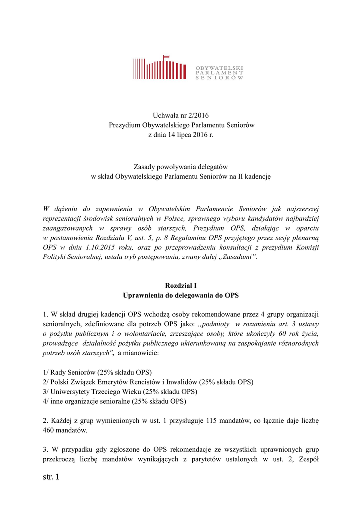 Uchwała nr 2/2016 Prezydium Obywatelskiego Parlamentu Seniorów z dnia 14 lipca 2016 r. Zasady powoływania delegatów w skład Obywatelskiego Parlamentu Seniorów na II kadencję W dążeniu do zapewnienia w Obywatelskim Parlamencie Seniorów jak najszerszej reprezentacji środowisk senioralnych w Polsce, sprawnego wyboru kandydatów najbardziej zaangażowanych w sprawy osób starszych, Prezydium OPS, działając w oparciu w postanowienia Rozdziału V, ust. 5, p. 8 Regulaminu OPS przyjętego przez sesję plenarną OPS w dniu 1.10.2015 roku, oraz po przeprowadzeniu konsultacji z prezydium Komisji Polityki Senioralnej, ustala tryb postępowania, zwany dalej „Zasadami”. Rozdział I Uprawnienia do delegowania do OPS 1. W skład drugiej kadencji OPS wchodzą osoby rekomendowane przez 4 grupy organizacji senioralnych, zdefiniowane dla potrzeb OPS jako: „podmioty w rozumieniu art. 3 ustawy o pożytku publicznym i o wolontariacie, zrzeszające osoby, które ukończyły 60 rok życia, prowadzące działalność pożytku publicznego ukierunkowaną na zaspokajanie różnorodnych potrzeb osób starszych", a mianowicie: 1/ Rady Seniorów (25% składu OPS) 2/ Polski Związek Emerytów Rencistów i Inwalidów (25% składu OPS) 3/ Uniwersytety Trzeciego Wieku (25% składu OPS) 4/ inne organizacje senioralne (25% składu OPS) 2. Każdej z grup wymienionych w ust. 1 przysługuje 115 mandatów, co łącznie daje liczbę 460 mandatów. 3. W przypadku gdy zgłoszone do OPS rekomendacje ze wszystkich uprawnionych grup przekroczą liczbę mandatów wynikających z parytetów ustalonych w ust. 2, Zespół str. 1 powołany przez Prezydium OPS do prowadzenia akredytacji sporządzi listę kandydatów stosując dodatkowe kryteria doboru kandydatów, a mianowicie: 1/ zasięg działania delegującej organizacji obejmujący co najmniej województwo, 2/ liczebność członków lub podopiecznych nie mniejszą niż 200 zarejestrowanych osób, 3/ prowadzenie działalności od dnia zarejestrowania nie krócej niż 3 lata. 4. Osoby spełniające warunki ustalone w ust. 1-3, które nie znajdą się na liście delegatów, wpisane zostają na listę rezerwową w kolejności ustalonej w oparciu o poziom spełnienia kryteriów określonych w ust. 3 niniejszego Rozdziału. 5. Niewykorzystane mandaty wewnątrz grupy organizacji określonych w ust. 2 przydzielane są osobom znajdującym się na liście rezerwowej. 6. Delegaci zgłoszeni przez Rady Seniorów nie muszą spełniać kryteriów określonych w ust. 3 niniejszego Rozdziału. 7. Delegaci zakwalifikowani do udziału w II kadencji OPS, którzy nie przybędą bez ważnej udokumentowanej przyczyny i powiadomienia Prezydium na sesję plenarną inaugurującą kadencję i nie złożą ślubowania, są automatycznie pozbawieni mandatu delegata, a na ich miejsce powoływani są kandydaci z listy rezerwowej, o której mowa w ust. 4 niniejszego Rozdziału. 8. W przypadkach powołania do OPS delegatów z listy rezerwowej, ślubowanie od nowych delegatów w dodatkowo wyznaczonym terminie przyjmie Prezydium OPS. 9. Z listy rezerwowej powoływane są także, decyzją Prezydium OPS osoby w miejsce: 1/ delegatów, których mandaty wygasły z powodu śmierci; 2/ delegatów OPS, którzy złożyli pisemną rezygnację z pełnienia mandatu w OPS; 3/ delegatów, którzy z przyczyn losowych nie mogą wypełniać obowiązków delegata. 10. Delegaci do OPS powoływani są na okres kadencji trwającej 3 lata tj. od 01.10.2016 roku do 30.09.2019 roku. Rozdział II Regionalne charakter wyborów delegatów OPS 1. Zespół ds. akredytacji Prezydium OPS dokonując podziału mandatów uwzględni dane GUS dotyczące liczby osób powyżej 60 roku życia zamieszkałych w danym województwie. 2. Zespół ds. akredytacji Prezydium OPS zwróci się do wojewódzkich organów administracji rządowej i samorządowej z informacją o prowadzonej rekrutacji do OPS i możliwością rekomendowania organizacji senioralnych działających na terenie danego województwa. str. 2 3. Ostatecznej weryfikacji rekomendowanych organizacji pod kątem spełnienia warunków Zasad i Regulaminu OPS, dokonuje Zespół, o którym mowa w Rozdziale I. ust. 3, która przedkłada listę kandydatów do Prezydium OPS. Rozdział III Terminy zgłoszeń i odwołań 1.Zgłoszenie delegata do OPS odbywa się poprzez przesłanie formularza zgłoszeniowego, którego wzór stanowi załącznik nr 1 do niniejszych Zasad. 2. Akredytacja na nową kadencję prowadzona będzie od 15.07 do 15.09.2016 r. 3. Zgłoszenie może być przysłane pocztą na adres Sekretariatu OPS mieszczącego się pod adresem: Fundacja OP UTW ul. Gruszy 32, 04 -779 Warszawa, elektronicznie na adres: [email protected] lub faxem 22 615 24 46. 4.Weryfikację formalno-prawną, tj. zgodności z kryteriami formalnymi i parytetami określonymi w niniejszych Zasadach - przeprowadza powołany przez Prezydium OPS do prowadzenia akredytacji Zespół, który sporządza listy delegatów spełniających kryteria w sposób nie budzący wątpliwości i listy delegatów do dalszych decyzji Prezydium i Konwentu. 5.Decyzje w sprawach: 1/ powołania w skład delegatów kandydatów spełniających kryteria formalne i mieszczących się w ustalonych parytetach; 2/ odmowy wpisania na listę delegatów wskutek niespełnienia kryteriów określonych w niniejszych Zasadach, 3/ powołania w skład delegatów osób z listy rezerwowej w przypadkach określonych w Zasadach, podejmuje Prezydium OPS. 6. Odwołania od odmownej decyzji Prezydium w sprawie wpisania na listę delegatów, zainteresowane organizacje mogą składać w terminie do 7 dni od dnia powiadomienia o odmowie, tj. od daty wysłania informacji drogą elektroniczną. 7. Decyzje w sprawie odwołań od decyzji odmownych rozpatruje i akceptuje na wniosek Prezydium Konwent OPS, przy obecności co najmniej 50% składu Konwentu. Decyzje zapadają zwykłą większością głosów i podejmowane są w terminie do 7 dni od daty wpłynięcia odwo