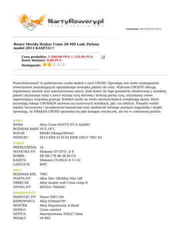 Utworzono: 2017-03-04 01:46:13 Rower Merida Drakar Cross 20-MD Lady Zielony model 2013 KASETA!!! Cena produktu: 1 549,00 PLN 1 129,00 PLN Koszt dostawy: 0,00 PLN Dostępność: Wszechstronność to podstawowa cecha modeli z serii CROSS. Sprostają one wielu wymaganiom rowerzystów poszukujących optymalnego stosunku jakości do ceny. Wybrane CROSSY oferują regulowany mostek oraz amortyzowaną sztycę. Jeśli dodać do tego geometrię zbudowanej z wysokiej jakości aluminium ramy z nieco wyższą rurą sterową i krótszą górną rurą, otrzymamy rower zapewniający wygodną pozycję. Komfort jazdy na wielu nawierzchniach zwiększają opony, które pozwalają mknąć CROSSEM zarówno na szutrowych ścieżkach, jak i na asfalcie. Ponadto wybór między tarczowymi i szczękowymi hamulcami oraz możliwość łatwego montażu bagażnika i stopki sprawiają, że DRAKAR CROSS sprawdza się jako kompan wycieczek, ale też w codziennej jeździe. RAMA RAMA Alloy Cross MATTS DT-D AL6061 ROZMIAR RAMY 16"L-18"L KOLOR KHAKI [Mango/White] WIDELEC SF12-NEX 4110-V4 DISK ONLY 700C 63 NAPĘD PRZEŁOŻENIA MANETKA P/T KORBA KASETA ŁAŃCUCH 24 Shimano ST-EF51 3/ 8 SR XR-178 48-38-28 CG Shimano CS-HG31-8 11-32 KMC KOŁA ROZMIAR KÓŁ PIASTA P/T OBRĘCZE OPONA P/T 700C Alloy Disc QR/Alloy Disc QR Alloy double wall Cross comp D KENDA 700x40C KOMPONENTY HAMULEC P/T KIEROWNICA MOSTEK SIODŁO SZTYCA PEDAŁY Hayes MX5 160 Alloy 620mm*30° Alloy Regulowany A-Head Cross comfort Amortyzowana 350x27.2mm VP-893 Sugerowana wielkość ramy według wzrostu użytkownika dla rowerów trekkingowych : Wzrost Długość nogi Rama stopy & cale cm cale +/- 1 cm +/- 2.5 cale cm 5.0+ 152 28 71 15 38 5.2+ 157 28 71 16 41 5.4+ 162 29 74 17 43 5.6+ 167 29 74 18 46 5.8+ 172 30 76 19 48 5.9+ 175 30 76 20 51 5.10+ 177 31 79 21 53 6.0+ 182 33 84 22 56 6.2+ 187 34 86 23 58 6.4+ 192 35 89 22 56 Dlaczego warto wybrać sklep NartyRowery.pl ? ● ● ● ● ● ● ● ● ● ● ● ● ● Darmowa Przesyłka Kurierska dla zamówień już od 400 PLN Szybka dostawa w 24h Możliwość zwrotu lub wymiany towaru w ciągu 10 dni od zakupu W naszym sklepie internetowym są tylko aktualnie dostępne produkty (zredukowaliśmy do minimum ryzyko braku dostępności zamówionego towaru) Możliwość negocjacji cen Częste promocje i rabaty ( obniżki cen, rabat na akcesoria, gratisy do rowerów) Fachowe doradztwo Pozytywne opinie w niezależnych serwisach m.in. Opineo, Allegro i porównywarkach cen Możliwość zakupu na raty - obsługujemy systemy Żagiel i Cetelem Sprzedajemy rowery wyregulowane i przesmarowane Do każdego zamówienia otrzymasz paragon lub fakturę stanowiący podstawę gwarancji Szczegółowe informacje o statusie zamówienia i wysyłce na adres e-mail podany w zamówieniu Obsługujemy płatności internetowe i Paypal Dołożono wszelkich starań, aby opisy i zdjęcia produktów były dokładne i aktualne. Specyfikacje i ceny mogą ulec zmianie bez uprzedzenia Płeć Damski Widelec/ amortyzator SF12-NEX 4110-V4 DISK ONLY 700C 63 Manetki Shimano ST-EF51 3 / Shimano ST-EF51 8 Przeznaczenie Cross, Miejski Przerzutka przód Shimano M191 Przerzutka tył Shimano Altus Kaseta/ wolnobieg Korbowód Pedały Shimano CS-HG31-8 11-32 SR XR-178 48-38-28 CG VP-893 Piasta przód Alloy Disc QR Piasta tył Alloy Disc QR Obręcze Alloy double wall Cross comp D Hamulce Hayes MX5 160 Szprychy b.d. Kolekcja 2013 Opony KENDA 700x40C Stery b.d. Mostek Kierownica Alloy Regulowany A-Head Alloy 620mm*30° Chwyty b.d. Siodło Cross comfort Sztyca Amortyzowana 350x27.2mm Waga b.d. Rama Alloy Cross MATTS DT-D AL6061 Hamulce Tarczowe mechaniczne Damper - Ilość biegów 24 Pegi b.d. Łańcuch b.d. Gwarancja Adres: http://nartyrowery.pl/ 24 miesiące na ramę i osprzęt Telefon: 34 365 66 09, 793 61 04 29 Email: [email protected] Gadu-Gadu: Skype: