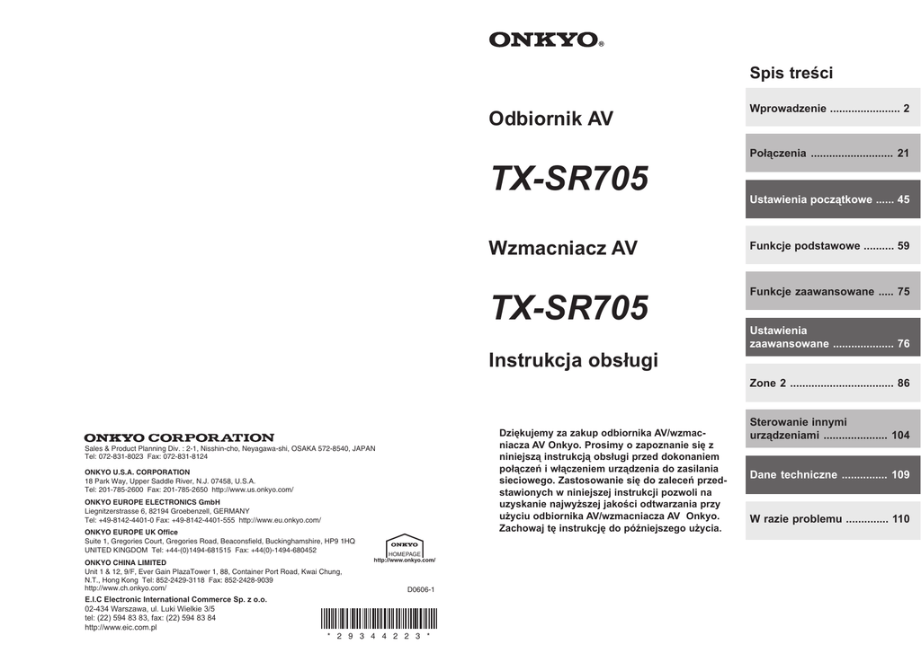 Spis treści Odbiornik AV TX-SR705 Wprowadzenie ....................... 2 Połączenia ........................... 21 Ustawienia początkowe ...... 45 Wzmacniacz AV Funkcje podstawowe .......... 59 TX-SR705 Funkcje zaawansowane ..... 75 Instrukcja obsługi Ustawienia zaawansowane .................... 76 Zone 2 .................................. 86 Dziękujemy za zakup odbiornika AV/wzmacniacza AV Onkyo. Prosimy o zapoznanie się z niniejszą instrukcją obsługi przed dokonaniem połączeń i włączeniem urządzenia do zasilania sieciowego. Zastosowanie się do zaleceń przedstawionych w niniejszej instrukcji pozwoli na uzyskanie najwyższej jakości odtwarzania przy użyciu odbiornika AV/wzmacniacza AV Onkyo. Zachowaj tę instrukcję do późniejszego użycia. Sales & Product Planning Div. : 2-1, Nisshin-cho, Neyagawa-shi, OSAKA 572-8540, JAPAN Tel: 072-831-8023 Fax: 072-831-8124 ONKYO U.S.A. CORPORATION 18 Park Way, Upper Saddle River, N.J. 07458, U.S.A. Tel: 201-785-2600 Fax: 201-785-2650 http://www.us.onkyo.com/ ONKYO EUROPE ELECTRONICS GmbH Liegnitzerstrasse 6, 82194 Groebenzell, GERMANY Tel: +49-8142-4401-0 Fax: +49-8142-4401-555 http://www.eu.onkyo.com/ ONKYO EUROPE UK Office Suite 1, Gregories Court, Gregories Road, Beaconsfield, Buckinghamshire, HP9 1HQ UNITED KINGDOM Tel: +44-(0)1494-681515 Fax: +44(0)-1494-680452 ONKYO CHINA LIMITED Unit 1 & 12, 9/F, Ever Gain PlazaTower 1, 88, Container Port Road, Kwai Chung, N.T., Hong Kong Tel: 852-2429-3118 Fax: 852-2428-9039 http://www.ch.onkyo.com/ E.I.C Electronic International Commerce Sp. z o.o. 02-434 Warszawa, ul. Luki Wielkie 3/5 tel: (22) 594 83 83, fax: (22) 594 83 84 http://www.eic.com.pl (C) Copyright 2006 ONKYO CORPORATION Japan. All rights reserved. 92 HOMEPAGE http://www.onkyo.com/ D0606-1 * 2 9 3 4 4 2 2 3 * Sterowanie innymi urządzeniami ..................... 104 Dane techniczne ............... 109 W razie problemu .............. 110 OSTRZEŻENIE: ABY ZMINIMALIZOWAĆ RYZYKO POŻARU LUB PORAŻENIA PRĄDEM ELEKTRYCZNYM, NIE WYSTAWIAJ URZĄDZENIA NA DESZCZ LUB WILGOĆ. UWAGA: ABY ZMINIMALIZOWAĆ RYZYKO PORAŻENIA PRĄDEM ELEKTRYCZNYM NIE ZDEJMUJ POKRYWY URZĄDZENIA. WEWNĄTRZ URZĄDZENIA NIE ZNAJDUJĄ SIĘ ŻADNE ELEMENTY, KTÓRE MOGŁYBY BYĆ REGULOWANE PRZEZ UŻYTKOWNIKA. WARNING RISK OF ELECTRIC SHOCK DO NOT OPEN AVIS Notatki RISQUE DE CHOC ELECTRIQUE NE PAS OUVRIR Symbol błyskawicy w równoramiennym trójkącie ostrzega użytkownika o istnieniu niebezpiecznego napięcia wewnątrz urządzenia, które może być niebezpieczne w wypadku nieodpowiedniego użytkowania urządzania. Symbol wykrzyknika zawartego w równobocznym trójkącie informuje o istnieniu szczególnie ważnych instrukcji zawartych w piśmiennictwie dołączonym do urządzenia. Ważne informacje dotyczące bezpieczeństwa 1. 2. 3. 4. 5. 6. 7. 8. 9. 10. 11. 12. 13. 14. Przeczytaj instrukcję. Zachowaj instrukcję. Stosuj się do ostrzeżeń. Stosuj się do zaleceń instrukcji. Nie używaj urządzenia w pobliżu wody. Czyść urządzenie jedynie przy użyciu suchej ściereczki Nie blokuj otworów wentylacyjnych. Instaluj w zgodzie z zaleceniami producenta. Nie używaj urządzenia w pobliżu źródeł ciepła, takich jak grzejniki, urządzenia emitujące ciepło (włączając wzmacniacze) itp. Nie rozmontowuj uziemienia wtyku zasilania sieciowego. Wtyk zasilania z uziemieniem wyposażony jest w trzy bolce, bolec uziemienia jest grubszy od bolców zasilania. Jeśli wtyk zasilania nie pasuje do gniazda zasilania sieciowego, skonsultuj się z wykwalifikowanym elektrykiem w przedmiocie wymiany tego wtyku. Chroń przewód zasilania. Nie przygniataj go ani nie skręcaj. Zwróć szczególną uwagę na odcinki przewodu zasilania znajdujące się w pobliżu wtyku zasilania i w miejscu, w którym wychodzi on z urządzenia. Stosuj jedynie przewody połączeń i akcesoria zalecane przez producenta. Urządzenie jak i urządzenie wraz z wózkiem powinno być przemieszczane z zachowaniem należytej staranności. Nagłe zatrzymanie, gwałtowne ruszenie itp. może spowodować przewrócenie się urządzenia. Odłącz urządzenie z zasilania podczas burz, i gdy masz zamiar nie używać go przez dłuższy czas. Powierzaj serwisowanie urządzenia jedynie wykwalifikowanym specjalistom. Serwisowanie urządzenia jest konieczne, gdy zostanie ono uszkodzone w jakikolwiek sposób, w szczególności, gdy uszkodzony zostanie przewód zasilania, gdy do urządzenia dostaną się ciecze lub obce ciała, urządzenie zostanie wystawione na działanie deszczu lub wilgoci, nie działa normalnie, lub gdy zostanie upuszczone lub rzucone. 15. Uszkodzenia wymagające interwencji specjalisty W następujących sytuacjach odłącz urządzenie od zasilania i przekaż je wykwalifikowanemu specjaliście w celu dokonania naprawy: A. Uszkodzenie przewodu zasilania, B. Dostanie się płynu lub obcego przedmiotu do środka urządzenia, C. Wystawienie urządzenia na deszcz lub wilgoć, D. Niepoprawne działanie urządzenia mimo stosowania się do zaleceń instrukcji. W razie wystąpienia tego rodzaju sytuacji dokonaj jedynie koniecznych regulacji, gdyż dokonanie niepoprawnych zmian może doprowadzić do uszkodzenia urządzenia i konieczności zastosowania skomplikowanych procedur naprawy, E. Po upuszczeniu lub innego rodzaju mechanicznego uszkodzenia urządzenia, F. Wystąpienia anomalii w działaniu urządzenia. 16. Obce przedmioty i ciecze wewnątrz urządzenia - Nigdy nie wpychaj przedmiotów jakiegokolwiek rodzaju do urządzenia poprzez otwory, mogą one bowiem zetknąć się z elementami urządzenia znajdującymi się pod napięciem lub spowodować spięcie, czego wynikiem może być pożar lub porażenie prądem elektrycznym. Urządzenie nie powinno być wystawione na działanie cieczy (np. kapanie) i żadne przedmioty zawierające ciecze, takie jak np. wazony, nie powinny być ustawiane na urządzeniu. Nie stawiaj świec ani żadnych palących się przedmiotów na urządzeniu. 17. Baterie Zawsze bier