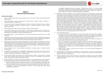 Taryfa opłat i prowizji Banku BPH S.A. dla Klientów Indywidualnych Załącznik nr 2 do Zarządzenia Nr …/PF/2016 z dnia … maja 2016 r. TARYFA 2. Rachunki lokat terminowych W przypadku wystąpienia tylko jednej z przyczyn, o których mowa w ppkt 1) i 2), zmiana nastąpi odpowiednio o Inflację albo o Zmianę przeciętnego wynagrodzenia i zgodnie z kierunkiem wyznaczonym przez wartość danego wskaźnika. W przypadku wystąpienia obu przyczyn, o których mowa w ppkt 1) i 2), zmiana nastąpi o sumę Inflacji oraz Zmiany przeciętnego wynagrodzenia. 13. Niezależnie od przyczyn wskazanych w pkt 12, Bank jest uprawniony do wprowadzenia nowych opłat i prowizji lub zmiany stawek opłat i prowizji, w przypadku wprowadzenia nowych lub zmiany przepisów prawa lub wymogów instytucji nadzorczych, związanych z funkcjonowaniem sektora bankowego i rynku usług finansowych (zwanych dalej Regulacjami). Uprawnienie to dotyczy wyłącznie sytuacji, gdy bezpośrednim skutkiem wprowadzenia lub zmiany Regulacji jest nałożenie na Bank obowiązku wprowadzenia nowych usług, opłat lub prowizji lub zmiana kosztów ponoszonych przez Bank w związku ze świadczonymi usługami. W takim przypadku, zmiana stawek dotyczyć będzie wyłącznie opłat i prowizji związanych z usługami, których koszty ulegają bezpośrednim zmianom w efekcie wprowadzenia lub zmian Regulacji, a kierunek i zakres zmian odpowiada kierunkowi i zakresowi zmian kosztów. W przypadku wprowadzenia nowych Regulacji lub zmian w Regulacjach innych niż przepisy prawa podatkowego, maksymalnie połowa kwoty, o jaką zmieni się koszt ponoszony przez Bank w związku z wykonywaniem danej usługi, zwiększy lub pomniejszy daną opłatę lub prowizję. Bank wprowadzi nowe opłaty i prowizje lub dokona zmiany stawek opłat i prowizji o czym poinformuje Klienta w sposób określony w umowie, nie później niż w terminie 6 miesięcy od daty wejścia w życie lub zmiany Regulacji, przy czym w komunikacji do Klientów związanej ze zmianą treści Taryfy, Bank wskaże zmienioną Regulację stanowiącą podstawę do zmian treści Taryfy, umożliwiając Klientom weryfikację podstawy, zakresu i kierunku zmian. 14. Strony uzgadniają również, że: 1) Bank jest uprawniony do wprowadzenia do Taryfy nowych opłat lub prowizji, które wynikają z wprowadzenia przez Bank nowych usług dla istniejących produktów, pod warunkiem, że korzystanie z tych usług, a tym samym ponoszenie przez Klienta opłat z ich tytułu nie będzie obligatoryjne. Zmiana ta możliwa jest w każdym czasie i nie jest uzależniona od przyczyn określonych w pkt 12. 2) Zmiana Taryfy polegająca na obniżeniu lub uchyleniu opłat lub prowizji w niej zawartych możliwa jest w każdym czasie i nie jest uzależniona od przyczyn określonych w pkt 12. 3) Bank może zrezygnować z podwyższenia wysokości wszystkich lub wybranych opłat lub prowizji w danym roku, pomimo zaistnienia przyczyn wskazanych w pkt 12 ppkt 1) i 2). W takim przypadku w kolejnym roku (o ile zaistnieją wspomniane przyczyny), Bank może dokonać podwyższenia wszystkich lub wybranych opłat lub prowizji o wartość nieprzekraczającą sumy Inflacji oraz Zmian przeciętnego wynagrodzenia w poprzednich latach, w których podwyżka nie miała miejsca (nie więcej jednak niż za trzy ostatnie lata). 4) Wysokość opłat i prowizji, o której mowa w pkt 12 ppkt 1) i 2), po zmianie ulegnie zaokrągleniu do pełnych dziesiątek groszy. Postanowienia ogólne 1. Użyte w niniejszej Taryfie opłat i prowizji określenia „Bank” lub „Bank BPH” należy rozumieć jako Bank BPH Spółka Akcyjna. 2. Bank pobiera opłaty i prowizje za realizowane czynności bankowe i faktyczne, zgodnie z zasadami i w wysokości określonej w niniejszej Taryfie. 3. Za czynności bankowe i faktyczne realizowane w Placówkach Partnerskich Banku pobierane są opłaty i prowizje w wysokości obowiązującej w Oddziałach Banku, z wyjątkiem przypadków, w których niniejsza Taryfa stanowi inaczej. 4. Bank ustala opłaty i prowizje za zlecone czynności w złotych lub walutach obcych. 5. Bank pobiera należne opłaty i prowizje zgodnie z obowiązującymi przepisami prawa w złotych lub w walutach obcych, dokonując przeliczenia stawek w złotych na walutę obcą lub odwrotnie, przy zastosowaniu obowiązujących w Banku BPH S.A. kursów kupna/sprzedaży walut. 6. Bank pobiera opłaty i prowizje niezależnie od innych opłat przewidzianych przepisami prawa, np. opłat skarbowych. 7. Niezależnie od opłat i prowizji wymienionych w niniejszej Taryfie, Bank pobiera w przypadku ich wystąpienia, opłaty i prowizje na rzecz banków pośredniczących w wykonywaniu zlecenia według odrębnych taryf lub według faktycznie poniesionych kosztów oraz równowartość kosztów przesyłek kurierskich. 8. Należne opłaty i prowizje Bank pobiera od zleceniodawcy czynności bankowej lub faktycznej, tj. od Klienta wydającego dyspozycję wykonania przez Bank BPH danej czynności osobiście lub przez uprawnione osoby trzecie, bezpośrednio lub za pośrednictwem dostępnych środków przekazu, z wyjątkiem poleceń wypłaty w obrocie dewizowym, za które należne opłaty Bank pobiera od zleceniodawcy lub beneficjenta, zależnie od uzgodnień między tymi stronami i praktyki bankowej. 9. Kwoty pobieranych opłat i prowizji podlegają zaokrągleniu do jednego grosza, na zasadach ogólnie obowiązujących. 10. W przypadku ofert specjalnych lub indywidualnie wynegocjowanych warunków umów w zakresie opłat i prowizji, lista czynności bankowych i faktycznych, za które Bank pobiera opłaty lub prowizje oraz ich wysokość może różnić się od zawartych w niniejszej Taryfie. 15. Za zaświadczenia lub opinie bankowe sporządzone na wniosek Klienta w ramach tej samej dyspozycji dotyczące kilku umów jednocześnie (w tym dla różnych produktów Banku), Bank pobiera jedną opłatę w wysokości określonej w niniejszej Taryfie. 11. Na wniosek Klienta Bank może w