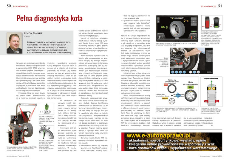 50 | ZENNOWACJE ZENNOWACJE | Pełna diagnostyka koła Literowy skrót w nazwie opisanej już tutaj wyważarki Hunter RFT oznacza Road Force Touch, a odnosi się zarówno do zastosowania ekranu dotykowego, jak i do pomiarów z użyciem rolki dociskowej W modelu tym zastosowano wszystkie dotychczasowe patenty i rozwiązania znane z poprzedniej serii GSP 9700, w tym bardzo skuteczny program SmartWeight® – oszczędzający ciężarki – i program sprawdzający centrowanie koła na wrzecionie. Obecnie jest to jedyna maszyna spełniająca najwyższe wymogi OEM takich producentów, jak Porsche i Subaru, a wszystkim używającym jej warsztatom daje możliwość całkowitej eliminacji drgań i znoszenia bocznego kół samochodowych. Innowacja, którą jest ekran dotykowy, bardzo ułatwia „komunikowanie” się z maszyną, ponieważ pozwala na Wyważarka diagnostyczna HUNTER Road Force Touch z 22-calowym ekranem dotykowym Autonaprawa | Wrzesień 2012 intuicyjne i bezpośrednie wybieranie funkcji dostępnych na obrazie (także za pomocą ręki w rękawicy lub dowolnego przedmiotu, np. klucza). Cały monitor odznacza się przy tym wysoką wytrzymałością mechaniczną. Ekran jest podzielony na strefy powiększające się dla ułatwienia odczytu w chwili wyboru danej funkcji (oznaczonej odpowiednią ikoną). Specyficzną funkcją jest np. automatyczne ustawienie koła przez maszynę w pozycji do umieszczenia ciężarka korekcyjnego z jednoczesnym dokładnym wskazaniem przez laser miejsca jego zamocowania. W odróżnieniu od starszych modeli standardowe wyposażenie nowej maszyny stanowi zestaw aż 10 podwójnych stożków centrujących o małej zbieżności, Piktogram oznaktóra poprawia stabilność czający włączoną funkcję samooraz precyzję mocowaczynnej kalibracji nia i centrowania kół na eCal™ wrzecionie. Innowacyjne jest także zastosowanie nowej generacji czujników zespolonych (kompensacyjnych) dla wyeliminowania czasochłonnej i zwyPiktogram sygnalizujący wykona kle kosztownej kalibracji nie procedury wyważania i testu wrzeciona standardowym drogowego ciężarkiem. W ewentuw zminimalizowanym czasie alnej potrzebie (np. jeśli Opisane tu funkcje diagnostyczne służą w pierwszej kolejności warsztatowej eliminacji drgań i znoszenia bocznego, a gdy okazuje się to niemożliwe, wskazują przyczynę takiego stanu, czyli tworzą ekspertyzy dla zainteresowanych klientów lub rzeczoznawców. Wyniki tych badań przedstawione w formie wykresów mogą stanowić podstawę reklamacji zgłaszanych producentom opon. Z tej wyważarki można bowiem uzyskać w różnych formatach wydruki wszystkich widoków ekranu i protokołów pomiarowych albo ich zapisy elektroniczne jako dokumenty typu PDF. Zaletą jest także użyta w oprogramowaniu najnowsza wersja systemu operacyjnego Linux. Zapewnia ona działanie w czasie rzeczywistym, czyli bez oczekiwania na odpowiedzi komputera, oraz stwarza możliwość współpracy z wieloma bazami danych i sieciami informatycznymi, co jest istotne dla niektórych autoryzowanych serwisów. Wśród zaimplementowanych rozwiązań informatycznych na uwagę zasługują: baza danych na temat systemów TPMS monitorujących ciśnienie w oponach dla konkretnych modeli samochodów, a także przystosowanie wersji maszyny przeznaczonej dla serwisów JaguarLand Rover do współpracy ze skanerem kodów VIN. Druga z tych innowacji przyspiesza pracę, szczególnie w zakresie doboru ciężkich kół do największych SUV-ów, a równocześnie świadczy o możliwościach zastosowanego komputera Dotykowy ekran 22” z symulacją 3D i czytelnymi strefami wyboru funkcji Panel SmartWeight® wyświetlający stan wyważenia statycznego i dynamicznego koła (przerywana linia wyznacza granicę rezonansu drgań wywoływanych przez oba rodzaje nie wyważeń) Filmy instruktażowe ułatwiające obsługę i szkolenie personelu Graficzna analiza przyczyn drgań dla kompletnego koła, opony i obręczy z propozycją zalecanej optymalizacji i jego potencjalnych rezerwach do ewentualnego wykorzystania w przyszłości. Rozbudowa funkcji i zasobów oprogramowania będą z pewnością niezbędne, Eliminacja znoszenia bocznego pojazdu dzięki zmianie rozmieszczenia zdiagnozowanych kół aby ta najnowocześniejsza i najlepiej do stosowana do potrzeb klientów wyważarka zachowała swą wiodącą rynkową pozycję także i w najbliższych latach. n www.e-autonaprawa.pl Fot. Wimad Wimad Fot. Wimad Zenon Majkut warsztat posiada certyfikat ISO) możliwe jest jednak również sprawdzanie stanu kalibracji metodą tradycyjną. Inaczej niż dotychczas rozwiązana została sprawa instrukcji obsługi wyważarki. Oprócz liczącej ponad 100 stron drukowanej broszury w języku polskim dostępna jest także jej wersja wideo, zawarta w komputerowym oprogramowaniu maszyny. Rolka dociskowa wywiera nacisk na bieżnik koła zamocowanego na wrzecionie maszyny, by zmierzyć niejednorodność sztywności opony i siłę boczną generowaną przez oponę, czyli jej znoszenie z prostoliniowego kierunku jazdy. Pomiar tych mechanicznych wielkości wraz z tradycyjnymi badaniami niewyważeń daje w sumie program pełnej diagnostyki koła, realizowany w czasie, który inne wyważarki potrzebują na samo wyważenie koła. W porównaniu z nimi zmieniona została też optymalizacja procesu analizy drgań, dzięki czemu czas liczony od założenia koła na wrzeciono do jego zdjęcia po eliminacji drgań został skrócony o połowę. Zmierzenie niejednorodności sztywności opony i bicia promieniowego obręczy skutkuje diagnozą kwalifikującą konkretne koło do optymalizacji lub do wymiany (najczęściej jednego z elementów, czyli opony lub obręczy). Poza tym ta wyważarka jako jedyna na świecie ma funkcje doboru i kompletowania kół tego samego rodzaju i rozmiaru (do tego samego modelu samochodu), co może być bardzo pożyteczne w sezonowych przechowalniach kół obsługujących floty pojazdów. Program maszyny potrafi bowiem