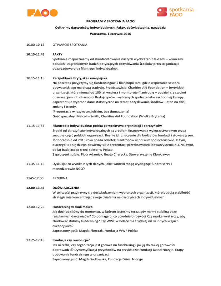 PROGRAM V SPOTKANIA FAOO Odkryjmy darczyńców indywidualnych. Fakty, doświadczenia, narzędzia Warszawa, 1 czerwca 2016 10.00-10.15 OTWARCIE SPOTKANIA 10.15-11.45 FAKTY Spotkanie rozpoczniemy od skonfrontowania naszych wyobrażeń z faktami – wynikami polskich i zagranicznych badań dotyczących pozyskiwania środków przez organizacje pozarządowe oraz filantropii indywidualnej. 10.15-11.15 Perspektywa brytyjska i europejska Na początek przyjrzymy się fundraisingowi i filantropii tam, gdzie wspieranie sektora obywatelskiego ma długą tradycję. Przedstawiciel Charities Aid Foundation – brytyjskiej organizacji, która niemal od 100 lat wspiera i monitoruje filantropię – podzieli się swoimi obserwacjami nt. ofiarności Brytyjczyków i wybranych społeczeństw zachodniej Europy. Zaprezentuje wybrane dane statystyczne na temat pozyskiwania środków – stan na dziś, zmiany i trendy. [Prezentacja w języku angielskim, bez tłumaczenia] Gość specjalny: Malcolm Smith, Charities Aid Foundation (Wielka Brytania) 11.15-11.35 Filantropia indywidualna: polska perspektywa organizacji i darczyńców Środki od darczyńców indywidualnych są źródłem finansowania wykorzystywanym przez znaczną część polskich organizacji. Rośnie ich znaczenie dla budżetów fundacji i stowarzyszeń. Jednocześnie od 2013 roku spada odsetek filantropów w polskim społeczeństwie. O tym, dlaczego tak się dzieje, dowiemy się z prezentacji przedstawicieli Stowarzyszenia KLON/Jawor, od lat badającego trzeci sektor w Polsce. Zaproszeni goście: Piotr Adamiak, Beata Charycka, Stowarzyszenie Klon/Jawor 11.35-11.45 Dyskusja: co wynika z tych danych, jakie wnioski mogą wyciągnąć fundraiserzy i menedżerowie NGO? 1145-12.00 PRZERWA 12.00-13.45 DOŚWIADCZENIA W tej części przyjrzymy się doświadczeniom wybranych organizacji, które budują stabilność strategicznie koncentrując swoje działania na darczyńcach indywidualnych. 12.00-12.25 Fundraising w skali makro Jak dochodziliśmy do momentu, w którym jesteśmy teraz, gdy mamy stabilną bazę regularnych darczyńców? Co pomagało, co utrudniało rozwój? Czy marka wystarczy, aby zbudować stabilny fundraising? Czy WWF w Polsce ma trudniej niż w innych krajach europejskich? Zaproszony gość: Magda Florczak, Fundacja WWF Polska 12.25-12.45 Ewolucja czy rewolucja? Jak określić, czy organizacja jest gotowa na fundraising i jak ją do takiej gotowości doprowadzić? Dywersyfikacja przychodów na przykładzie Fundacji Dzieci Niczyje. Etapy budowania fundraisingu w organizacji. Zaproszony gość: Magda Sadłowska, Fundacja Dzieci Niczyje 12.45-13.05 „Czerwony przycisk” – szczegóły, które zmieniają wyniki kampanii fundraisingowych Jak dokonać koniecznych korekt w planowaniu i realizacji kampanii fundraisingowych? Na co musimy zwrócić szczególną uwagę? Czego nie robić? Na czym się skupić? Zaproszeni goście: Agnieszka Szafrańska Stowarzyszenie „mali bracia Ubogich”; Martyna Żak, Instytut Fundraisingu 13.05-13.45 Dyskusja podsumowująca obie części – Fakty i Doświadczenia: Czy pozyskiwanie środków od darczyńców indywidualnych ma przyszłość? Czy darczyńcy indywidualni będą ważnym źródłem finansowania organizacji pozarządowych w Polsce? Argumenty za i przeciw. 13.45-14.30 LUNCH 14.30-15.50 NARZĘDZIA W trzeciej części spotkania skupimy się na wybranych metodach fundraisingowych. Zastanowimy się, czy telefon może być efektywnym narzędziem komunikacji z darczyńcami. Zwrócimy uwagę na kwestię efektywności fundraiserów, którzy chodzą od drzwi do drzwi. Poszukamy odpowiedzi na pytanie, czy warto wysyłać tradycyjne listy z prośbą o wsparcie i w jaki sposób to robić. Przyjrzymy się najnowszym trendom w fundraisingu online. 14.30-14.50 Fundraising telefoniczny Telefon jako narzędzie do budowania relacji z darczyńcami indywidualnymi. Zaproszony gość: Przemysław Leszko, CAF Call 14.50-15.10 Fundraising oparty na solidnej bazie Jak wykorzystać bazy danych do wysyłki listów tradycyjnych? Zaproszony gość: Magdalena Brzeska, Schober Information Group Polska 15.10-15.30 Fundraising bezpośredni Korzyści i ryzyka związane z technikami pozyskiwania funduszy poprzez Door 2 Door i Face 2 Face Zaproszony gość: Anna Strózik, Appco Group Polska 15.30-15.50 Fundraising na resorach technologii Dynamicznie rozwijająca się technologia i komunikacja stanowią filary fundraisingu. Jak z korzyścią dla organizacji stosować technologie w fundraisingu, budując pozytywne relacje z darczyńcami? Zaproszony gość: Michał Serwiński, Wzmacniacz.org 15.50-16.15 ZAMKNIĘCIE SPOTKANIA I co z tego? Wnioski i rady dla fundraiserów, wnioski i rady dla mnie Organizatorzy zastrzegają sobie prawo do zmiany programu.