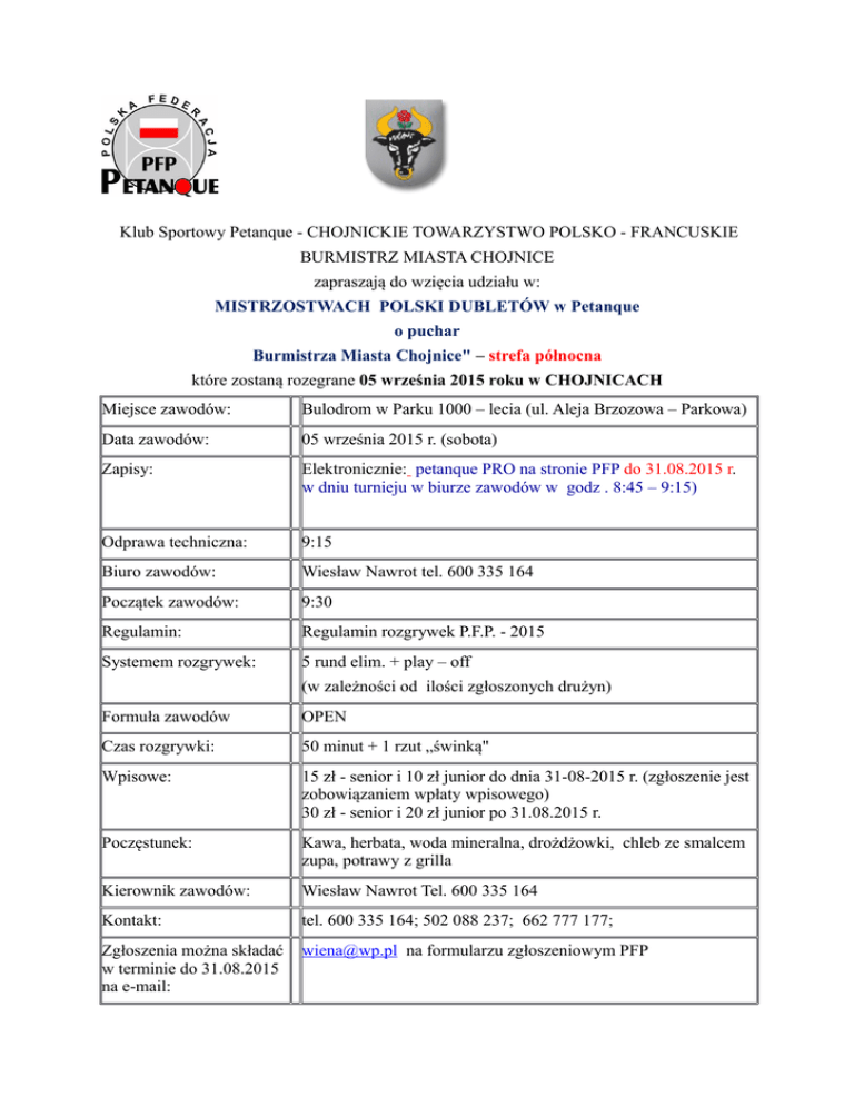 Klub Sportowy Petanque - CHOJNICKIE TOWARZYSTWO POLSKO - FRANCUSKIE BURMISTRZ MIASTA CHOJNICE zapraszają do wzięcia udziału w: MISTRZOSTWACH POLSKI DUBLETÓW w Petanque o puchar Burmistrza Miasta Chojnice" – strefa północna które zostaną rozegrane 05 września 2015 roku w CHOJNICACH Miejsce zawodów: Bulodrom w Parku 1000 – lecia (ul. Aleja Brzozowa – Parkowa) Data zawodów: 05 września 2015 r. (sobota) Zapisy: Elektronicznie: petanque PRO na stronie PFP do 31.08.2015 r. w dniu turnieju w biurze zawodów w godz . 8:45 – 9:15) Odprawa techniczna: 9:15 Biuro zawodów: Wiesław Nawrot tel. 600 335 164 Początek zawodów: 9:30 Regulamin: Regulamin rozgrywek P.F.P. - 2015 Systemem rozgrywek: 5 rund elim. + play – off (w zależności od ilości zgłoszonych drużyn) Formuła zawodów OPEN Czas rozgrywki: 50 minut + 1 rzut „świnką" Wpisowe: 15 zł - senior i 10 zł junior do dnia 31-08-2015 r. (zgłoszenie jest zobowiązaniem wpłaty wpisowego) 30 zł - senior i 20 zł junior po 31.08.2015 r. Poczęstunek: Kawa, herbata, woda mineralna, drożdżowki, chleb ze smalcem zupa, potrawy z grilla Kierownik zawodów: Wiesław Nawrot Tel. 600 335 164 Kontakt: tel. 600 335 164; 502 088 237; 662 777 177; Zgłoszenia można składać w terminie do 31.08.2015 na e-mail: [email protected] na formularzu zgłoszeniowym PFP Turniej organizowany jest pod patronatem PFP i zaliczany jest do punktacji rankingowej. Noclegi: ChTPF proponuje : w ośrodku LKS Charzykowy w Charzykowych. Zgłoszenia na noclegi prosimy kierować na adres: [email protected] a telefonicznie z kierowniczką klubu 668445153 lub 523988160 . ChKŻ - Chojnicki Klub Żeglarski, 89-606 Charzykowy ul. Rybacka 1, tel/fax (52) 3988120; Strona internetowa: www.chkz.pl; e-mail: [email protected] Informacji udziela: sekretariat klubu – tel. 52 3988120. Cena noclegu 35,00 za noc/osobę Nr konta bankowego: Bank Spółdzielczy w Chojnicach nr 45 8146 0003 0000 1010 2000 0001 Hotel - Pokoje Gościnne "Fantazja" ul. Lichnowska 13 tel. 512 248 685 http://www.eholiday.pl/noclegi-dv6589ocena.html://www.nocowanie.pl/noclegi/charzykowy/ Mapa dojazdu do bulodromu: https://maps.google.pl/maps? saddr=53.689172,17.562844&hl=pl&sll=53.690659,17.562482&sspn=0.009377,0.01929&mr a=mift&mrsp=0&sz=16&t=m&z=16 Czesław Selke