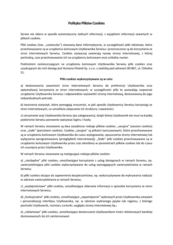 Polityka Plików Cookies Serwis nie zbiera w sposób automatyczny żadnych informacji, z wyjątkiem informacji zawartych w plikach cookies. Pliki cookies (tzw. „ciasteczka”) stanowią dane informatyczne, w szczególności pliki tekstowe, które przechowywane są w urządzeniu końcowym Użytkownika Serwisu i przeznaczone są do korzystania ze stron internetowych Serwisu. Cookies zazwyczaj zawierają nazwę strony internetowej, z której pochodzą, czas przechowywania ich na urządzeniu końcowym oraz unikalny numer. Podmiotem zamieszczającym na urządzeniu końcowym Użytkownika Serwisu pliki cookies oraz uzyskującym do nich dostęp jest Humana Poland Sp. z o.o. z siedzibą pod adresem 00-867, ul. Chłodna 51. Pliki cookies wykorzystywane są w celu: a) dostosowania zawartości stron internetowych Serwisu do preferencji Użytkownika oraz optymalizacji korzystania ze stron internetowych; w szczególności pliki te pozwalają rozpoznać urządzenie Użytkownika Serwisu i odpowiednio wyświetlić stronę internetową, dostosowaną do jego indywidualnych potrzeb; b) tworzenia statystyk, które pomagają zrozumieć, w jaki sposób Użytkownicy Serwisu korzystają ze stron internetowych, co umożliwia ulepszanie ich struktury i zawartości; c) utrzymanie sesji Użytkownika Serwisu (po zalogowaniu), dzięki której Użytkownik nie musi na każdej podstronie Serwisu ponownie wpisywać loginu i hasła; W ramach Serwisu stosowane są dwa zasadnicze rodzaje plików cookies: „sesyjne” (session cookies) oraz „stałe” (persistent cookies). Cookies „sesyjne” są plikami tymczasowymi, które przechowywane są w urządzeniu końcowym Użytkownika do czasu wylogowania, opuszczenia strony internetowej lub wyłączenia oprogramowania (przeglądarki internetowej). „Stałe” pliki cookies przechowywane są w urządzeniu końcowym Użytkownika przez czas określony w parametrach plików cookies lub do czasu ich usunięcia przez Użytkownika. W ramach Serwisu stosowane są następujące rodzaje plików cookies: a) „niezbędne” pliki cookies, umożliwiające korzystanie z usług dostępnych w ramach Serwisu, np. uwierzytelniające pliki cookies wykorzystywane do usług wymagających uwierzytelniania w ramach Serwisu; b) pliki cookies służące do zapewnienia bezpieczeństwa, np. wykorzystywane do wykrywania nadużyć w zakresie uwierzytelniania w ramach Serwisu; c) „wydajnościowe” pliki cookies, umożliwiające zbieranie informacji o sposobie korzystania ze stron internetowych Serwisu; d) „funkcjonalne” pliki cookies, umożliwiające „zapamiętanie” wybranych przez Użytkownika ustawień i personalizację interfejsu Użytkownika, np. w zakresie wybranego języka lub regionu, z którego pochodzi Użytkownik, rozmiaru czcionki, wyglądu strony internetowej itp.; e) „reklamowe” pliki cookies, umożliwiające dostarczanie Użytkownikom treści reklamowych bardziej dostosowanych do ich zainteresowań. W wielu przypadkach oprogramowanie służące do przeglądania stron internetowych (przeglądarka internetowa) domyślnie dopuszcza przechowywanie plików cookies w urządzeniu końcowym Użytkownika. Użytkownicy Serwisu mogą dokonać w każdym czasie zmiany ustawień dotyczących plików cookies. Ustawienia te mogą zostać zmienione w szczególności w taki sposób, aby blokować automatyczną obsługę plików cookies w ustawieniach przeglądarki internetowej bądź informować o ich każdorazowym zamieszczeniu w urządzeniu Użytkownika Serwisu. Szczegółowe informacje o możliwości i sposobach obsługi plików cookies dostępne są w ustawieniach oprogramowania (przeglądarki internetowej). Operator Serwisu informuje, że ograniczenia stosowania plików cookies mogą wpłynąć na niektóre funkcjonalności dostępne na stronach internetowych Serwisu. Pliki cookies zamieszczane w urządzeniu końcowym Użytkownika Serwisu i wykorzystywane mogą być również przez współpracujących z operatorem Serwisu reklamodawców oraz partnerów. Więcej informacji na temat plików cookies dostępnych jest w „Pomoc” w menu przeglądarki internetowej. źródło: http://wszystkoociasteczkach.pl/.