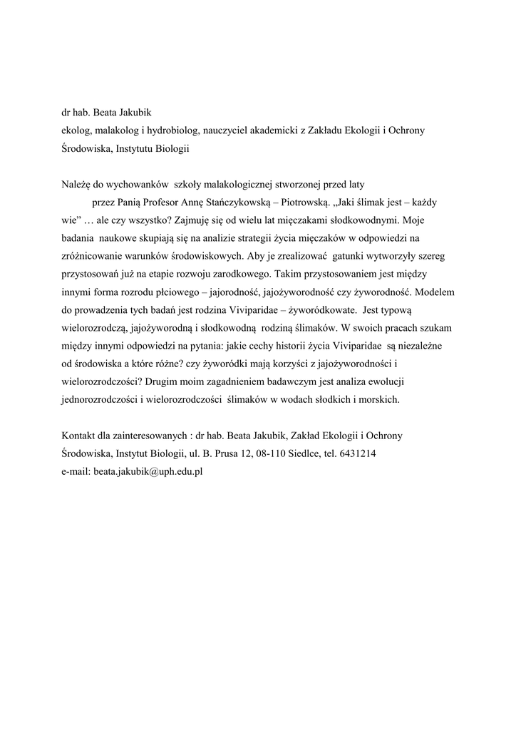 dr hab. Beata Jakubik ekolog, malakolog i hydrobiolog, nauczyciel akademicki z Zakładu Ekologii i Ochrony Środowiska, Instytutu Biologii Należę do wychowanków szkoły malakologicznej stworzonej przed laty przez Panią Profesor Annę Stańczykowską – Piotrowską. „Jaki ślimak jest – każdy wie” … ale czy wszystko? Zajmuję się od wielu lat mięczakami słodkowodnymi. Moje badania naukowe skupiają się na analizie strategii życia mięczaków w odpowiedzi na zróżnicowanie warunków środowiskowych. Aby je zrealizować gatunki wytworzyły szereg przystosowań już na etapie rozwoju zarodkowego. Takim przystosowaniem jest między innymi forma rozrodu płciowego – jajorodność, jajożyworodność czy żyworodność. Modelem do prowadzenia tych badań jest rodzina Viviparidae – żyworódkowate. Jest typową wielorozrodczą, jajożyworodną i słodkowodną rodziną ślimaków. W swoich pracach szukam między innymi odpowiedzi na pytania: jakie cechy historii życia Viviparidae są niezależne od środowiska a które różne? czy żyworódki mają korzyści z jajożyworodności i wielorozrodczości? Drugim moim zagadnieniem badawczym jest analiza ewolucji jednorozrodczości i wielorozrodczości ślimaków w wodach słodkich i morskich. Kontakt dla zainteresowanych : dr hab. Beata Jakubik, Zakład Ekologii i Ochrony Środowiska, Instytut Biologii, ul. B. Prusa 12, 08-110 Siedlce, tel. 6431214 e-mail: [email protected]