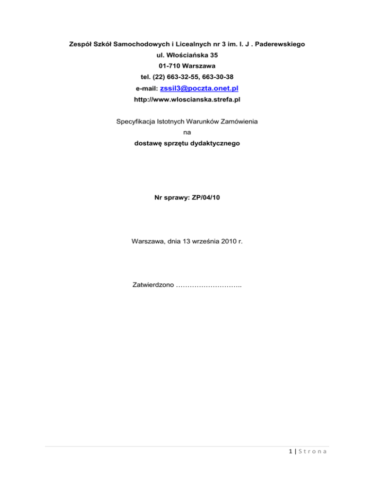 Zespół Szkół Samochodowych i Licealnych nr 3 im. I. J . Paderewskiego ul. Włościańska 35 01-710 Warszawa tel. (22) 663-32-55, 663-30-38 e-mail: [email protected] http://www.wloscianska.strefa.pl Specyfikacja Istotnych Warunków Zamówienia na dostawę sprzętu dydaktycznego Nr sprawy: ZP/04/10 Warszawa, dnia 13 września 2010 r. Zatwierdzono ……………………….. 1|Strona 1. Zamawiający Zespół Szkół Samochodowych i Licealnych nr 3 im. I. J . Paderewskiego ul. Włościańska 35 01-710 Warszawa tel. (22) 663-32-55, 663-30-38 e-mail: [email protected] 2. Osoby ze strony Zamawiającego do kontaktu w sprawie zamówienia. 2.1 Osobą wyznaczoną do kontaktów w sprawie niniejszego postępowania jest - Jan Królik - Bogusław Michałowski Nr do kontaktów: Sekretariat szkolny - tel/fax: 0 prefix 22 - 663 - 30 - 38 3. Język postępowania oraz sposób porozumiewania się Zamawiającego z Wykonawcami. 3.1. Postępowanie jest prowadzone w języku polskim. 3.2. Wszelkie oświadczenia i dokumenty sporządzone w języku innym niż język polski muszą być złożone wraz z tłumaczeniami na język polski poświadczonymi przez Wykonawcę. 3.3. W niniejszym postępowaniu Zamawiający i Wykonawcy mogą przekazywać oświadczenia i dokumenty, w tym: wnioski, zawiadomienia, informacje, pytania i odpowiedzi, pisemnie lub faksem (z zastrzeżeniem postanowień pkt. 3.4). 3.4. Forma pisemna wymagana jest dla niżej wymienionych czynności, dla których Zamawiający nie zezwala na komunikowanie się faksem: - złożenie Oferty; - zmiana Oferty; - powiadomienie Zamawiającego o wycofaniu złożonej przez Wykonawcę Oferty; - uzupełnienie oświadczeń i dokumentów o których mowa w art. 25 ust. 1 Ustawy, na zasadach określonych w art. 26 ust. 3 Ustawy. 3.5. Zamawiający, jeśli otrzyma od Wykonawcy prośbę o potwierdzenie doręczenia oświadczenia lub dokumentu przekazanego faksem, niezwłocznie potwierdzi fakt otrzymania korespondencji faksem lub pisemnie. 2|Strona Wykonawca, jeżeli otrzyma od Zamawiającego oświadczenie lub dokument faksem, 3.6 ma obowiązek niezwłocznie potwierdzić fakt otrzymania tej korespondencji faksem lub pisemnie. Wszelkie dokumenty i oświadczenia, w tym: wnioski, zawiadomienia, informacje, 3.7. pytania i odpowiedzi, powinny być kierowane na adres osoby uprawnionej do kontaktów z Wykonawcami, w tym odpowiednio na wskazany w niniejszej SIWZ lub nr faksu. 4. Tryb udzielenia zamówienia i informacje o miejscu zamieszczenia ogłoszenia 4.1 Niniejsze postępowanie prowadzone jest w trybie przetargu nieograniczonego na podstawie ustawy z dnia 29 stycznia 2004 r. Prawo zamówień (Dz. U. z 2007 r. Nr 223, poz. 1655 ze zm.) zwanej dalej „ustawą”. 4.2. W sprawach nie uregulowanych niniejszą SIWZ zastosowanie mają przepisy ustawy. 4.3. Ogłoszenie o zamówieniu zostało zamieszczone: a) w Biuletynie Zamówień Publicznych pod nr 287750 - 2010 w dniu 13 września 2010 r. b) na stronie internetowej: http://bip.wloscianska.strefa.pl , w dniu 13 września 2010 r. c) na tablicy ogłoszeń Zamawiającego w dniu 13 września 2010 r. 5. Opis przedmiotu zamówienia. 5.1 Przedmiotem zamówienia jest dostawa następującego sprzętu dydaktycznego: a) 1 szt. Zestaw panelowy „Aktoryka systemów pojazdowych” b) 1 szt. Zestaw panelowy „Oświetlenie pojazdu samochodowego” c) 1 szt. Zestaw panelowy „Układy zapłonowe” 5.2 Szczegółowe wymagania dotyczące parametrów zamawianego sprzętu zamawiający określił w załączniku nr 3 do niniejszej specyfikacji „opis przedmiotu zamówienia”. 5.3. Opis przedmiotu zamówienia według Wspólnego Słownika zamówień: Kod CPV Nomenklatura 38410000-2 Przyrządy pomiarowe 31211310-4 Wyłączniki 31110000-0 Silniki elektryczne 3|Strona 39162100-6 Pomoce dydaktyczne 38341300-0 Przyrządy do mierzenia wielkości elektrycznych 31172000-2 Transformatory napięciowe 31711131-0 Oporniki elektryczne 38342000-4 Oscyloskopy 5.4. Wyklucza się zaoferowanie urządzeń używanych lub składanych z używanych części. Sprzęt musi być fabrycznie nowy. 5.5 Warunki gwarancji. Zamawiający wymaga aby Wykonawca udzielił Zamawiającemu pisemnej gwarancji na zamawiany sprzęt na okres nie krótszy niż 24 miesiące Termin biegu gwarancji rozpoczyna się w dniu podpisania protokołu odbioru sprzętu. 5.6 Sprzęt ma być zaoferowany w postaci jednowariantowej opcji zaproponowanej przez Wykonawcę, tzn. z podaniem konkretnych wartości parametrów zgodnych ze specyfikacją istotnych warunków zamówienia a w szczególności zgodnie z załącznikiem nr 3 do SIWZ – opis przedmiotu zamówienia. 5.7 Sprzęt musi posiadać certyfikaty dopuszczające do obrotu na terenie RP. 5.8 Serwis. W okresie gwarancji ujawnione w okresie gwarancyjnym wady Wykonawca usunie bezpłatnie w terminie 14 dni od daty przyjęcia zgłoszenia do Wykonawcy. W przypadku, gdy naprawa sprzętu przekroczy terminy określone w pkt.5.8, Wykonawca zapewni na własny koszt sprzęt zastępczy o parametrach nie gorszych niż sprzęt, który uległ awarii. W przypadku, gdy dany sprzęt ulegnie awarii trzy razy w ciągu okresu gwarancji, Wykonawca będzie miał obowiązek wymienić ten sprzęt na nowy o nie gorszych parametrach technicznych. 6. Termin realizacji zamówienia. Wymagany termin realizacji zamówienia wynosi nie później niż do dnia 15 grudnia 2010 r. 7. Warunki udziału w postępowaniu. W postępowaniu mogą wziąć udział Wykonawcy, którzy: 7.1 Nie podlegają wykluczeniu z postępowania na podstawie art. 24 ust. 1 ustawy. 7.2 Spełniają warunki określone w art. 22 ust.1 dotyczące: 4|Strona 7.2.1 posiadania uprawnień do wykonywania określonej działalności lub czynności, jeżeli przepisy prawa nakładają obowiązek posiadania takich uprawnień; 7.2.2. posiadania wiedzy i doświadczenia, 7.2.3. dysponowania odpowiednim potencjałem technicznym oraz osobami zdolnymi do wykonania zamówienia; 7.2.4. sytuacji ekonomicznej i finansowej; UWAGA: Wykonawca moż