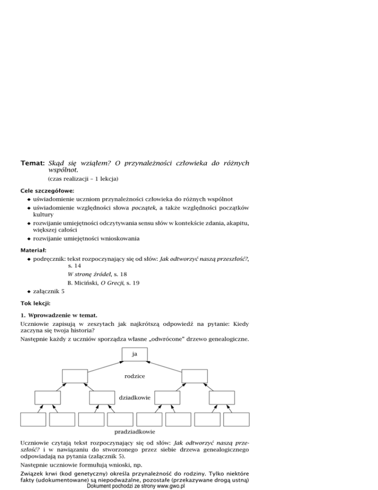 Temat: Skąd się wziąłem? O przynależności człowieka do różnych wspólnot. (czas realizacji – 1 lekcja) Cele szczegółowe: uświadomienie uczniom przynależności człowieka do różnych wspólnot uświadomienie względności słowa początek, a także względności początków kultury rozwijanie umiejętności odczytywania sensu słów w kontekście zdania, akapitu, większej całości rozwijanie umiejętności wnioskowania Materiał: podręcznik: tekst rozpoczynający się od słów: Jak odtworzyć naszą przeszłość?, s. 14 W stronę źródeł, s. 18 B. Miciński, O Grecji, s. 19 załącznik 5 Tok lekcji: 1. Wprowadzenie w temat. Uczniowie zapisują w zeszytach jak najkrótszą odpowiedź na pytanie: Kiedy zaczyna się twoja historia? Następnie każdy z uczniów sporządza własne „odwrócone” drzewo genealogiczne. ja rodzice dziadkowie pradziadkowie Uczniowie czytają tekst rozpoczynający się od słów: Jak odtworzyć naszą przeszłość? i w nawiązaniu do stworzonego przez siebie drzewa genealogicznego odpowiadają na pytania (załącznik 5). Następnie uczniowie formułują wnioski, np. Związek krwi (kod genetyczny) określa przynależność do rodziny. Tylko niektóre fakty (udokumentowane) są niepodważalne, pozostałe (przekazywane drogą ustną) Dokument pochodzi ze strony www.gwo.pl mogą, ale nie muszą być prawdziwe (mają charakter legendarny). Historia rodziny jest bardziej odległa, niż może to ogarnąć pamięć. 2. Praca z tekstem w dwuosobowych zespołach. Prosimy o wykonanie podobnego drzewa, które obrazowałoby przynależność nie do rodziny, a do narodu. Ponieważ zadanie jest niewykonalne*, prosimy o cichą lekturę pierwszego akapitu rozdziału W stronę źródeł i poszukanie argumentów, które decydują o przynależności do narodu. Uczniowie ustnie formułują wnioski w zespole, a po weryfikacji na forum klasy zapisują uwagi w zeszytach, np. Nie pokrewieństwo (kod genetyczny), ale wspólnota języka, historii, tradycji, a często i religii decydują o przynależności do narodu. Zwracamy uczniom uwagę, że przynależność terytorialna nie jest kryterium narodowościowym, np. Polacy na emigracji nie przestają być Polakami, a Romowie czy Niemcy żyjący w Polsce nie są Polakami, choć mogą mieć polskie obywatelstwo. 3. Praca z tekstem w dwuosobowych zespołach. Uczniowie czytają O Grecji Bolesława Micińskiego i ostatni akapit W stronę źródeł. W kontekście tych fragmentów oraz wcześniejszych wniosków uczniowie powinni skonstruować odpowiedź na pytanie: Czy tekst Micińskiego jest pisany z punktu widzenia członka konkretnej rodziny, konkretnego narodu, czy osoby przynależącej do jeszcze innej wspólnoty? Jakiej? Uczniowie ustnie formułują wnioski w zespole, a po weryfikacji na forum klasy zapisują uwagi w zeszytach, np. O „powinowactwie” decyduje często nieuświadomiona, ale wspólna idea smaku i zmysłu moralnego (kod kultury), której podstawę dali greccy artyści i filozofowie. 4. Podsumowanie lekcji. Zbieranie wniosków można podporządkować schematowi: Czynniki budujące tożsamość człowieka (Jana Kowalskiego) członka rodziny (jednego z Kowalskich) narodu 5. Praca domowa. Odpowiedz pisemnie na pytanie: Gdzie dostrzegasz początki samego siebie? * Metodyka nie stosuje i nie poleca zadań, które są niewykonalne. Niemniej ja w swej praktyce stosuję czasami takie ćwiczenia. Uzmysławiają one uczniom niebezpieczeństwo myślenia schematami oraz skłaniają do szukania różnych rozwiązań. Dodatkowo dają poczucie, że nawet w szkole nie wszystkie działania muszą zakończyć się powodzeniem. Wykonanie tego ćwiczenia (łatwo można je przeformułować na wykonalne) lub jego pominięcie zostawiam, oczywiście, Państwa decyzji. Dokument pochodzi ze strony www.gwo.pl
