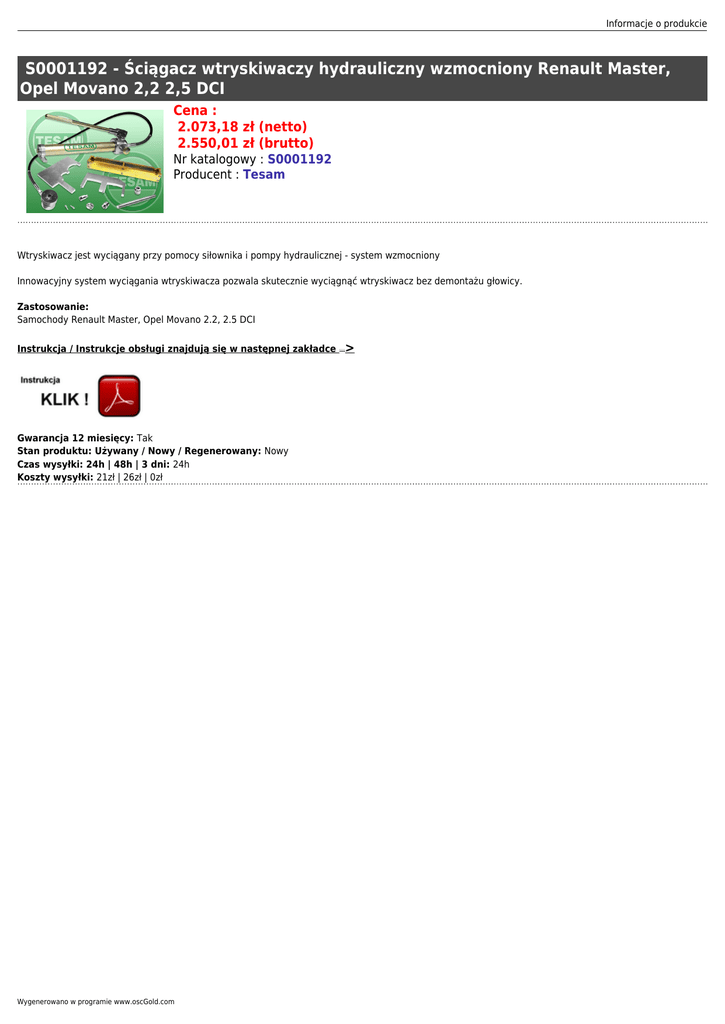 Informacje o produkcie S0001192 - Ściągacz wtryskiwaczy hydrauliczny wzmocniony Renault Master, Opel Movano 2,2 2,5 DCI Cena : 2.073,18 zł (netto) 2.550,01 zł (brutto) Nr katalogowy : S0001192 Producent : Tesam Wtryskiwacz jest wyciągany przy pomocy siłownika i pompy hydraulicznej - system wzmocniony Innowacyjny system wyciągania wtryskiwacza pozwala skutecznie wyciągnąć wtryskiwacz bez demontażu głowicy. Zastosowanie: Samochody Renault Master, Opel Movano 2.2, 2.5 DCI Instrukcja / Instrukcje obsługi znajdują się w następnej zakładce Gwarancja 12 miesięcy: Tak Stan produktu: Używany / Nowy / Regenerowany: Nowy Czas wysyłki: 24h | 48h | 3 dni: 24h Koszty wysyłki: 21zł | 26zł | 0zł Wygenerowano w programie www.oscGold.com > ----