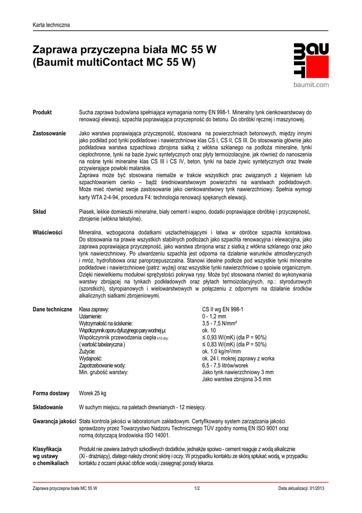 Karta techniczna Zaprawa przyczepna biała MC 55 W (Baumit multiContact MC 55 W) Produkt Sucha zaprawa budowlana spełniająca wymagania normy EN 998-1. Mineralny tynk cienkowarstwowy do renowacji elewacji, szpachla poprawiająca przyczepność do betonu. Do obróbki ręcznej i maszynowej. Zastosowanie Jako warstwa poprawiająca przyczepność, stosowana na powierzchniach betonowych, między innymi jako podkład pod tynki podkładowe i nawierzchniowe klas CS I, CS II, CS III. Do stosowania głównie jako podkładowa warstwa szpachlowa zbrojona siatką z włókna szklanego na podłoża mineralne, tynki ciepłochronne, tynki na bazie żywic syntetycznych oraz płyty termoizolacyjne, jak również do nanoszenia na nośne tynki mineralne klas CS III i CS IV, beton, tynki na bazie żywic syntetycznych oraz trwale przywierające powłoki malarskie. Zaprawa może być stosowana niemalże w trakcie wszystkich prac związanych z klejeniem lub szpachlowaniem cienko – bądź średniowarstwowym powierzchni na warstwach podkładowych. Może mieć również swoje zastosowanie jako cienkowarstwowy tynk nawierzchniowy. Spełnia wymogi karty WTA 2-4-94, procedura F4: technologia renowacji spękanych elewacji. Skład Piasek, lekkie domieszki mineralne, biały cement i wapno, dodatki poprawiające obróbkę i przyczepność, zbrojenie (włókna tekstylne). Właściwości Mineralna, wzbogacona dodatkami uszlachetniającymi i łatwa w obróbce szpachla kontaktowa. Do stosowania na prawie wszystkich stabilnych podłożach jako szpachla renowacyjna i elewacyjna, jako zaprawa poprawiająca przyczepność, jako warstwa zbrojona wraz z siatką z włókna szklanego oraz jako tynk nawierzchniowy. Po utwardzeniu szpachla jest odporna na działanie warunków atmosferycznych i mróz, hydrofobowa oraz paroprzepuszczalna. Stanowi idealne podłoże pod wszystkie tynki mineralne podkładowe i nawierzchniowe (patrz: wyżej) oraz wszystkie tynki nawierzchniowe o spoiwie organicznym. Dzięki niewielkiemu modułowi sprężystości pokrywa rysy. Może być stosowana również do wykonywania warstwy zbrojącej na tynkach podkładowych oraz płytach termoizolacyjnych, np.: styrodurowych (szorstkich), styropianowych i wielowarstwowych w połączeniu z odpornymi na działanie środków alkalicznych siatkami zbrojeniowymi. Dane techniczne Klasa zaprawy: Uziarnienie: Wytrzymałość na ściskanie: Współczynnik oporu dyfuzyjnego pary wodnej µ: Współczynnik przewodzenia ciepła λ10 dry: ( wartość tabelaryczna ) Zużycie: Wydajność: Zapotrzebowanie wody: Min. grubość warstwy: Forma dostawy Worek 25 kg Składowanie W suchym miejscu, na paletach drewnianych - 12 miesięcy. CS II wg EN 998-1 0 - 1,2 mm 3,5 - 7,5 N/mm² ok. 10 ≤ 0,93 W/(mK) (dla P = 90%) ≤ 0,83 W/(mK) (dla P = 50%) ok. 1,0 kg/m2/mm ok. 24 l. mokrej zaprawy z worka 6,5 - 7,5 litrów/worek Jako tynk nawierzchniowy 3 mm Jako warstwa zbrojona 3-5 mm Gwarancja jakości Stała kontrola jakości w laboratorium zakładowym. Certyfikowany system zarządzania jakości sprawdzony przez Towarzystwo Nadzoru Technicznego TÜV zgodny normą EN ISO 9001 oraz normą dotyczącą środowiska ISO 14001. Klasyfikacja wg ustawy o chemikaliach Produkt nie zawiera żadnych szkodliwych dodatków, jednakże spoiwo - cement reaguje z wodą alkalicznie (Xi - drażniący), dlatego należy chronić skórę i oczy. W przypadku kontaktu ze skórą spłukać wodą, w przypadku kontaktu z oczami płukać obficie wodą i zasięgnąć porady lekarza. Zaprawa przyczepna biała MC 55 W 1/2 Data aktualizacji: 01/2013 Karta techniczna Podłoże Odpowiednim podłożem są powierzchnie betonowe, mury mieszane, płyty izolacyjne oraz tynki cementowo-wapienne i cementowe, pokryte powłoką malarską lub nie, pod warunkiem, że są: trwałe, nośne, czyste i suche. Z podłoża należy usunąć luźne elementy oraz warstwy łuszczącej się farby, stare farby klejowe i lateksowe, brud, kurz, olej i tłuszcz. Pęknięcia i rysy pogłębić klinowo. Podłoża bardzo chłonne w razie wątpliwości zwilżyć wstępnie. Usunąć substancje tworzące tzw. „film" (wosk i olej szalunkowy itp.). Podłoże musi być odpowiednio suche i utwardzone. Szczególnie gładkie powierzchnie (np. styrodur itp.) wcześniej zadrapać i odkurzyć. Podłoża bardzo chłonne oraz gipsowe należy zagruntować środkiem penetrującym TiefenGrund. Piaszczące się tynki podkładowe wzmocnić środkiem do wzmacniania tynku PutzFestiger. Obróbka Zaprawa multiContact MC 55 W może być nanoszona ręcznie lub maszynowo. W przypadku dużych powierzchni zaleca się stosowanie agregatów tynkarskich. W przypadku zastosowania zaprawy jako warstwy poprawiającej przyczepność oraz jako warstwy zbrojeniowej nanieść 3 do 5 mm zaprawy i na świeżo zadrapać szczotką. W obszarach ryzyka, gdzie występują pęknięcia, mur mieszany, itp., zatopić w zaprawie odporną na alkalia siatkę z włókna szklanego. Postępować w ten sam sposób stosując zaprawę jako warstwę poprawiającą przyczepność. Przed nałożeniem kolejnych warstw przestrzegać przerwy technologicznej ( 1dzień na 1 milimetr grubości tynku ). W razie potrzeby można na zaprawie multiContact MC 55 W wykonać strukturę poprzez filcowanie. W przypadku ociepleń dużych powierzchni elewacji, do dyspozycji klientów są zespolone systemy ociepleń Baumit. Wskazówki Chronić przed silnym nasłonecznieniem. W przypadku szybkiego wysychania (z powodu wiatru lub słońca) zwilżać, a w razie potrzeby ochraniać elewację do momentu całkowitego utwardzenia ( stosując siatki rusztowaniowe ). Wysoka wilgotność powietrza oraz niskie temperatury znacznie wydłużają czas twardnienia. Świeżo nałożona warstwa musi być wyschnięta i utwardzona przed nałożeniem kolejnej warstwy. W przypadku zbrojenia powierzchni elewacji siatką z włókna szklanego należy zwrócić uwagę, aby nie była ona uszkodzona lub odsłonięta. Przy podwójnym zbrojeniu, drugą warstwę 