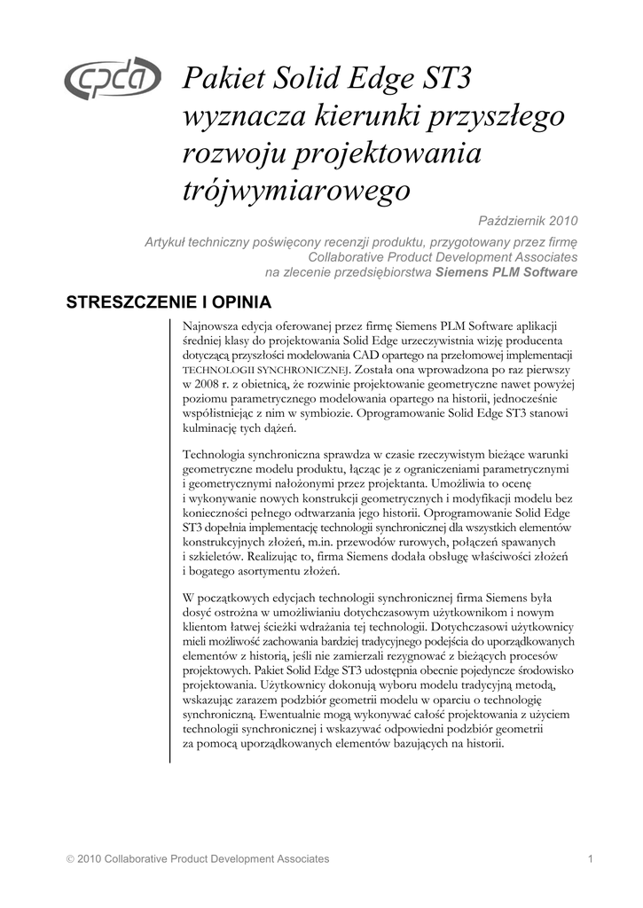 Pakiet Solid Edge ST3 wyznacza kierunki przyszłego rozwoju projektowania trójwymiarowego Październik 2010 Artykuł techniczny poświęcony recenzji produktu, przygotowany przez firmę Collaborative Product Development Associates na zlecenie przedsiębiorstwa Siemens PLM Software STRESZCZENIE I OPINIA Najnowsza edycja oferowanej przez firmę Siemens PLM Software aplikacji średniej klasy do projektowania Solid Edge urzeczywistnia wizję producenta dotyczącą przyszłości modelowania CAD opartego na przełomowej implementacji TECHNOLOGII SYNCHRONICZNEJ. Została ona wprowadzona po raz pierwszy w 2008 r. z obietnicą, że rozwinie projektowanie geometryczne nawet powyżej poziomu parametrycznego modelowania opartego na historii, jednocześnie współistniejąc z nim w symbiozie. Oprogramowanie Solid Edge ST3 stanowi kulminację tych dążeń. Technologia synchroniczna sprawdza w czasie rzeczywistym bieżące warunki geometryczne modelu produktu, łącząc je z ograniczeniami parametrycznymi i geometrycznymi nałożonymi przez projektanta. Umożliwia to ocenę i wykonywanie nowych konstrukcji geometrycznych i modyfikacji modelu bez konieczności pełnego odtwarzania jego historii. Oprogramowanie Solid Edge ST3 dopełnia implementację technologii synchronicznej dla wszystkich elementów konstrukcyjnych złożeń, m.in. przewodów rurowych, połączeń spawanych i szkieletów. Realizując to, firma Siemens dodała obsługę właściwości złożeń i bogatego asortymentu złożeń. W początkowych edycjach technologii synchronicznej firma Siemens była dosyć ostrożna w umożliwianiu dotychczasowym użytkownikom i nowym klientom łatwej ścieżki wdrażania tej technologii. Dotychczasowi użytkownicy mieli możliwość zachowania bardziej tradycyjnego podejścia do uporządkowanych elementów z historią, jeśli nie zamierzali rezygnować z bieżących procesów projektowych. Pakiet Solid Edge ST3 udostępnia obecnie pojedyncze środowisko projektowania. Użytkownicy dokonują wyboru modelu tradycyjną metodą, wskazując zarazem podzbiór geometrii modelu w oparciu o technologię synchroniczną. Ewentualnie mogą wykonywać całość projektowania z użyciem technologii synchronicznej i wskazywać odpowiedni podzbiór geometrii za pomocą uporządkowanych elementów bazujących na historii. 2010 Collaborative Product Development Associates 1 Pakiet Solid Edge ST3 wyznacza kierunki przyszłego rozwoju projektowania CAD 3D Październik 2010 Taka elastyczność w połączeniu z istotnym udoskonaleniem obsługi zaimportowanych modeli obcych, która umożliwia przekształcanie wymiarów z rysunków 2D na wymiary sterujące 3D podatne na edycję, wyróżnia oprogramowanie Solid Edge na tle innych systemów CAD średniej klasy. Firmie Siemens udało się wyłamać ze schematu indywidualizacji modelowania, obecnego we wszystkich najpopularniejszych aplikacjach. Użytkownicy stawiający pierwsze kroki w świecie projektowania trójwymiarowego będą szczególnie usatysfakcjonowani nowymi opcjami adaptacji istniejących już projektów. Pakiet Solid Edge wyznacza bardzo ambitne kierunki przyszłego rozwoju projektowania CAD. Te ulepszenia modelowania w powiązaniu z udoskonaleniami mechanizmów symulacyjnych, które obejmują pokaźny wachlarz scenariuszy odwzorowujących rzeczywiste warunki, udostępniają użytkownikom bogate środowisko opracowywania produktów. Elastyczność pracy zespołowej, zarządzania przedsięwzięciami i sporządzania raportów biznesowych osiągnięta dzięki integracji pakietu Solid Edge z tandemem Insight™/Microsoft SharePoint oraz z platformą Teamcenter Express pozwala zaoferować w pełni skalowalne narzędzia, przeznaczone zarówno dla małych, jak i dla dużych firm. Po dodaniu do tego jeszcze imponującej listy tysięcy wprowadzonych udoskonaleń, które były postulowane przez użytkowników, firma Siemens może pochwalić się rozwiązaniem mającym wszelkie szanse na zapewnienie długotrwałej lojalności klientów. SOLID EDGE ST3 Bieżąca wersja stanowi zwieńczenie wielu lat intensywnej pracy nad urzeczywistnieniem oryginalnej wizji technologii synchronicznej. Pakiet Solid Edge ST3 spełnia obietnicę skrócenia czasu tworzenia modeli przez wyeliminowanie wstępnego planowania projektu. Użytkownicy nie muszą już zastanawiać się nad kolejnością uporządkowanych elementów. Technologia synchroniczna zarządza za nich zależnościami geometrycznymi. W celu usunięcia komplikacji związanych z uporządkowanymi zależnościami i ich zaburzającym wpływem można łatwo i szybko stosować do modelu produktu zlecenia zmian inżynieryjnych. Ponadto, dzięki metodom edycyjnym zapewnianym przez technologię synchroniczną, zaimportowane dane można modyfikować równie efektywnie, jak oryginalne modele, co pozwala projektantom na pełniejsze ponowne wykorzystywanie danych dostarczanych przez klientów lub dostawców. 2 2010 Collaborative Product Development Associates Pakiet Solid Edge ST3 wyznacza kierunki przyszłego rozwoju trójwymiarowego projektowania CAD Październik 2010 PEŁNY ZAKRES ELEMENTÓW KONSTRUKCYJNYCH Dzięki technologii synchronicznej aplikacja Solid Edge ST3 obsługuje obecnie na poziomie złożenia pełny zakres dostępnych w niej elementów konstrukcyjnych, np. wiązki kabli i przewody rurowe. W tym celu firma Siemens wprowadziła liczne udoskonalenia w całym pakiecie, umożliwiając użytkownikom łączenie modelowania synchronicznego i uporządkowanego w tym samym modelu części, zależnie od tego, który rodzaj bardziej odpowiada aktualnym potrzebom. Użytkownik może definiować i kontrolować relacje dotyczące modyfikowania położenia części albo geometrii realizowanej metodą „od ogółu do szczegółu” lub „od szczegółu do ogółu”. Użytkownik może ponadto dodawać wzajemne relacje między częściami przed projektowaniem, w trakcie jego trwania lub po jego zakończeniu, co jeszcze bardziej ogranicza koniec