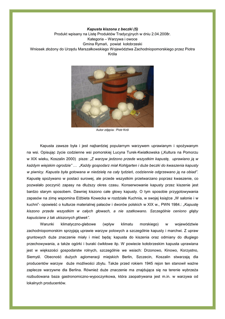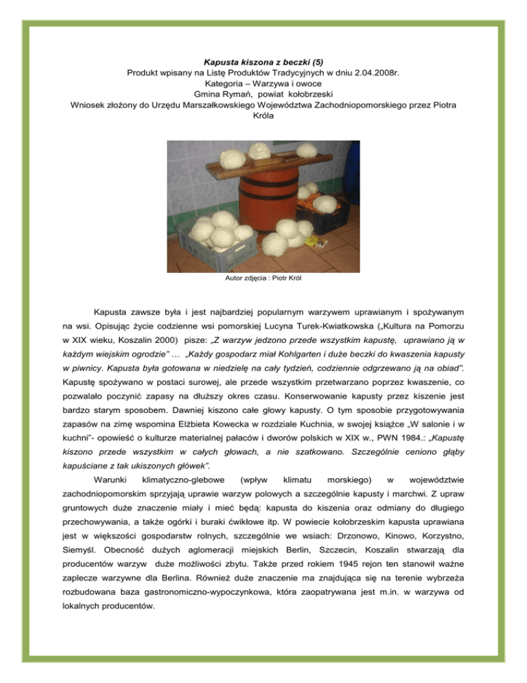 Kapusta kiszona z beczki (5) Produkt wpisany na Listę Produktów Tradycyjnych w dniu 2.04.2008r. Kategoria – Warzywa i owoce Gmina Rymań, powiat kołobrzeski Wniosek złoŜony do Urzędu Marszałkowskiego Województwa Zachodniopomorskiego przez Piotra Króla Autor zdjęcia : Piotr Król Kapusta zawsze była i jest najbardziej popularnym warzywem uprawianym i spoŜywanym na wsi. Opisując Ŝycie codzienne wsi pomorskiej Lucyna Turek-Kwiatkowska („Kultura na Pomorzu w XIX wieku, Koszalin 2000) pisze: „Z warzyw jedzono przede wszystkim kapustę, uprawiano ją w kaŜdym wiejskim ogrodzie” … „KaŜdy gospodarz miał Kohlgarten i duŜe beczki do kwaszenia kapusty w piwnicy. Kapusta była gotowana w niedzielę na cały tydzień, codziennie odgrzewano ją na obiad”. Kapustę spoŜywano w postaci surowej, ale przede wszystkim przetwarzano poprzez kwaszenie, co pozwalało poczynić zapasy na dłuŜszy okres czasu. Konserwowanie kapusty przez kiszenie jest bardzo starym sposobem. Dawniej kiszono całe głowy kapusty. O tym sposobie przygotowywania zapasów na zimę wspomina ElŜbieta Kowecka w rozdziale Kuchnia, w swojej ksiąŜce „W salonie i w kuchni”- opowieść o kulturze materialnej pałaców i dworów polskich w XIX w., PWN 1984.: „Kapustę kiszono przede wszystkim w całych głowach, a nie szatkowano. Szczególnie ceniono głąby kapuściane z tak ukiszonych główek”. Warunki klimatyczno-glebowe (wpływ klimatu morskiego) w województwie zachodniopomorskim sprzyjają uprawie warzyw polowych a szczególnie kapusty i marchwi. Z upraw gruntowych duŜe znaczenie miały i mieć będą: kapusta do kiszenia oraz odmiany do długiego przechowywania, a takŜe ogórki i buraki ćwikłowe itp. W powiecie kołobrzeskim kapusta uprawiana jest w większości gospodarstw rolnych, szczególnie we wsiach: Drzonowo, Kinowo, Korzystno, Siemyśl. Obecność duŜych aglomeracji miejskich Berlin, Szczecin, Koszalin stwarzają dla producentów warzyw duŜe moŜliwości zbytu. TakŜe przed rokiem 1945 rejon ten stanowił waŜne zaplecze warzywne dla Berlina. RównieŜ duŜe znaczenie ma znajdująca się na terenie wybrzeŜa rozbudowana baza gastronomiczno-wypoczynkowa, która zaopatrywana jest m.in. w warzywa od lokalnych producentów.