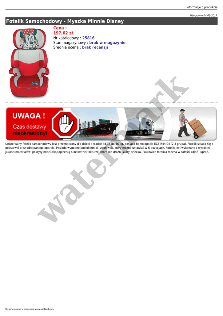 Informacje o produkcie Utworzono 04-03-2017 Fotelik Samochodowy - Myszka Minnie Disney Cena : 197,62 zł er m ar k Nr katalogowy : 25816 Stan magazynowy : brak w magazynie Średnia ocena : brak recenzji w at Uniwersalny fotelik samochodowy jest przeznaczony dla dzieci o wadze od 15 do 36 kg, posiada homologację ECE R44.04 (2,3 grupa). Fotelik składa się z podstawki oraz odłączanego oparcia. Posiada wygodne podłokietniki i zagłówek, który można ustawiać w 6 pozycjach. Fotelik jest wykonany z wysokiej jakości materiałów, pokryty mięciutką tapicerką o delikatnej fakturze, która nie drażni skóry dziecka. Pokrowiec fotelika można w całości zdjąć i uprać. Wygenerowano w programie www.oscGold.com er m ar k at w Montaż fotelika jest szybki i prosty. Przed umieszczeniem fotelika w samochodzie należy uważnie przeczytać załączoną instrukcję. Wymiary: 39x43x65 cm