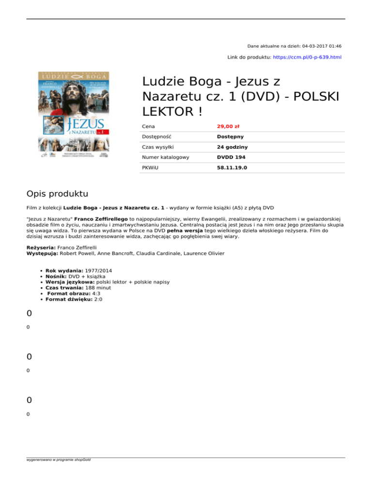 Dane aktualne na dzień: 04-03-2017 01:46 Link do produktu: https://ccm.pl/0-p-639.html Ludzie Boga - Jezus z Nazaretu cz. 1 (DVD) - POLSKI LEKTOR ! Cena 29,00 zł Dostępność Dostępny Czas wysyłki 24 godziny Numer katalogowy DVDD 194 PKWiU 58.11.19.0 Opis produktu Film z kolekcji Ludzie Boga - Jezus z Nazaretu cz. 1 - wydany w formie książki (A5) z płytą DVD "Jezus z Nazaretu" Franco Zeffirellego to najpopularniejszy, wierny Ewangelii, zrealizowany z rozmachem i w gwiazdorskiej obsadzie film o życiu, nauczaniu i zmartwychwstaniu Jezusa. Centralną postacią jest Jezus i na nim oraz Jego przesłaniu skupia się uwaga widza. To pierwsza wydana w Polsce na DVD pełna wersja tego wielkiego dzieła włoskiego reżysera. Film do dzisiaj wzrusza i budzi zainteresowanie widza, zachęcając go pogłębienia swej wiary. Reżyseria: Franco Zeffirelli Występują: Robert Powell, Anne Bancroft, Claudia Cardinale, Laurence Olivier Rok wydania: 1977/2014 Nośnik: DVD + książka Wersja językowa: polski lektor + polskie napisy Czas trwania: 188 minut Format obrazu: 4:3 Format dźwięku: 2:0 0 0 0 0 0 0 wygenerowano w programie shopGold Powered by TCPDF (www.tcpdf.org)
