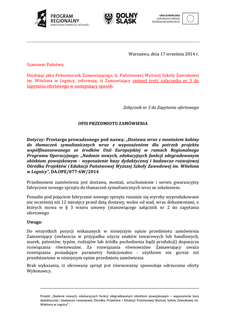 Warszawa, dnia 17 września 2014 r. Szanowni Państwo, Działając jako Pełnomocnik Zamawiającego, tj. Państwowej Wyższej Szkoły Zawodowej im. Witelona w Legnicy, informuję, iż Zamawiający zmienił treść załącznika nr 3 do zapytania ofertowego w następujący sposób: Załącznik nr 3 do Zapytania ofertowego OPIS PRZEDMIOTU ZAMÓWIENIA Dotyczy: Przetargu prowadzonego pod nazwą: „Dostawa wraz z montażem kabiny do tłumaczeń symultanicznych wraz z wyposażeniem dla potrzeb projektu współfinansowanego ze środków Unii Europejskiej w ramach Regionalnego Programu Operacyjnego: „Nadanie nowych, edukacyjnych funkcji zdegradowanym obiektom powojskowym - wyposażenie bazy dydaktycznej i badawczo rozwojowej Ośródka Projektów i Edukacji Państwowej Wyższej Szkoły Zawodowej im. Witelona w Legnicy", DA.OPE/077-6W/2014 Przedmiotem zamówienia jest dostawa, montaż, uruchomienie i serwis gwarancyjny fabrycznie nowego sprzętu do tłumaczeń symultanicznych wraz ze szkoleniem. Ponadto pod pojęciem fabrycznie nowego sprzętu rozumie się wyroby wyprodukowane nie wcześniej niż 12 miesięcy przed datą dostawy, wolne od wad, wraz dokumentami, o których mowa w § 3 wzoru umowy (stanowiącego załącznik nr 2 do zapytania ofertowego Uwaga: Do wszystkich pozycji wskazanych w niniejszym opisie przedmiotu zamówienia Zamawiający (zwłaszcza w przypadku użycia znaków towarowych lub handlowych, marek, patentów, typów, rodzajów lub źródła pochodzenia bądź produkcji) dopuszcza rozwiązania równoważne. Za rozwiązania równoważne Zamawiający uważa rozwiązania posiadające parametry funkcjonalno - użytkowe nie gorsze niż przedstawione w niniejszym opisie przedmiotu zamówienia Brak wykazania, iż oferowany sprzęt jest równoważny spowoduje odrzucenie oferty Wykonawcy. Projekt „Nadanie nowych, edukacyjnych funkcji zdegradowanym obiektom powojskowym – wyposażenie bazy dydaktycznej i badawczo rozwojowej Ośrodka Projektów i Edukacji Państwowej Wyższej Szkoły Zawodowej im. Witelona w Legnicy”. l.p. 1 Asortyment Moduł nadajnika/ jednostka centralna - • • • • • • • • Wymagania szczegółowe 8-kanałowy nadajnik Tryb do dystrybucji muzyki do wszystkich kanałów w czasie przerwy Tryb podrzędny do dystrybucji sygnałów z innego nadajnika Tryb testowy generujący dźwięk o innej częstotliwości dla każdego wejścia/kanału Regulowana czułość dla każdego wejścia Wbudowany minipromiennik podczerwieni do monitorowania dźwięku Informacja o stanie promiennika i systemu na wyświetlaczu Możliwość nadania nadajnikowi niepowtarzalnej nazwy w celu łatwej identyfikacji urządzenia w systemie wielonadajnikowym Możliwość nadania każdemu kanałowi audio unikatowej wybieranej z listy lub wprowadzanej ręcznie Ilość 1 Połączenia: • Gniazdo typu Euro do podłączenia zasilania • Gniazdo ze złączem do magistrali danych (H 15) do podłączenia symetrycznego wejścia audio i modułu tłumacza • 8 złącz typu Cinch do podłączenia wejścia asymetrycznych sygnałów audio • Dwa gniazda XLR do podłączenia wejścia symetrycznych sygnałów przemówień, komunikatów alarmowych lub muzyki • Jedno gniazdo zespołu zacisków do dystrybucji komunikatów alarmowych do wszystkich kanałów • Słuchawkowe gniazdo stereofoniczne 3,5 mm • Jedno złącze BNC do odbioru sygnału HF z innego nadajnika • Sześć złączy BNC do podłączenia wyjścia sygnału HF do maks. 30 promienników • Dwa złącza sieci optycznej 2 Moduł wejściowy audio/pulpit tłumacza • Symetryczne wejście audio i moduł tłumacza do połączenia nadajnika z systemami dyskusyjnymi i 6-kanałowym pulpitem tłumacza z głośnikiem Elementy sterujące i wskaźniki • Przełączniki do bezpośredniego dołączania pulpitów tłumaczy lub innych źródeł dźwięku • Przełącznik do wzmocnienia sygnałów języka źródłowego lub innych systemów konferencyjnych • Przełącznik do zastąpienia sygnału tłumaczenia sygnałem języka Projekt „Nadanie nowych, edukacyjnych funkcji zdegradowanym obiektom powojskowym – wyposażenie bazy dydaktycznej i badawczo rozwojowej Ośrodka Projektów i Edukacji Państwowej Wyższej Szkoły Zawodowej im. Witelona w Legnicy”. 1 źródłowego w celu przesyłania do słuchaczy sygnału języka źródłowego, gdy nie jest używany kanał tłumacza Połączenia wzajemne • Symetryczne analogowe wejście audio; 25-stykowe złącze D-sub • Złącze audio i magistrali danych; złącze H 15 3 Odbiornik • • • • • • • • • • • • • 4 5 Ładowarka walizkowa Słuchawki • Stereofoniczne • • • • 6 Pulpit 4-kanałowy odbiornik przenośny Zestaw akumulatorów do odbiorników przenośnych Ładowarka do odbiorników przenośnych, przenośna Komora akumulatora przystosowana do korzystania z baterii alkalicznych AA Po odłączeniu zestawu słuchawkowego zasilanie jest wyłączane Klips ułatwiający noszenie Tryb pomiaru umożliwiający bezproblemowe sprawdzenie poziomu pokrycia przez promienniki Do minimum 200 godzin pracy przy użyciu baterii alkalicznych Do minimum 75 godzin pracy przy użyciu zestawu akumulatorów Pełne ładowanie przy całkowitym rozładowaniu w ciągu 1 godziny i 45 minut Gniazdo wyjściowe stereo typu jack 3,5 mm do zestawu słuchawkowego Złącze do korzystania z zestawu akumulatorów Styki do ładowarki po lewej stronie odbiornika przenośnego, przeznaczone do współpracy z ładowarkami 25 • 1 Ładowarki służą do ładowania i podtrzymywania pracy odbiorników przenośnych • Ładowarka obsługująca do 56 odbiorników • Szybkie ładowanie: w ciągu 1 godziny i 45 minut • Ładowarka musi posiadać wskaźnik naładowania na odbiornikach przenośnych Lekkie słuchawki oferujące wysoką jakość dźwięku, w komplecie z jednym zestawem wymiennych nakładek usznych i standardowy kabel Połączenia międzymodułowe Częstotliwościowa charakterystyka modulacji 50 Hz 