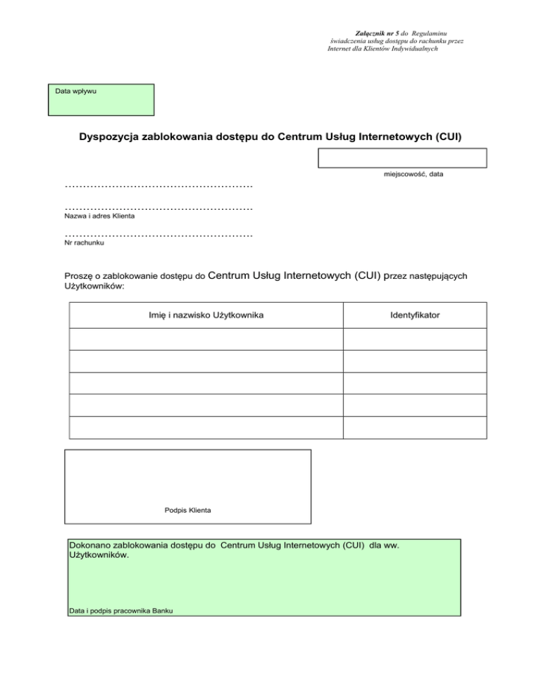Załącznik nr 5 do Regulaminu świadczenia usług dostępu do rachunku przez Internet dla Klientów Indywidualnych Data wpływu Dyspozycja zablokowania dostępu do Centrum Usług Internetowych (CUI) miejscowość, data ……………………………………………. ……………………………………………. Nazwa i adres Klienta ……………………………………………. Nr rachunku Proszę o zablokowanie dostępu do Centrum Użytkowników: Usług Internetowych (CUI) przez następujących Imię i nazwisko Użytkownika Identyfikator Podpis Klienta Dokonano zablokowania dostępu do Centrum Usług Internetowych (CUI) dla ww. Użytkowników. Data i podpis pracownika Banku