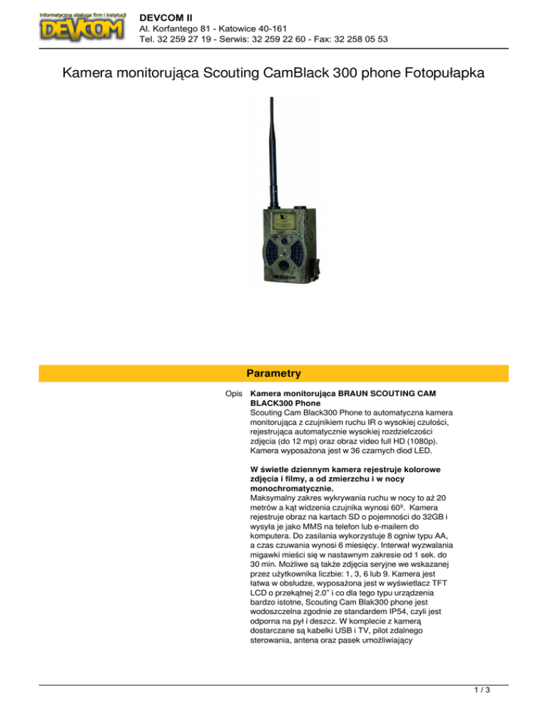 DEVCOM II Al. Korfantego 81 - Katowice 40-161 Tel. 32 259 27 19 - Serwis: 32 259 22 60 - Fax: 32 258 05 53 Kamera monitorująca Scouting CamBlack 300 phone Fotopułapka Parametry Opis Kamera monitorująca BRAUN SCOUTING CAM BLACK300 Phone Scouting Cam Black300 Phone to automatyczna kamera monitorująca z czujnikiem ruchu IR o wysokiej czułości, rejestrująca automatycznie wysokiej rozdzielczości zdjęcia (do 12 mp) oraz obraz video full HD (1080p). Kamera wyposażona jest w 36 czarnych diod LED. W świetle dziennym kamera rejestruje kolorowe zdjęcia i filmy, a od zmierzchu i w nocy monochromatycznie. Maksymalny zakres wykrywania ruchu w nocy to aż 20 metrów a kąt widzenia czujnika wynosi 60º. Kamera rejestruje obraz na kartach SD o pojemności do 32GB i wysyła je jako MMS na telefon lub e-mailem do komputera. Do zasilania wykorzystuje 8 ogniw typu AA, a czas czuwania wynosi 6 miesięcy. Interwał wyzwalania migawki mieści się w nastawnym zakresie od 1 sek. do 30 min. Możliwe są także zdjęcia seryjne we wskazanej przez użytkownika liczbie: 1, 3, 6 lub 9. Kamera jest łatwa w obsłudze, wyposażona jest w wyświetlacz TFT LCD o przekątnej 2.0” i co dla tego typu urządzenia bardzo istotne, Scouting Cam Blak300 phone jest wodoszczelna zgodnie ze standardem IP54, czyli jest odporna na pył i deszcz. W komplecie z kamerą dostarczane są kabelki USB i TV, pilot zdalnego sterowania, antena oraz pasek umożliwiający 1/3 DEVCOM II Al. Korfantego 81 - Katowice 40-161 Tel. 32 259 27 19 - Serwis: 32 259 22 60 - Fax: 32 258 05 53 zamocowanie kamery. Rozdzielczość Rozdzielczość Rozdzielczość Matryca VGA 640 x 480 HD 720p Full HD 1080p CMOS 5mp (interpolacja 12mp) Obiektyw - F=3.1 - FOV=60 Kąt widzenia pionowy 60 Kąt widzenia poziomy 60 Mikrofon Wbudowane głośniki Tryb nocny Detekcja ruchu Bezpieczeństwo Brak danych Nie Tak Tak Ochrona hasłem Zarządzanie, monitorowanie, konfiguracja - MMS na telefon (1-4 numery) - MMS na PC (1-4 adresy e-mail) Obsługa systemów mobilnych Brak Funkcje specjalne - MMS na telefon (1-4 numery) - MMS na PC (1-4 adresy e-mail) - GSM 850/900/1800/1900 - Ujęcia periodyczne (1 sek. do 24h) - 36 czarnych LED - Maks. dystans nocny 20 metrów - Czas czuwania 6 miesięcy - Filtr IR: w pełni automatyczny - Monitor: kolorowy TFT LCD 2,0” - Czułość wyzwalania:wysoka, normalna, niska Czytnik kart pamięci Standard pamięci SD / CF Standard pamięci SD / CF Komunikacja bezprzewodowa Złącza Klasa szczelności Zasilanie Tak SDHC SD Brak danych 1 x USB 2.0 IP54 8 x AA Akcesoria w zestawie - Kamera - Pilot - Kabel USB - Kabel TV - Antena - Pasek do mocowania Kolor Moro Kolor Wzór Wymiary 145 x 80 x 55 mm 2/3 DEVCOM II Al. Korfantego 81 - Katowice 40-161 Tel. 32 259 27 19 - Serwis: 32 259 22 60 - Fax: 32 258 05 53 Pozostałe parametry - Zdjęcia seryjne: 1 / 3 / 6 / 9 zdjęć - Slot karty SIM 3/3 Powered by TCPDF (www.tcpdf.org)