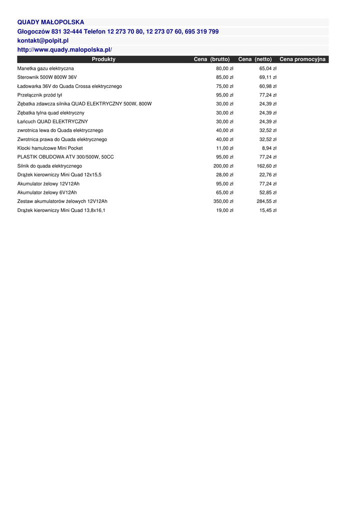 QUADY MAŁOPOLSKA Głogoczów 831 32-444 Telefon 12 273 70 80, 12 273 07 60, 695 319 799 [email protected] http://www.quady.malopolska.pl/ Produkty Cena (brutto) Cena (netto) Manetka gazu elektryczna 80,00 zł 65,04 zł Sterownik 500W 800W 36V 85,00 zł 69,11 zł Ładowarka 36V do Quada Crossa elektrycznego 75,00 zł 60,98 zł Przełącznik przód tył 95,00 zł 77,24 zł Zębatka zdawcza silnika QUAD ELEKTRYCZNY 500W, 800W 30,00 zł 24,39 zł Zębatka tylna quad elektryczny 30,00 zł 24,39 zł Łańcuch QUAD ELEKTRYCZNY 30,00 zł 24,39 zł zwrotnica lewa do Quada elektrycznego 40,00 zł 32,52 zł Zwrotnica prawa do Quada elektrycznego 40,00 zł 32,52 zł Klocki hamulcowe Mini Pocket 11,00 zł 8,94 zł PLASTIK OBUDOWA ATV 300/500W, 50CC 95,00 zł 77,24 zł 200,00 zł 162,60 zł Drążek kierowniczy Mini Quad 12x15,5 28,00 zł 22,76 zł Akumulator żelowy 12V12Ah 95,00 zł 77,24 zł Akumulator żelowy 6V12Ah 65,00 zł 52,85 zł Zestaw akumulatorów żelowych 12V12Ah 350,00 zł 284,55 zł Drążek kierowniczy Mini Quad 13,8x16,1 19,00 zł 15,45 zł Silnik do quada elektrycznego Cena promocyjna