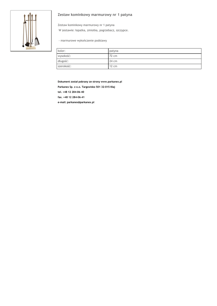 Zestaw kominkowy marmurowy nr 1 patyna Zestaw kominkowy marmurowy nr 1 patyna W zestawie: łopatka, zmiotka, pogrzebacz, szczypce. - marmurowe wykończenie podstawy kolor: patyna wysokość: 72 cm długość: 24 cm szerokość: 12 cm Dokument został pobrany ze strony www.parkanex.pl Parkanex Sp. z o.o. Targowisko 501 32-015 Kłaj tel. +48 12 284-06-40 fax. +48 12 284-06-41 e-mail: [email protected]