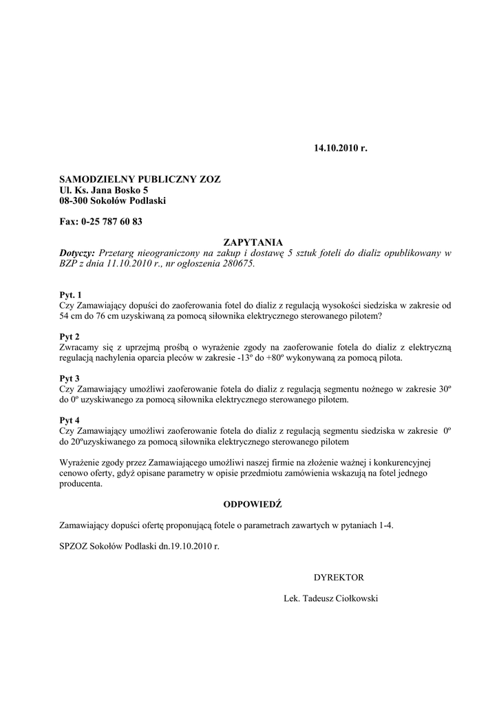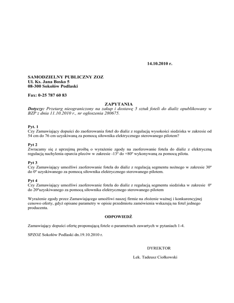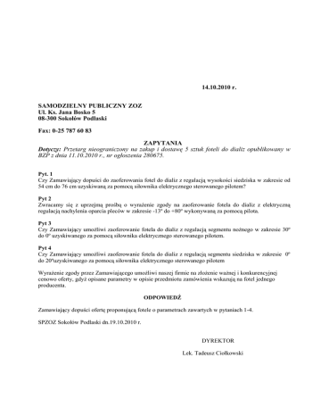 14.10.2010 r. SAMODZIELNY PUBLICZNY ZOZ Ul. Ks. Jana Bosko 5 08-300 Sokołów Podlaski Fax: 0-25 787 60 83 ZAPYTANIA Dotyczy: Przetarg nieograniczony na zakup i dostawę 5 sztuk foteli do dializ opublikowany w BZP z dnia 11.10.2010 r., nr ogłoszenia 280675. Pyt. 1 Czy Zamawiający dopuści do zaoferowania fotel do dializ z regulacją wysokości siedziska w zakresie od 54 cm do 76 cm uzyskiwaną za pomocą siłownika elektrycznego sterowanego pilotem? Pyt 2 Zwracamy się z uprzejmą prośbą o wyrażenie zgody na zaoferowanie fotela do dializ z elektryczną regulacją nachylenia oparcia pleców w zakresie -13º do +80º wykonywaną za pomocą pilota. Pyt 3 Czy Zamawiający umożliwi zaoferowanie fotela do dializ z regulacją segmentu nożnego w zakresie 30º do 0º uzyskiwanego za pomocą siłownika elektrycznego sterowanego pilotem. Pyt 4 Czy Zamawiający umożliwi zaoferowanie fotela do dializ z regulacją segmentu siedziska w zakresie 0º do 20ºuzyskiwanego za pomocą siłownika elektrycznego sterowanego pilotem Wyrażenie zgody przez Zamawiającego umożliwi naszej firmie na złożenie ważnej i konkurencyjnej cenowo oferty, gdyż opisane parametry w opisie przedmiotu zamówienia wskazują na fotel jednego producenta. ODPOWIEDŹ Zamawiający dopuści ofertę proponującą fotele o parametrach zawartych w pytaniach 1-4. SPZOZ Sokołów Podlaski dn.19.10.2010 r. DYREKTOR Lek. Tadeusz Ciołkowski