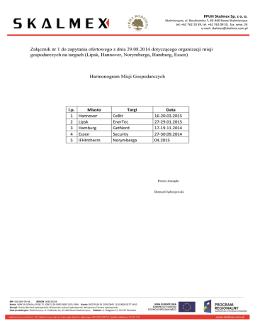PPUH Skalmex Sp. z o. o. Skalmierzyce, ul. Boczkowska 7, 63-460 Nowe Skalmierzyce tel: +62 762 10 39, tel. +62 762 09 10, fax. wew. 24 e-mail: [email protected] Załącznik nr 1 do zapytania ofertowego z dnia 29.08.2014 dotyczącego organizacji misji gospodarczych na targach (Lipsk, Hannover, Norymberga, Hamburg, Essen) Harmonogram Misji Gospodarczych l.p. 1 2 3 4 5 Miasto Hannover Lipsk Hamburg Essen IFHIntherm Targi CeBit EnerTec GetNord Security Norymberga Data 16-20.03.2015 27-29.01.2015 17-19.11.2014 27-30.09.2014 04.2015 Prezes Zarządu Bernard Jędrzejewski NIP 618-004-09-48, REGON 008333244 Konto WBK SA O/Kalisz (PLN) 71 1090 1128 0000 0000 1201 6386 Konto: BGŻ (PLN) 91 2030 0045 1110 0000 0177 5410 Zarząd: Prezes Bernard Jędrzejewski, Wiceprezes Łukasz Jędrzejewski, Wiceprezes Tomasz Jędrzejewski Hala produkcyjna: Skalmierzyce, ul. Podkocka 2a, 63-460 Nowe Skalmierzyce; Oddział: ul. Belgijska 71, 54-427 Wrocław