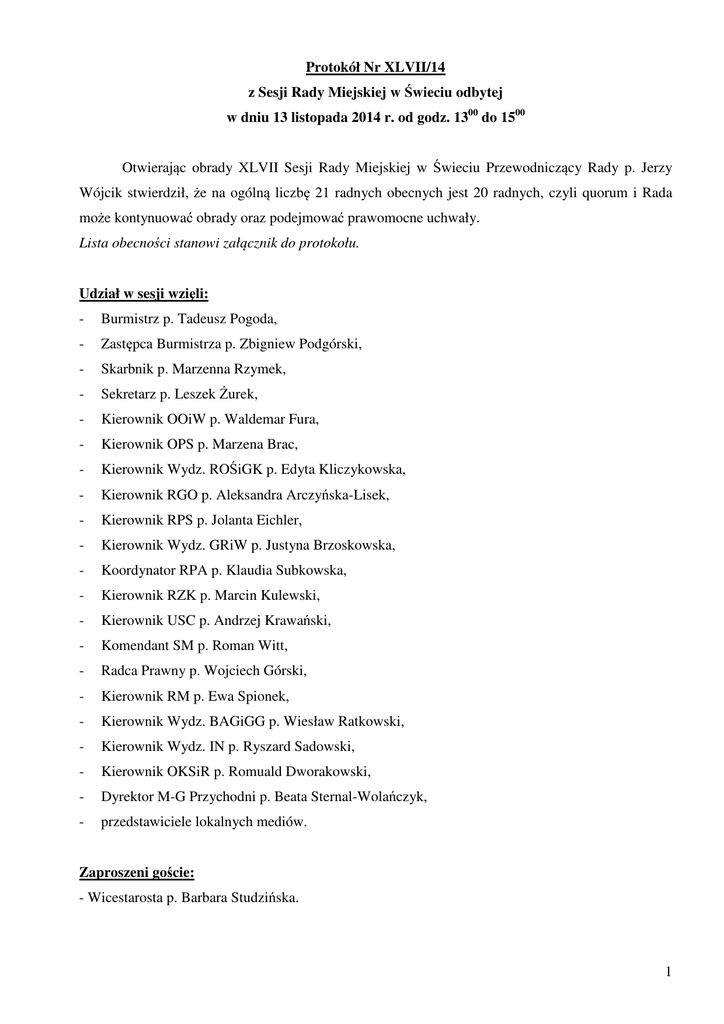 Protokół Nr XLVII/14 z Sesji Rady Miejskiej w Świeciu odbytej w dniu 13 listopada 2014 r. od godz. 1300 do 1500 Otwierając obrady XLVII Sesji Rady Miejskiej w Świeciu Przewodniczący Rady p. Jerzy Wójcik stwierdził, że na ogólną liczbę 21 radnych obecnych jest 20 radnych, czyli quorum i Rada może kontynuować obrady oraz podejmować prawomocne uchwały. Lista obecności stanowi załącznik do protokołu. Udział w sesji wzięli: - Burmistrz p. Tadeusz Pogoda, - Zastępca Burmistrza p. Zbigniew Podgórski, - Skarbnik p. Marzenna Rzymek, - Sekretarz p. Leszek Żurek, - Kierownik OOiW p. Waldemar Fura, - Kierownik OPS p. Marzena Brac, - Kierownik Wydz. ROŚiGK p. Edyta Kliczykowska, - Kierownik RGO p. Aleksandra Arczyńska-Lisek, - Kierownik RPS p. Jolanta Eichler, - Kierownik Wydz. GRiW p. Justyna Brzoskowska, - Koordynator RPA p. Klaudia Subkowska, - Kierownik RZK p. Marcin Kulewski, - Kierownik USC p. Andrzej Krawański, - Komendant SM p. Roman Witt, - Radca Prawny p. Wojciech Górski, - Kierownik RM p. Ewa Spionek, - Kierownik Wydz. BAGiGG p. Wiesław Ratkowski, - Kierownik Wydz. IN p. Ryszard Sadowski, - Kierownik OKSiR p. Romuald Dworakowski, - Dyrektor M-G Przychodni p. Beata Sternal-Wolańczyk, - przedstawiciele lokalnych mediów. Zaproszeni goście: - Wicestarosta p. Barbara Studzińska. 1 Porządek obrad: 1. Otwarcie sesji i stwierdzenie quorum. 2. Przyjęcie protokołu z poprzedniej sesji. 3. Informacja przewodniczącego o działaniach Rady w okresie międzysesyjnym. 4. Sprawozdanie Burmistrza o działalności międzysesyjnej. 5. Informacja Przewodniczącego o działalności Rady, podsumowanie działalności Rady Miejskiej w kadencji 2010 - 2014. 6. Podsumowanie 7. Interpelacje i zapytania radnych. 8. Zakończenie. Ad. 2 Rada jednogłośnie przyjęła protokół z poprzedniej sesji. Ad. 3 Przewodniczący Rady p. Jerzy Wójcik przedstawił informację Przewodniczącego o działaniach Rady w okresie międzysesyjnym oraz odczytał pismo, które wpłynęło od p. Wojewody z podziękowaniem za długoletnią pracę oraz informacją o przyznaniu złotego medalu. Informacja stanowi załącznik do protokołu. Ad. 4 Sprawozdanie o działalności międzysesyjnej złożył Burmistrz p. Tadeusz Pogoda. Ad. 5 Informacja Przewodniczącego o działalności Rady, podsumowanie działalności Rady Miejskiej w kadencji 2010 – 2014. Informacja stanowi załącznik do protokołu. Ad. 6 Przewodniczący Rady p. Jerzy Wójcik razem z Wiceprzewodniczącym Rady p. Adamem Cieślakiem wręczyli pamiątkowe statuetki radnym oraz z burmistrzom na zakończenie kadencji 2010-2014. Przewodniczący Rady p. Jerzy Wójcik złożył podziękowania wszystkim kierownikom i pracownikom Urzędu za 4-letniom współpracę. 2 Wicestarosta p. Barbara Studzińska – przychyliła się do podziękowań przedmówcy oraz życzyła sukcesu wyborczego. Następnie w krótkich przemówieniach pożegnalnych wystąpili kolejno: - Wiceprzewodniczący Rady p. Adam Cieślak, - Burmistrz p. Tadeusz Pogoda, - Radny p. Józef Pawłowski, - Radna p. Helena Ratka-Fejtko, - Radna p. Halina Szolginia, - Radny p. Zbigniew Rydziel, - Radny p. Janusz Rogala. Ad. 7 Interpelacji nie było. Radny p. Sławomir Siemaszko – przypomniał pytanie p. Rydziela z poprzedniej Sesji: ile rocznie kosztuje utrzymanie amfiteatru w Świeciu? Kierownik OKSiR p. Romuald Dworakowski – odpowiedział, że utrzymanie amfiteatru nie przekracza 50 tys. zł rocznie. Ad. 8 Wobec wyczerpania porządku obrad, Przewodniczący Rady p. Jerzy Wójcik zamknął obrady XLVII Sesji Rady Miejskiej. Protokolant: Magdalena Jażdżewska – Wydz. Organizacyjny U. M. Przewodniczący Rady Miejskiej Jerzy Wójcik 3