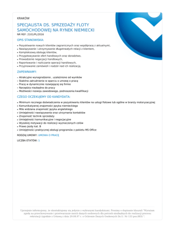 KRAKÓW SPECJALISTA DS. SPRZEDAŻY FLOTY SAMOCHODOWEJ NA RYNEK NIEMIECKI NR REF: 2101/PL/2016 OPIS STANOWISKA: ● ● ● ● ● ● ● Pozyskiwanie nowych klientów zagranicznych oraz współpracę z aktualnymi, Nawiązywanie i utrzymywanie długotrwałych relacji z klientem, Kompleksową obsługę klientów, Przygotowywanie ofert handlowych oraz doradztwo, Prowadzenie negocjacji handlowych, Raportowanie i rozliczanie operacji handlowych, Przyjmowanie zamówień i nadzór nad ich realizacją. ZAPEWNIAMY: ● ● ● ● ● Atrakcyjne wynagrodzenie , uzależnione od wyników Stabilne zatrudnienie w oparciu o umowę o pracę Pracę w dynamicznie rozwijającej się firmie Narzędzia niezbędne do pracy Możliwości rozwoju zawodowego, podnoszenia kwalifikacji CZEGO OCZEKUJEMY OD KANDYDATA: ● ● ● ● ● ● ● ● ● Minimum rocznego doświadczenia w pozyskiwaniu klientów na usługi flotowe lub ogólne w branży motoryzacyjnej Komunikatywnej znajomości języka niemieckiego Mile widziana znajomość języka angielskiego Umiejętności nawiązywania oraz utrzymania kontaktów Znajomość technik sprzedaży Umiejętności komunikacyjne i negocjacyjne Wysokiej motywacji do realizacji wyznaczonych celów Prawo jazdy kat. B Umiejętności praktycznej obsługi programów z pakietu MS Office RODZAJ UMOWY: UMOWA O PRACĘ LICZBA ETATÓW: 1 Uprzejmie informujemy, że skontaktujemy się jedynie z wybranymi kandydatami. Prosimy o dopisanie klauzuli "Wyrażam zgodę na przechowywanie i przetwarzanie moich danych osobowych dla potrzeb niezbędnych do realizacji procesu rekrutacji (zgodnie z Ustawą z dnia 29.08.97 r. o Ochronie Danych Osobowych Dz.U. Nr 133 poz.883) ".