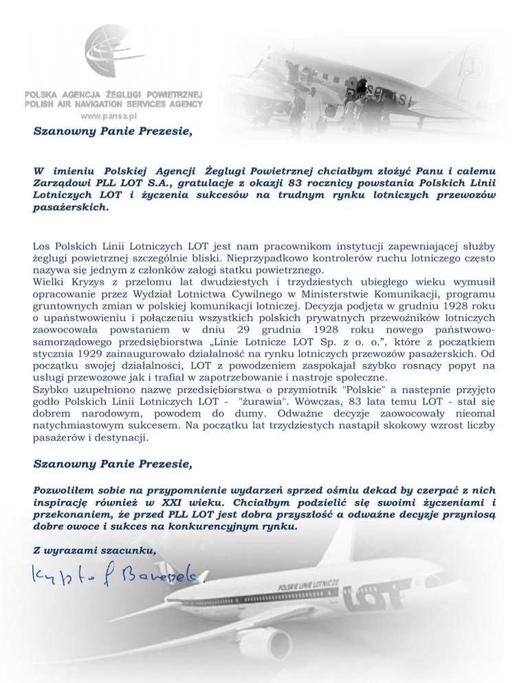 Szanowny Panie Prezesie, W imieniu Polskiej Agencji Żeglugi Powietrznej chciałbym złożyć Panu i całemu Zarządowi PLL LOT S.A., gratulacje z okazji 83 rocznicy powstania Polskich Linii Lotniczych LOT i życzenia sukcesów na trudnym rynku lotniczych przewozów pasażerskich. Los Polskich Linii Lotniczych LOT jest nam pracownikom instytucji zapewniającej służby żeglugi powietrznej szczególnie bliski. Nieprzypadkowo kontrolerów ruchu lotniczego często nazywa się jednym z członków załogi statku powietrznego. Wielki Kryzys z przełomu lat dwudziestych i trzydziestych ubiegłego wieku wymusił opracowanie przez Wydział Lotnictwa Cywilnego w Ministerstwie Komunikacji, programu gruntownych zmian w polskiej komunikacji lotniczej. Decyzja podjęta w grudniu 1928 roku o upaństwowieniu i połączeniu wszystkich polskich prywatnych przewoźników lotniczych zaowocowała powstaniem w dniu 29 grudnia 1928 roku nowego państwowosamorządowego przedsiębiorstwa „Linie Lotnicze LOT Sp. z o. o.”, które z początkiem stycznia 1929 zainaugurowało działalność na rynku lotniczych przewozów pasażerskich. Od początku swojej działalności, LOT z powodzeniem zaspokajał szybko rosnący popyt na usługi przewozowe jak i trafiał w zapotrzebowanie i nastroje społeczne. Szybko uzupełniono nazwę przedsiębiorstwa o przymiotnik "Polskie" a następnie przyjęto godło Polskich Linii Lotniczych LOT - "żurawia". Wówczas, 83 lata temu LOT - stał się dobrem narodowym, powodem do dumy. Odważne decyzje zaowocowały nieomal natychmiastowym sukcesem. Na początku lat trzydziestych nastąpił skokowy wzrost liczby pasażerów i destynacji. Szanowny Panie Prezesie, Pozwoliłem sobie na przypomnienie wydarzeń sprzed ośmiu dekad by czerpać z nich inspirację również w XXI wieku. Chciałbym podzielić się swoimi życzeniami i przekonaniem, że przed PLL LOT jest dobra przyszłość a odważne decyzje przyniosą dobre owoce i sukces na konkurencyjnym rynku. Z wyrazami szacunku,