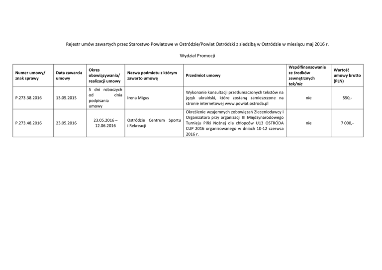 Rejestr umów zawartych przez Starostwo Powiatowe w Ostródzie/Powiat Ostródzki z siedzibą w Ostródzie w miesiącu maj 2016 r. Wydział Promocji Numer umowy/ znak sprawy P.273.38.2016 P.273.48.2016 Współfinansowanie ze środków zewnętrznych tak/nie Data zawarcia umowy Okres obowiązywania/ realizacji umowy Nazwa podmiotu z którym zawarto umowę Przedmiot umowy 13.05.2015 5 dni roboczych od dnia podpisania umowy Irena Migus Wykonanie konsultacji przetłumaczonych tekstów na język ukraiński, które zostaną zamieszczone na stronie internetowej www.powiat.ostroda.pl nie 550,- Ostródzie Centrum Sportu i Rekreacji Określenie wzajemnych zobowiązań Zleceniodawcy i Organizatora przy organizacji III Międzynarodowego Turnieju Piłki Nożnej dla chłopców U13 OSTRÓDA CUP 2016 organizowanego w dniach 10-12 czerwca 2016 r. nie 7 000,- 23.05.2016 23.05.2016 – 12.06.2016 Wartość umowy brutto (PLN) Rejestr umów zawartych przez Starostwo Powiatowe w Ostródzie/Powiat Ostródzki z siedzibą w Ostródzie w miesiącu maju 2016 r. Wydział Oświaty, Kultury i Sportu Numer umowy/ znak sprawy Data zawarcia umowy OKS. 30 maja 2016 r. OKS. 30 maja 2016 r. OKS 30 maja 2016 r. OKS 30 maja 2016 r. OKS OKS OKS.273.9.201 6 Okres obowiązywania/ realizacji umowy Nazwa podmiotu z którym zawarto umowę Przedmiot umowy Współfinansowanie ze środków zewnętrznych tak/nie Wartość umowy brutto (PLN) nie 100,- nie 200,- nie 200,- Krzysztof Filiczkowski Sędziowanie turnieju piłki koszykowej podczas VIII Powiatowych Dni Sportu Sędziowanie turnieju piłki nożnej podczas VIII Powiatowych Dni Sportu Sędziowanie turnieju piłki siatkowej podczas VIII Powiatowych Dni Sportu 01-02 czerwca 2016 Mirosław Żyłka Sędziowanie turnieju piłki nożnej podczas VIII Powiatowych Dni Sportu nie 200,- 30 maja 2016 r. 01-02 czerwca 2016 Michał Osmęda Sędziowanie turnieju piłki siatkowej podczas VIII Powiatowych Dni Sportu nie 200,- 30 maja 2016 r. 2 czerwca 2016 Krzysztof Bonisławski Sędziowanie turnieju piłki koszykowej podczas VIII Powiatowych Dni Sportu nie 100,- nie 2 990,- 30 maja 2016 r. 2 czerwca 2016 01-02 czerwca 2016 01-02 czerwca 2016 17-19 czerwca 2016 r. Marian Kazimirczyk Marcin Żyłka Przewozy Autokarowe „LIPNICKI” Usługa transportowa wolontariuszy i opiekunów z Powiatu Ostródzkiego na Ogólnopolską Galę Wolontariatu w Prudniku Rejestr umów zawartych przez Starostwo Powiatowe w Ostródzie/Powiat Ostródzki z siedzibą w Ostródzie w miesiącu maju 2016 r. Wydział Administracji, Nadzoru i Kadr Numer umowy/ znak sprawy AN.2150.8.2016 Data zawarcia umowy Okres obowiązywania/ realizacji umowy 25.05.2016 r. 25.05.2016 r. – 27.05.2016 r. Nazwa podmiotu z którym zawarto umowę Przedmiot umowy Wartość umowy brutto (PLN) Regina Nowakowska Sprzątanie pomieszczeń biurowych Starostwa Powiatowego w Ostródzie Oddziały Zamiejscowe w Morągu przy ul. 11-go listopada 9. 160,00 zł Rejestr umów zawartych przez Powiat Ostródzki z siedzibą w Ostródzie w miesiącu maju 2016 r. Wydział/Jednostka Organizacyjna: Zarząd Dróg Powiatowych Numer umowy/ znak sprawy Data zawarcia umowy Okres obowiązywania/ realizacji umowy Nazwa podmiotu z którym zawarto umowę Przedmiot umowy Wartość umowy brutto (PLN) 09.05.2016 20.06.2016 STRABAG Sp. z o.o., ul. Parzniewska 10, 05-800 Pruszków Wzmocnienie nawierzchni ulicy Czarnieckiego 381 254,93 10.07.2016 Przedsiębiorstwo Wielobranżowe „ZIEJA” Ryszard Zieja, ul. Fabryczna 9, 18-400 Łomża Wykonanie zamówienia uzupełniającego do zamówienia podstawowego pn. Wzmocnienie nawierzchni drogi powiatowej Nr 1203 N Wilnowo – Mostkowo – Jonkowo - Gutkowo 131 610,00 262.5.2016.MT ZDP Ostróda 262.6.2016.MT 17.05.2016 ZDP Ostróda Rejestr umów zawartych przez Skarb Państwa oraz Powiat Ostródzki w miesiącu MAJ 2016 r. Wydział/Jednostka Organizacyjna: WYDZIAŁ GOSPODARKI NIERUCHOMOŚCIAMI I EWIDENCJI GRUNTÓW Numer umowy / znak sprawy Data zawarcia umowy Okres obowiązywania /realizacji umowy Nazwa podmiotu, z którym zawarto umowę GN.273.16.2016.MI / GN.272.16.2016.MI 23.05.2016r. Do dnia 15.07.2016r. SIGMA Centrum Wyceny i Zarządzania Nieruchomościami Karolina Pułym -Mroziewska ul. Srebrna 4/22, 10-698 Olsztyn GN.273.15.2016.LN / GN.272.15.2016.LN 23.05.2016r. Do dnia 10.06.2016r. FAKTOR Sp. z o.o. Łukasz Żuk ul. Towarowa 9 10-416 Olsztyn 04.05.2016r. do dnia 27.06.2016r. MAT - BUD Technik Budownictwa Mateusz Wiśniewski ul. Kornatki 7A 13-300 Nowe Miasto Lubawskie GN.273.14.2016.MI / GN.272.12.2016.MI Przedmiot umowy Sporządzenie 37 operatów szacunkowych (łącznie 43 działki) określających wartość rynkową prawa własności nieruchomości położonych w gminie Małdyty oraz mieście Ostróda, w związku z aktualizacją opłat rocznych za prawo użytkowania wieczystego. Wykaz nieruchomości przeznaczonych do wyceny stanowi załącznik Nr 3 do niniejszego sondażu cenowego. Dla nieruchomości położonych w gminie Małdyty (w tabeli wiersze 1 – 17) należy dodatkowo obliczyć wartość rynkową prawa użytkowania wieczystego, w celu ustalenia opłaty z tytułu przekształcenia prawa użytkowania wieczystego w prawo własności nieruchomości. Sporządzenie operatu szacunkowego określającego wartość rynkową nieruchomości Skarbu Państwa, położonej w obrębie nr 9 miasta Ostróda, oznaczonej według ewidencji gruntów i budynków jako działka nr 15/1 o pow. 0,1187 ha, uregulowanej w księdze wieczystej KW Nr EL1O/00005220/6, zabudowanej budynkiem administracyjnym oraz zespołem garaży, w związku z aktualizacją i ustaleniem opłat z tytułu trwałego zarządu ww. nieruchomością. Wycenie podlegają grunt i budynki usytuowane na gruncie, a także wartość nakładów poniesionych przez Wojewódzki Inspektorat Weterynarii w Olsztynie na remont i rozbudowę budynku administracyjnego. Wykonanie rozbiórki budynku usytuowanego na działce położonej w obrębie Nr 4 miasta Ostróda, gmina Ostróda oznaczonej w operaci
