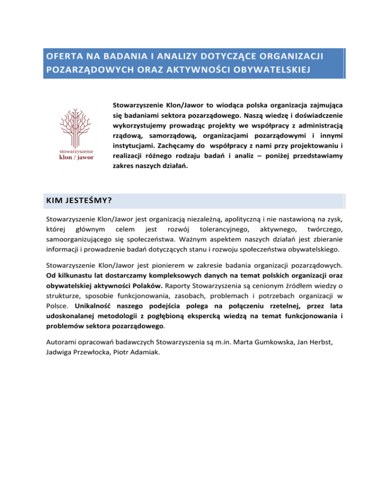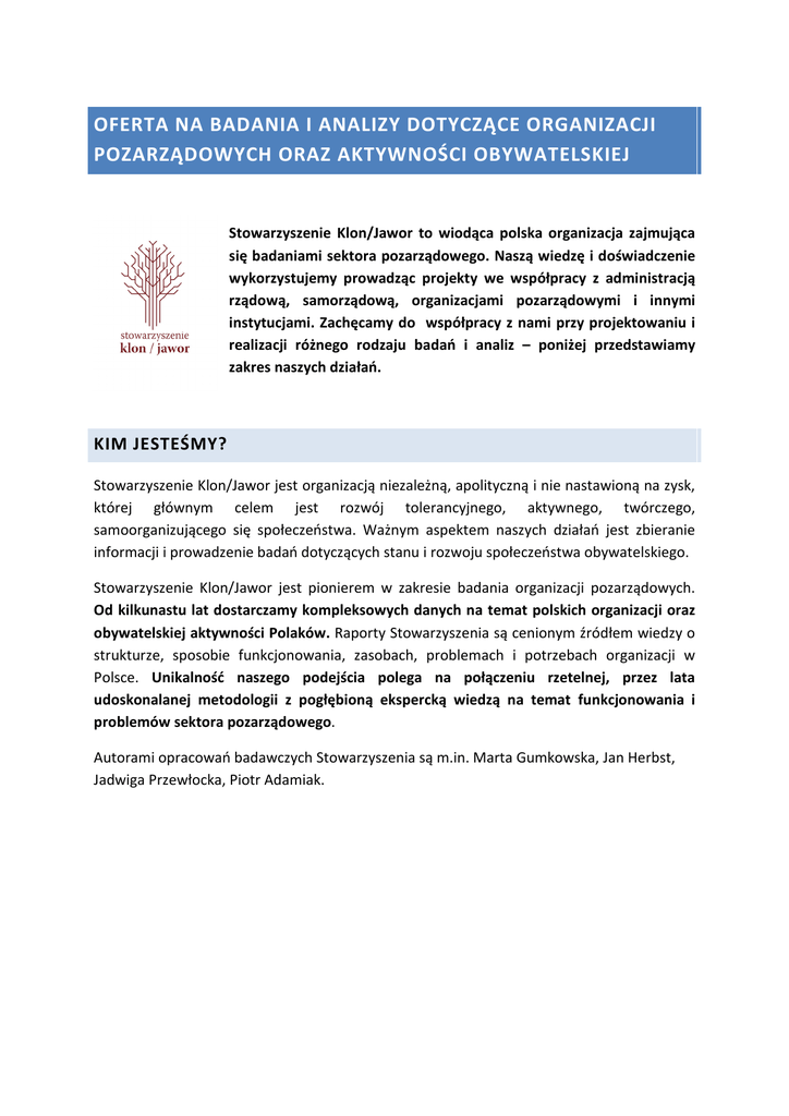 OFERTA NA BADANIA I ANALIZY DOTYCZĄCE ORGANIZACJI POZARZĄDOWYCH ORAZ AKTYWNOŚCI OBYWATELSKIEJ Stowarzyszenie Klon/Jawor to wiodąca polska organizacja zajmująca się badaniami sektora pozarządowego. Naszą wiedzę i doświadczenie wykorzystujemy prowadząc projekty we współpracy z administracją rządową, samorządową, organizacjami pozarządowymi i innymi instytucjami. Zachęcamy do współpracy z nami przy projektowaniu i realizacji różnego rodzaju badań i analiz – poniżej przedstawiamy zakres naszych działań. KIM JESTEŚMY? Stowarzyszenie Klon/Jawor jest organizacją niezależną, apolityczną i nie nastawioną na zysk, której głównym celem jest rozwój tolerancyjnego, aktywnego, twórczego, samoorganizującego się społeczeństwa. Ważnym aspektem naszych działań jest zbieranie informacji i prowadzenie badań dotyczących stanu i rozwoju społeczeństwa obywatelskiego. Stowarzyszenie Klon/Jawor jest pionierem w zakresie badania organizacji pozarządowych. Od kilkunastu lat dostarczamy kompleksowych danych na temat polskich organizacji oraz obywatelskiej aktywności Polaków. Raporty Stowarzyszenia są cenionym źródłem wiedzy o strukturze, sposobie funkcjonowania, zasobach, problemach i potrzebach organizacji w Polsce. Unikalność naszego podejścia polega na połączeniu rzetelnej, przez lata udoskonalanej metodologii z pogłębioną ekspercką wiedzą na temat funkcjonowania i problemów sektora pozarządowego. Autorami opracowań badawczych Stowarzyszenia są m.in. Marta Gumkowska, Jan Herbst, Jadwiga Przewłocka, Piotr Adamiak. JAKIMI ZAGADNIENIAMI SIĘ ZAJMUJEMY? Mamy doświadczenie w prowadzeniu różnorodnych badań i analiz związanych z trzecim sektorem oraz aktywnością obywatelską. 1. RAPORTY DOTYCZĄCE STANU SEKTORA POZARZĄDOWEGO I WYBRANYCH GRUP ORGANIZACJI POZARZĄDOWYCH Od 2002 roku prowadzimy cykliczne ogólnopolskie badania sektora pozarządowego w Polsce. Realizujemy też badania organizacji z wybranego terytorium (województwa, miasta) lub zajmujących się określoną dziedziną (np. kulturą, sportem). W naszym dorobku znajdują się m.in. liczne publikacje omawiające kondycję polskiego sektora organizacji pozarządowych, raporty dotyczące organizacji działających w Warszawie, a także pogłębione opracowania na temat fundacji korporacyjnych czy organizacji aktywnych na polu kultury. 2. RAPORTY DOTYCZĄCE STANU WSPÓŁPRACY POZARZĄDOWYM A SEKTOREM PUBLICZNYM MIĘDZY SEKTOREM Przygotowujemy raporty dotyczące współpracy organizacji z administracją publiczną. Publikowaliśmy zarówno opracowania dotyczące współpracy z samorządem terytorialnym oparte na pierwszych w Polsce, autorskich badaniach współpracy międzysektorowej („Barometr współpracy”), jak również raporty omawiające szerszą tematykę obejmującą współpracę z administracją centralną, oparte na badaniach prowadzonych w partnerstwie z Ministerstwem Pracy i Polityki Społecznej. W naszym dorobku są też publikacje dotyczące relacji pomiędzy organizacjami pozarządowymi a instytucjami publicznymi takimi jak domy kultury czy biblioteki. 3. RAPORTY DOTYCZĄCE ZAANGAŻOWANIA POLAKÓW W DZIAŁANIA TRZECIEGO SEKTORA ORAZ WIZERUNKU ORGANIZACJI W SPOŁECZEŃSTWIE Prowadzimy projekty badawcze dotyczące różnych aspektów relacji między Polakami a sektorem pozarządowym, badając m.in. znajomość organizacji i ich wizerunek w społeczeństwie, skalę wolontariatu oraz zainteresowanie mechanizmem 1 procenta podatku. Od 2001 roku regularnie publikujemy raporty i opracowania omawiające poziom zaangażowania obywatelskiego w Polsce. CO OFERUJEMY? Na potrzeby instytucji i organizacji przygotowujemy raporty, zestawienia, informacje i ekspertyzy wykorzystując do tego różnego rodzaju dane oraz specjalnie przeprowadzając badania skrojone na potrzeby zamawiającego. Poniżej szczegółowo opisujemy naszą ofertę. 1. BADANIA PROFILOWANE POD KĄTEM POTRZEB PARTNERA Aby przygotować raport dotyczący interesującej Państwa tematyki, możemy zaplanować szczegółowe badania. Co konkretnie możemy zaproponować? MOŻEMY ROZBUDOWAĆ CYKLICZNIE PROWADZONE PRZEZ NAS BADANIA Możemy poszerzyć tematykę realizowanych przez nas badań (np. dodając do ankiety nowe pytania), możemy także objąć badaniem dodatkowe grupy, interesujące dla instytucji lub organizacji zamawiającej raport. Jest to możliwe w szczególności w dwóch badaniach cyklicznych: 1. „Kondycja sektora organizacji pozarządowych w Polsce” – badanie realizowane co dwa lata od 2002 roku (najbliższa planowana edycja w 2014 roku). W jego ramach zbierane są pogłębione informacje dotyczące działań, codziennego funkcjonowania, zasobów i potrzeb polskich organizacji. Proponujemy rozbudowę badania, zakładającą: • dodanie do kwestionariusza dodatkowych pytań. Daje to możliwość uzyskania potrzebnych informacji i pozwala na umieszczenie ich w kontekście innych wskaźników zbieranych w badaniu. • objęcie badaniem dodatkowej grupy organizacji, np. pochodzących z określonego regionu, miasta lub prowadzących działania w określonej branży. Daje to możliwość zbadania interesującej grupy (regionalnej, branżowej), a także odniesienia uzyskanych wyników do wskazań ogólnopolskich lub uzyskanych dla innych grup organizacji. 2. „Wolontariat, filantropia, 1%” – badanie realizowane co roku od 2001 roku. Jest to badanie ankietowe prowadzone na próbie ok. tysiąca Polaków, pozwalające na oszacowanie skali zaangażowania społecznego oraz poznanie opinii na temat organizacji i mechanizmu 1 procenta podatku. Proponujemy rozbudowę badania, polegającą na: • dodaniu do kwestionariusza dodatkowych pytań, np. o dotyczących opinii Polaków na temat organizacji (w tym na temat konkretnych fundacji i stowarzyszeń); o dotyczących zainteresowania i motywacji do wspierania finansowego organizacji, udziału w zbiórkach publicznych itp.; o dotyczących wyboru organizacji