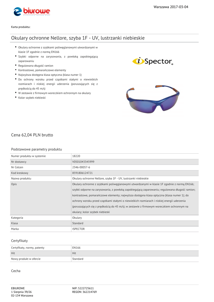 Warszawa 2017-03-04 Karta produktu: Okulary ochronne Nellore, szyba 1F - UV, lustrzanki niebieskie Okulary ochronne z szybkami poliwęglanowymi utwardzanymi w klasie 1F zgodnie z normą EN166 Szybki odporne na zarysowania, z powłoką zapobiegającą zaparowaniu Regulowana długość ramion Kontrastowe, pomarańczowe elementy Najwyższa dostępna klasa optyczna (klasa numer 1) Do ochrony wzroku przed cząstkami stałymi o niewielkich rozmiarach i niskiej energii uderzenia (poruszających się z prędkością do 45 m/s) W zestawie z firmowym woreczkiem ochronnym na okulary Kolor szybek niebieski Cena 62,04 PLN brutto Podstawowe parametry produktu Numer produktu w systemie 18220 Nr dostawcy V0501043345999 Nr Celcen 2346-00057-6 Kod kreskowy 8591806124721 Nazwa produktu Okulary ochronne Nellore, szyba 1F - UV, lustrzanki niebieskie Opis Okulary ochronne z szybkami poliwęglanowymi utwardzanymi w klasie 1F zgodnie z normą EN166; szybki odporne na zarysowania, z powłoką zapobiegającą zaparowaniu; regulowana długość ramion; kontrastowe, pomarańczowe elementy; najwyższa dostępna klasa optyczna (klasa numer 1); do ochrony wzroku przed cząstkami stałymi o niewielkich rozmiarach i niskiej energii uderzenia (poruszających się z prędkością do 45 m/s); w zestawie z firmowym woreczkiem ochronnym na okulary; kolor szybek niebieski Kategoria Okulary Klasa Standard Marka ISPECTOR Certyfikaty Certyfikaty, normy, patenty EN166 Hit Hit Nowy produkt w ofercie Standard Cecha EBIUROWE 1 Sierpnia 39/26 02-134 Warszawa NIP: 5222725611 REGON: 362214769 Warszawa 2017-03-04 Karta katalogowa produktu cd. Okulary ochronne Nellore, szyba 1F - UV, lustrzanki niebieskie W ofercie od 2013-08 Typ Filtr UV Produkt Okulary Rodzaj Standard Wymiary Rozmiar Regulowany Wspólny słownik zamówień CPV 18142000-6 Kolor Kolor Niebieski Pozostałe zdjęcia produktu Serdecznie zapraszamy do współpracy EBIUROWE zespół. EBIUROWE 1 Sierpnia 39/26 02-134 Warszawa NIP: 5222725611 REGON: 362214769