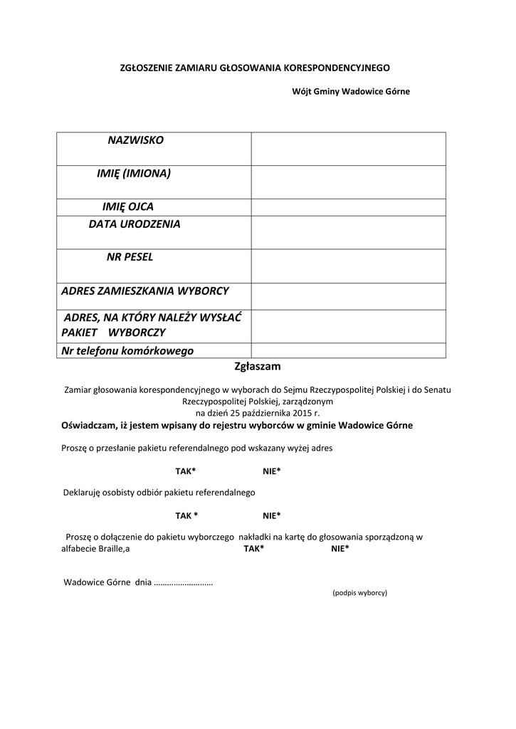 ZGŁOSZENIE ZAMIARU GŁOSOWANIA KORESPONDENCYJNEGO Wójt Gminy Wadowice Górne NAZWISKO IMIĘ (IMIONA) IMIĘ OJCA DATA URODZENIA NR PESEL ADRES ZAMIESZKANIA WYBORCY ADRES, NA KTÓRY NALEŻY WYSŁAĆ PAKIET WYBORCZY Nr telefonu komórkowego Zgłaszam Zamiar głosowania korespondencyjnego w wyborach do Sejmu Rzeczypospolitej Polskiej i do Senatu Rzeczypospolitej Polskiej, zarządzonym na dzień 25 października 2015 r. Oświadczam, iż jestem wpisany do rejestru wyborców w gminie Wadowice Górne Proszę o przesłanie pakietu referendalnego pod wskazany wyżej adres TAK* NIE* Deklaruję osobisty odbiór pakietu referendalnego TAK * NIE* Proszę o dołączenie do pakietu wyborczego nakładki na kartę do głosowania sporządzoną w alfabecie Braille,a TAK* NIE* Wadowice Górne dnia ……………………… (podpis wyborcy)