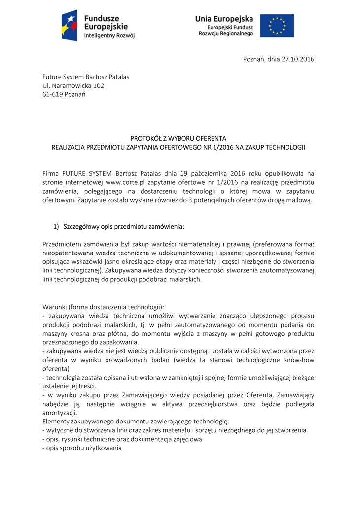 Poznań, dnia 27.10.2016 Future System Bartosz Patalas Ul. Naramowicka 102 61-619 Poznań PROTOKÓŁ Z WYBORU OFERENTA REALIZACJA PRZEDMIOTU ZAPYTANIA OFERTOWEGO NR 1/2016 NA ZAKUP TECHNOLOGII Firma FUTURE SYSTEM Bartosz Patalas dnia 19 października 2016 roku opublikowała na stronie internetowej www.corte.pl zapytanie ofertowe nr 1/2016 na realizację przedmiotu zamówienia, polegającego na dostarczeniu technologii o której mowa w zapytaniu ofertowym. Zapytanie zostało wysłane również do 3 potencjalnych oferentów drogą mailową. 1) Szczegółowy opis przedmiotu zamówienia: Przedmiotem zamówienia był zakup wartości niematerialnej i prawnej (preferowana forma: nieopatentowana wiedza techniczna w udokumentowanej i spisanej uporządkowanej formie opisująca wskazówki jasno określające etapy oraz materiały i części niezbędne do stworzenia linii technologicznej). Zakupywana wiedza dotyczy konieczności stworzenia zautomatyzowanej linii technologicznej do produkcji podobrazi malarskich. Warunki (forma dostarczenia technologii): - zakupywana wiedza techniczna umożliwi wytwarzanie znacząco ulepszonego procesu produkcji podobrazi malarskich, tj. w pełni zautomatyzowanego od momentu podania do maszyny krosna oraz płótna, do momentu wyjścia z maszyny w pełni gotowego produktu przeznaczonego do zapakowania. - zakupywana wiedza nie jest wiedzą publicznie dostępną i została w całości wytworzona przez oferenta w wyniku prowadzonych badań (wiedza ta stanowi technologiczne know-how oferenta) - technologia została opisana i utrwalona w zamkniętej i spójnej formie umożliwiającej bieżące ustalenie jej treści. - w wyniku zakupu przez Zamawiającego wiedzy posiadanej przez Oferenta, Zamawiający nabędzie ją, następnie wciągnie w aktywa przedsiębiorstwa oraz będzie podlegała amortyzacji. Elementy zakupywanego dokumentu zawierającego technologię: - wytyczne do stworzenia linii oraz zakres materiału i sprzętu niezbędnego do jej stworzenia - opis, rysunki techniczne oraz dokumentacja zdjęciowa - opis sposobu użytkowania Obligatoryjnie dostawca technologii musiał udostępnić Zamawiającemu minimum serwis telefoniczny w postaci określonej ilości godzin wsparcia w czasie realizacji wdrożenia technologii. 2) Przebieg procesu wyboru wykonawcy Sposób upublicznienia zapytania ofertowego: W dniu 19.10.2016 r. Zamawiający opublikował postępowanie ofertowe na stronie internetowej www.corte.pl oraz wysłał mailowe zapytania z prośbą o przedstawienie oferty do trzech potencjalnych oferentów. Termin składania ofert upłynął dnia 26.10.2016 roku. 3) Złożone oferty: W wyniku opublikowanego postępowania do Zamawiającego wpłynęła jedna oferta od firmy REJWA SAS DI LUCCHETTI RENATO & C. VIA A. DE GASPERI 38, 22070 APPIANO GENTLE COMO 01858330135 4) Oferty, które nie zostały rozpatrzone ze względów formalnych: W wyniku postępowania wpłynęła jedna oferta, która spełniła kryteria formalne wskazane w zapytaniu ofertowym, w związku z czym została rozpatrzona. 5) Kryteria oceny oraz ich waga punktowa: L.p. 1. 2. 3. Nazwa kryterium Cena Czas realizacji przedmiotu zamówienia Dostępność serwisu Razem Maksymalna liczba punktów/ waga 60 pkt/ 60% 20 pkt/ 20% 20 pkt/ 20% 100 pkt / 100% 1) Cena (wyrażona w EURO lub PLN): maksymalnie 60 pkt. (wyliczana proporcjonalnie: najniższa zaproponowana cena netto/cena netto zaproponowana w badanej ofercie x maksymalna liczba punktów); 2) Czas realizacji zamówienia (wyrażony w liczbie dni): maksymalnie 20 pkt. (wyliczany proporcjonalnie: najkrótszy zaproponowany czas realizacji/czas realizacji zadeklarowany w badanej ofercie x maksymalna liczba punktów). Maksymalny czas realizacji zamówienia: 2 miesiące; 3) Dostępność serwisu (jako deklaracja ilości godzin dodatkowego telefonicznego wsparcia w trakcie budowy linii technologicznej, bazującej na zakupionej technologii): maksymalnie 20 pkt. (wyliczany proporcjonalne: liczba godzin serwisu zadeklarowana w badanej ofercie/ maksymalna wskazana liczba godzin serwisu x maksymalna liczba punktów). 6) Podsumowanie wszystkich złożonych ofert wraz z przyznanymi punktami Kryteria formalne Przyznane punkty 1. REJWA SAS DI LUCCHETTI RENATO & C 26.10.2016 Spełnione 19 000,00 EURO / 82 437,20 PLN 60 14 dni 20 2. - - - - - - - 3. - - - - - - - Dane oferenta Data wpływu oferty 1. REJWA SAS DI LUCCHETTI RENATO & C 2. 3. Lp. Lp. (spełnione/ niespełnione) Kryteria formalne Wartość oferty netto (w PLN/EURO*) Przyznane punkty Dane oferenta Data wpływu oferty (kryt. 1) Czas realizacji (w dniach) (spełnione/ niespełnione) Dostępność serwisu Przyznane punkty (ilość godz.) (kryt. 3) SUMA PUNKTÓW z kryteriów 1 - 3 26.10.2016 Spełnione 40 h 20 100 - - - - - - - - - - - - (kryt. 2) Data otwarcia ofert oraz wyboru najkorzystniejszej: 27.10.2016 * Średni kurs EURO publikowany przez NBP (tabela A) z dnia 27.10.2016 roku: 4,3388 7) Wskazanie wybranego wykonawcy i uzasadnienie wyboru: Do realizacji zamówienia wybrano wykonawcę – firmę REJWA SAS DI LUCCHETTI RENATO & C. Firma ta jako jedyna złożyła ofertę. Oferta została przygotowana poprawnie pod względem formalnym. Cena, termin realizacji, dostępność również są odpowiednie i mieszczą się w limitach narzuconych przez oferenta. Zatem firma REJWA SAS DI LUCCHETTI RENATO & C. została wyłoniona jako wykonawca oraz zaproszona do podpisania umowy. 8) Dodatkowe informacje i uwagi oferenta brak